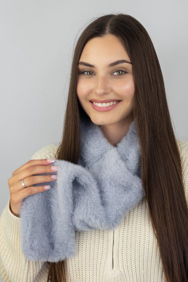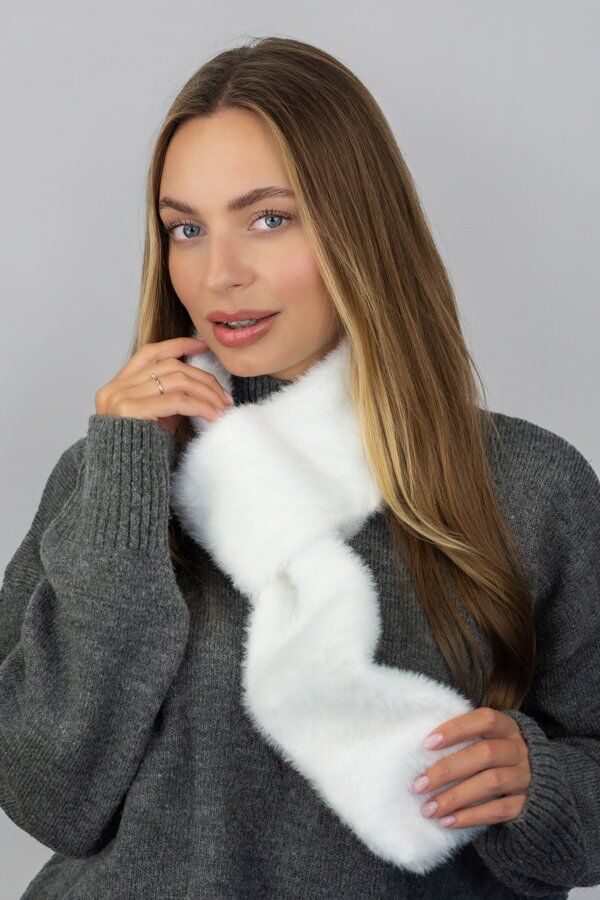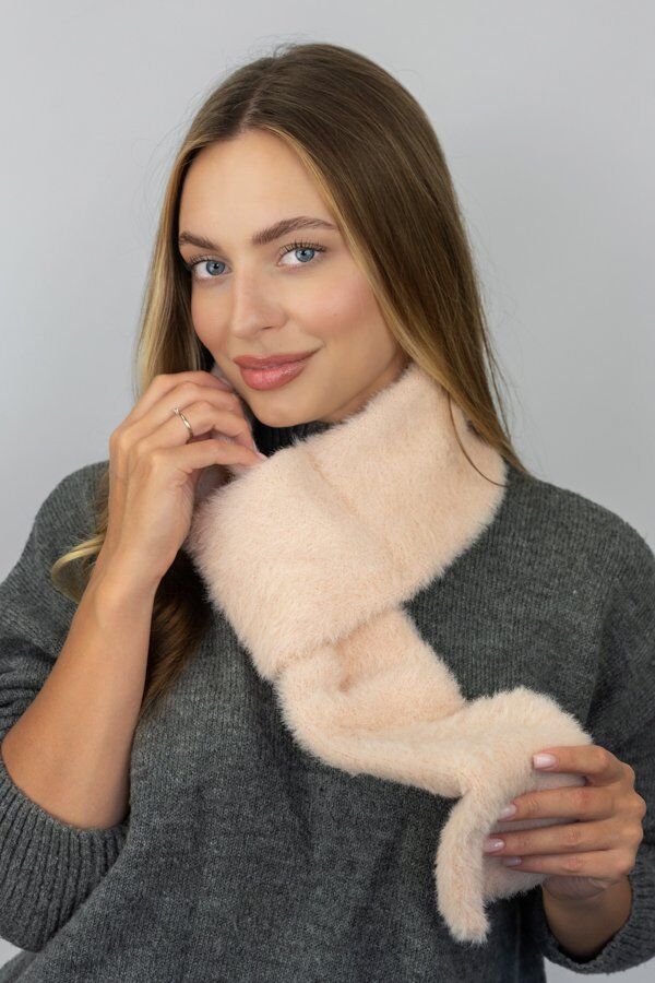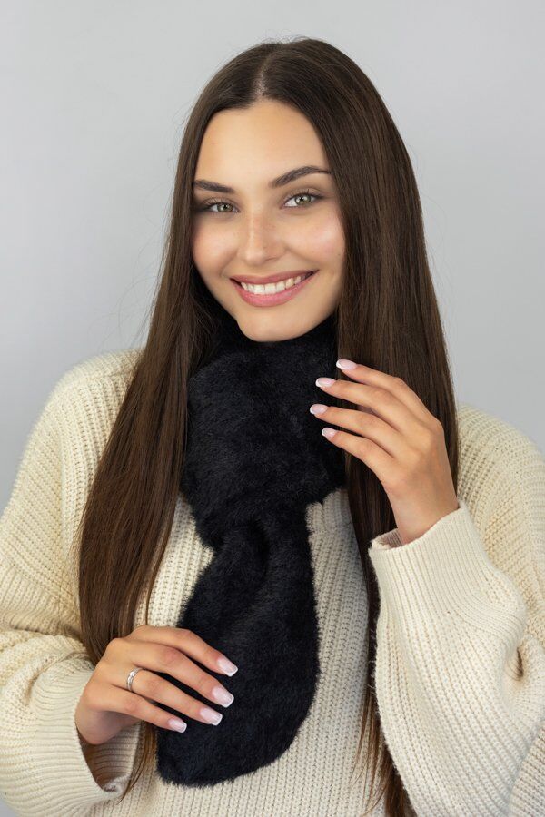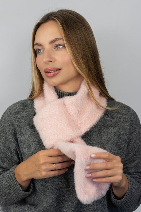 Особенность модели — удобная конструкция без завязывания: один конец шарфа аккуратно подвернут и подшит, образуя петлю, в которую легко продевается другой конец. Такой способ ношения позволяет зафиксировать шарф за секунды, а образ всегда смотрится опрятно и стильно.