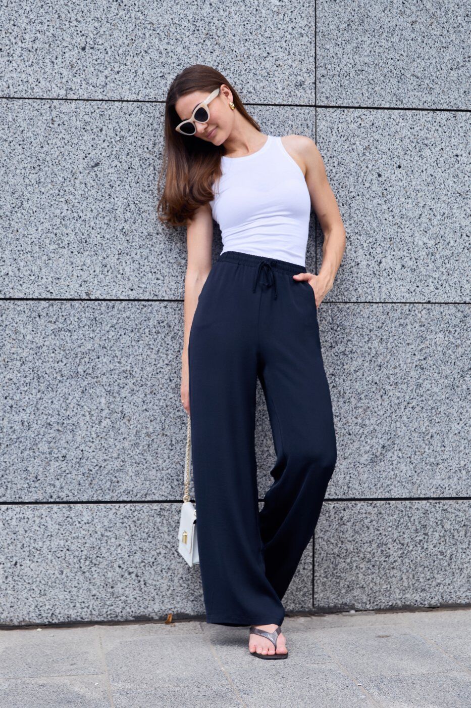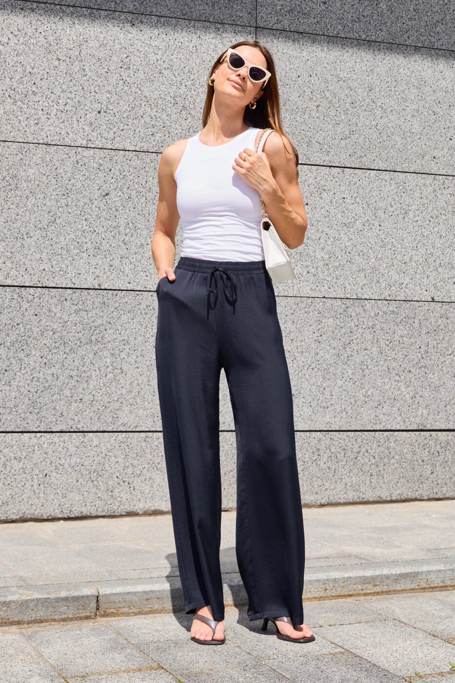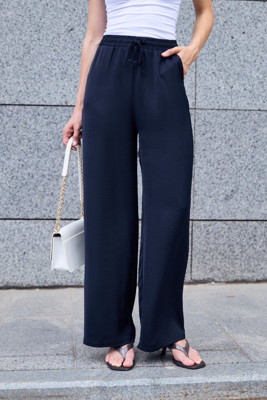 Колір: чорний Розмірний ряд: 42,44,46 Сезон: весна, літо Склад: 50% віскоза, 25% поліестер, 20% котон, 5% лайкра Стиль: святковий, повсякденний Тип виробу: костюм Тип тканини: штучний шовк Широкі брюки з шовку зручно сидять на фігурі завдяки поясу на резинці, доповненому зав’язкою-шнурком. Модель має вільний крій, що забезпечує легкість рухів і комфорт упродовж дня. З боків — функціональні кишені. Тканина м’яка, з легким блиском, приємна на дотик і добре тримає форму. Виміри брюк : Об'єм талії: 42р.-66 см, 44р.-70 см, 46р.-74 см. Об'єм стегон: 42р.- 98 см, 44р.- 102 см, 46р.-106 см. Довжина виробу: 42р.-107 см, 44р.- 107.5 см, 46р.-108 см.Термін збору замовлення складає від 1 до 7 робочих днів. Докладніше