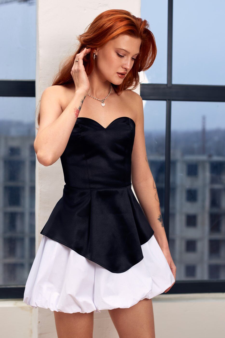 Колір: чорний , білий Розмірний ряд: 42,44,46 Сезон: осінь, зима, весна, літо Склад: 50% віскоза, 25% поліестер, 20% котон, 5% лайкра Стиль: святковий, Тип виробу: сукня Тип тканини: атлас , шовк Сукня складається з атласного корсета зі шнурівкою на спинці та потайною блискавкою збоку, що забезпечує ідеальну посадку по фігурі. Юбка-балон з білого шовку додає моделі об’єму та елегантності. Це стильна та святкова сукня, яка підкреслює витонченість і жіночність образу. Виміри сукні: Обʼєм грудей: 42 розмір 82 см 44 розмір 86 см 46 розмір 90 см Обʼєм таліі : 42 розмір 64 см 44 розмір 68 см 46 розмір 72 см Обʼєм стегон : 42 розмір 110 см 44 розмір 114 см 46 розмір 118 см Довжина полички : 42 розмір 61 см 44 розмір 62 см 46 розмір 63 см Довжина по спині: 42 розмір 59.5 см 44 розмір 56.3 см 46 розмір 57.1 см Довжина спідниці по боковому шву: 42 розмір 39 см 44 розмір 39.5 см 46 розмір 40 смТермін збору замовлення складає від 1 до 7 робочих днів. Докладніше