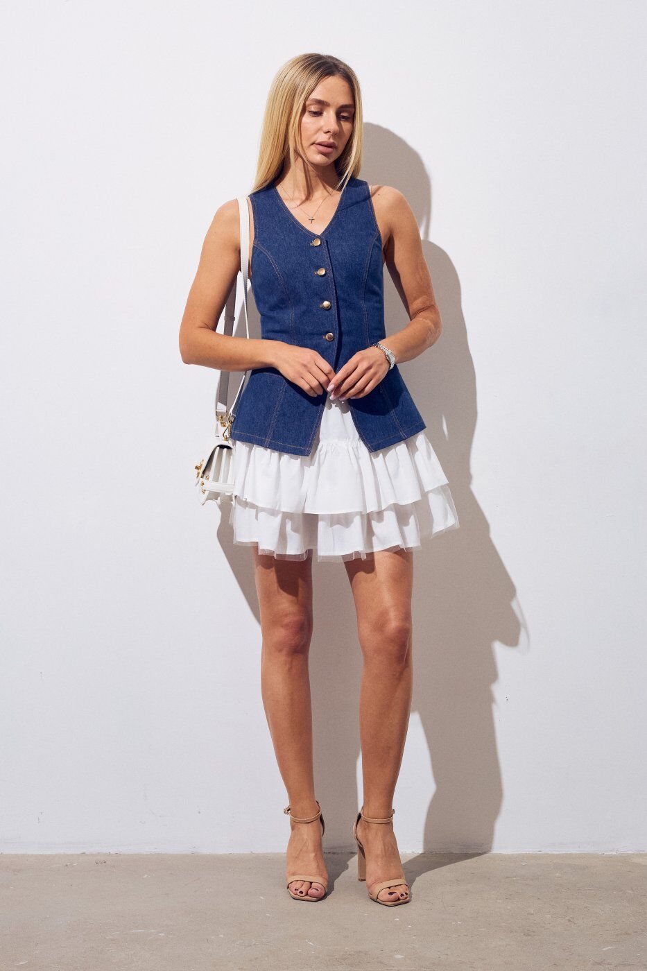 Колір: денім Розмірний ряд: 42,44,46 Сезон: весна, літо Склад: 50% віскоза, 25% поліестер, 20% котон, 5% лайкра Стиль: святковий, повсякденний Тип виробу: сукні Тип тканини: джинс , коттон Джинсове плаття-жилет складається з приталеного верхнього шару з деніму та знімного під’юбника з бавовни. Верх — це джинсовий жилет класичного крою з фігурною лінією низу, контрастною відстрочкою та металевими ґудзиками. Під’юбник виготовлений із легкої бавовняної тканини з м’якими хвилями, що додають об’єму та фактурності силуету. Модель легко трансформується: жилет можна носити окремо або в комплекті з під’юбником. Виміри : Об'єм грудей: 42р.-82 см, 44р.- 86 см, 46р.- 90 см Об'єм талії: 42р.- 69 см, 44р.- 73 см, 46р.-77 см. Об'єм стегон : 42р.- 98 см, 44р.- 102 см, 46р.-106 см. Довжина спинки: 42р.- 62.5 см, 44р .-62.8 см, 46р.- 63.1 см. Довжина полички: 42р.- 62.5 см, 44р.- 63 см, 46р.- 63.5 см. Довжина спідниці : 42р.- 37 см, 44р.- 37.5 см, 46р.- 38 см.Термін збору замовлення складає від 1 до 7 робочих днів. Докладніше