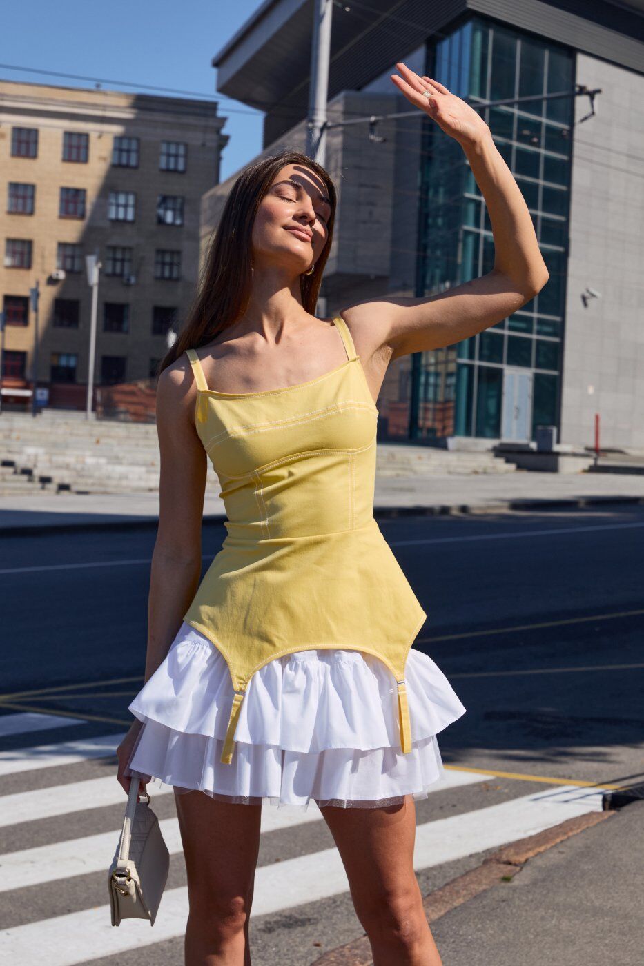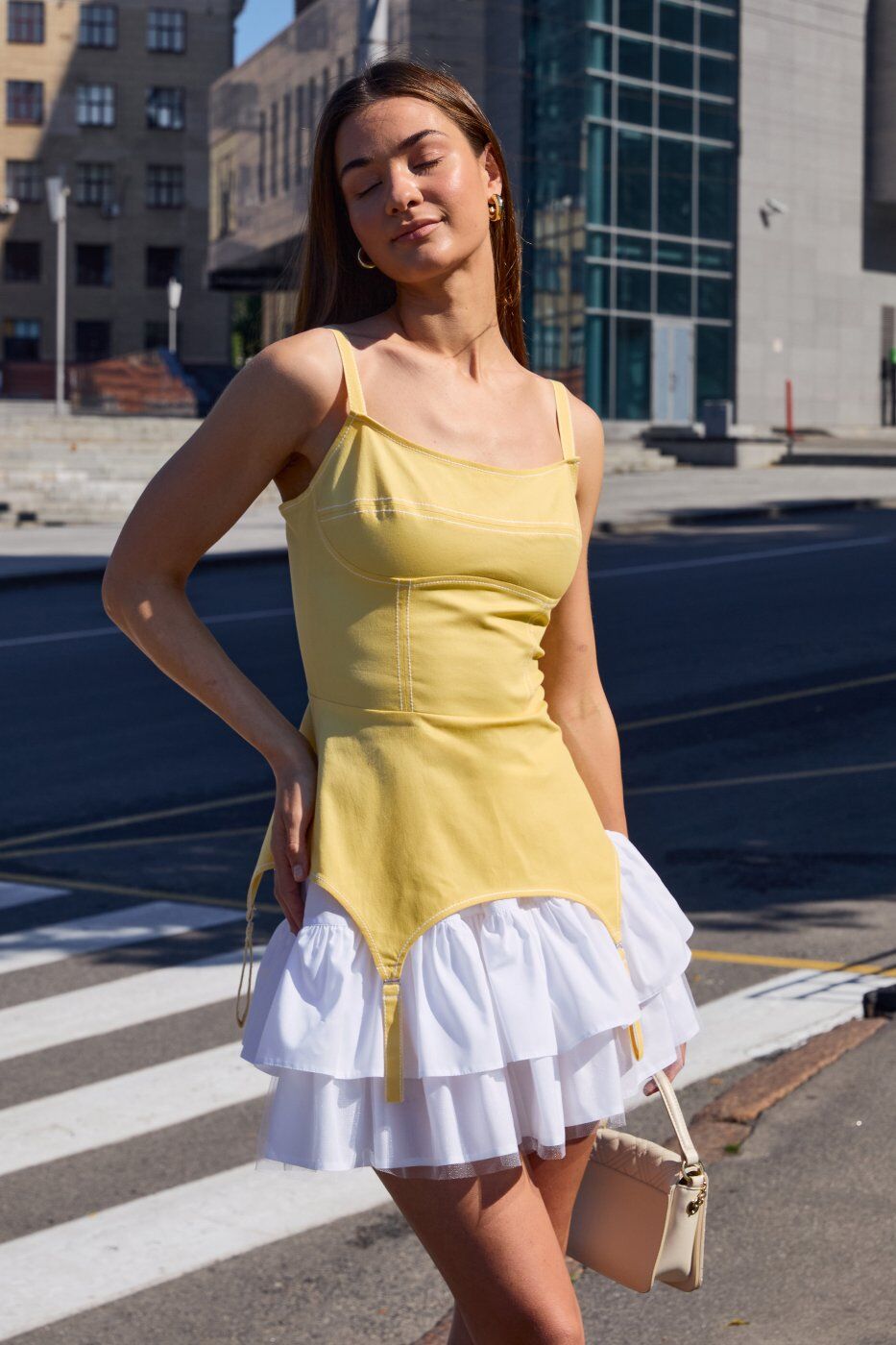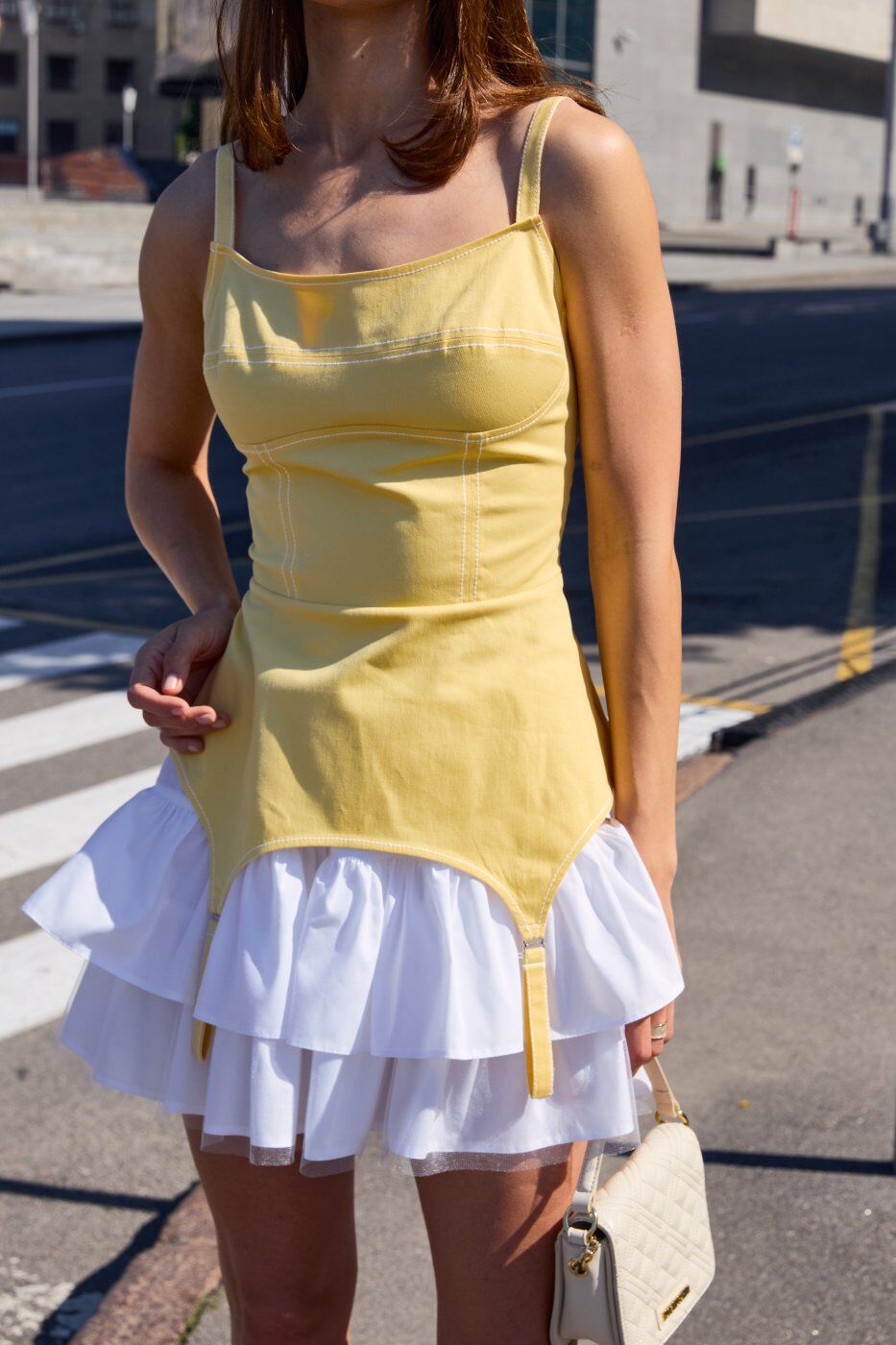 Колір: жовтий Розмірний ряд: 42,44,46 Сезон: весна, літо Склад: 50% віскоза, 25% поліестер, 20% котон, 5% лайкра Стиль: святковий, повсякденний Тип виробу: сукня, сарафан Тип тканини: джинс , коттон Джинсовий сарафан з імітацією панчішних підтяжок на спідниці та імітацією чашок на грудях. У комплекті під’юбник із бавовни з воланами. Застібається на блискавку збоку. На спинці шнурівка для регулювання приталеності, бретелі також регулюються за висотою. Виміри : Об'єм грудей: 42р.-84 см, 44р.- 88 см, 46р.- 92 см Об'єм талії: 42р.- 64 см, 44р.- 68 см, 46р.-72 см. Об'єм стегон : 42р.- 96 см, 44р.- 100 см, 46р.-104 см. Довжина спинки: 42р.- 39.5 см, 44р .-39.8 см, 46р.- 40.1 см. Довжина полички: 42р.- 50 см, 44р.- 50.5 см, 46р.- 51 см. Довжина спідниці : 42р.- 37 см, 44р.- 37.5 см, 46р.- 38 см.Термін збору замовлення складає від 1 до 7 робочих днів. Докладніше