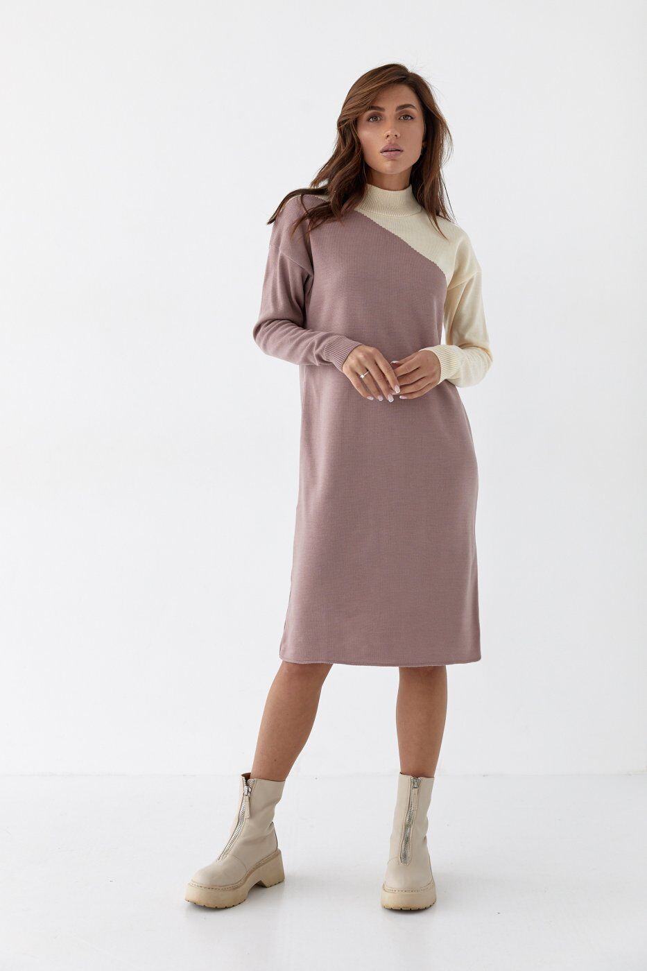 Модное вязаное платье выполнено из качественной пряжи. с манжетами на рукавах, воротник стойка. Будьте в тренде, почувствуйте себя стильной и неотразимой!.