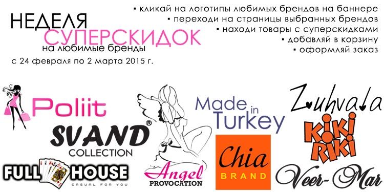 Первый оптовый интернет-супермаркет Chia совместно с торговыми марками Angel Provocation и Zuhvala приняли участие в Международном фестивале моды Kyiv Fashion 2015, который проходил в выставочном центре КиевЭкспоПлаза с 5 по 7 февраля 2015 года. Перейти к галерее