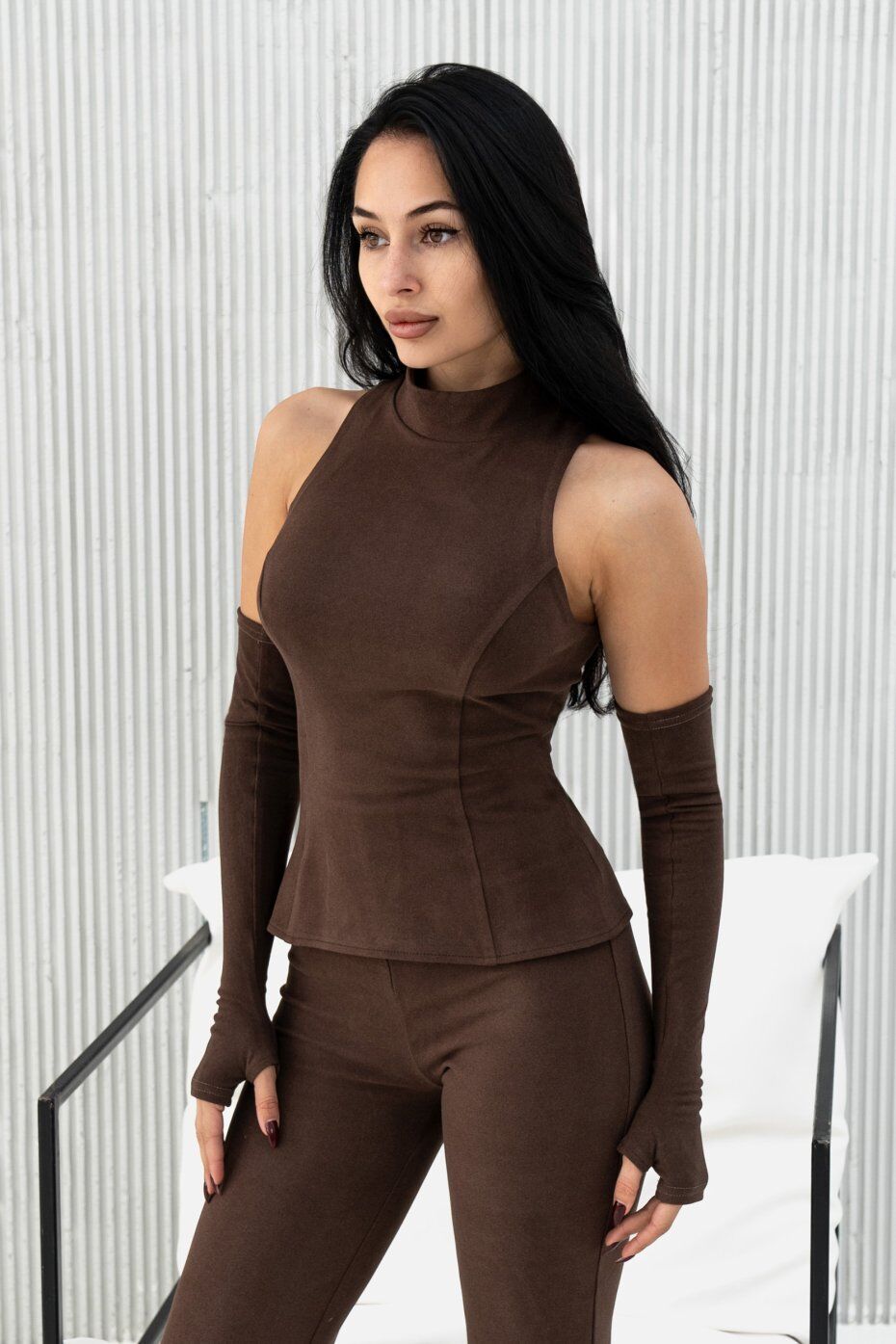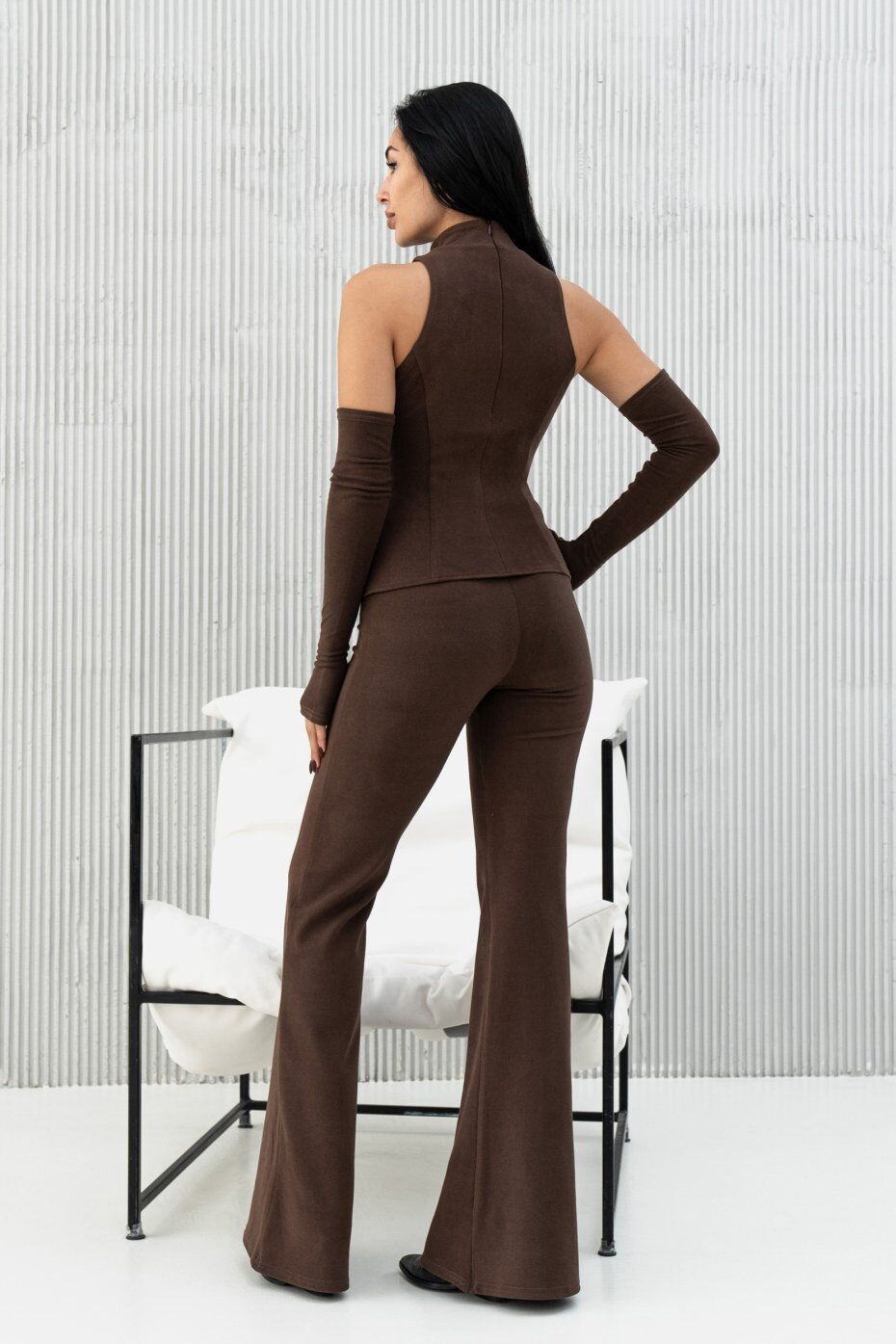 Костюм из теплого приятного трикотажа. Топ с воротником стойкой и американской проймой. Рукава митенки одеваются отдельно. Лосины расклешенные от колена. Длина топа по центру спинки 51 см. Длина брюк по боковому шву 114 см, по шаговому шву 86 см.