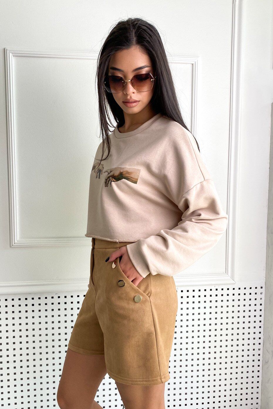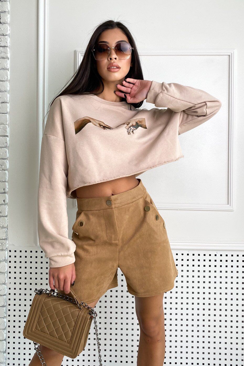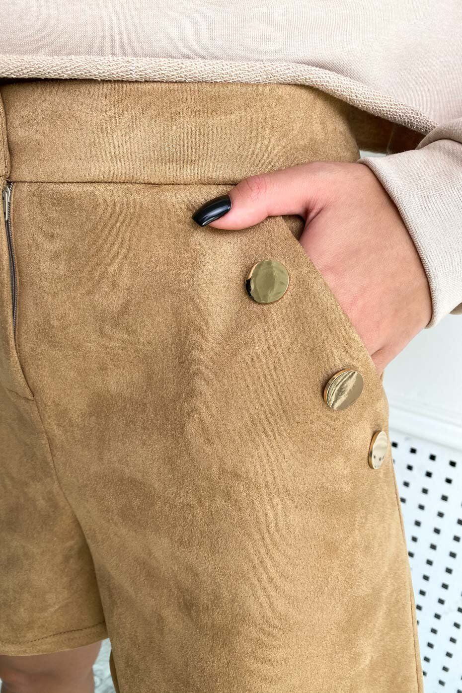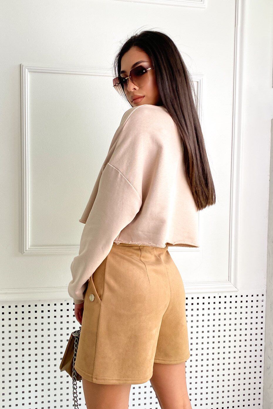 Стильные шорты из замши с высокой посадкой. Имеются декоративные кнопки по входу в карман. Застежка: молния и кнопка. Материал очень приятный к телу.Артикул для відображення на сайті: 1704.4575Колекция: На лайті