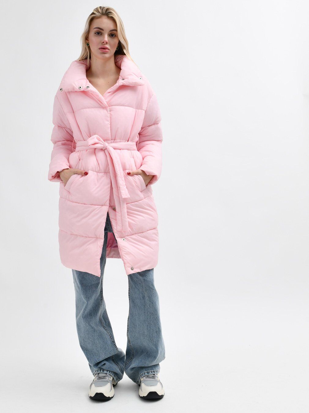 Стьобана куртка-пальто з поясом. Виконана з плащової тканини та утеплена силіконом. Модель має прямий крій та міді довжину. Комір трансформується у відкладний або стійку. З боків кишені на кнопці. Застібка на гудзики по всій довжині.Таблица размеров