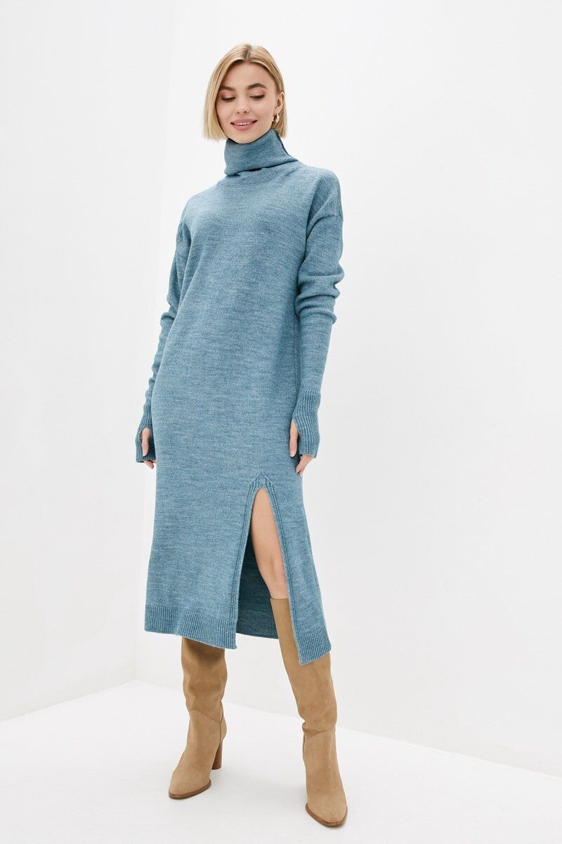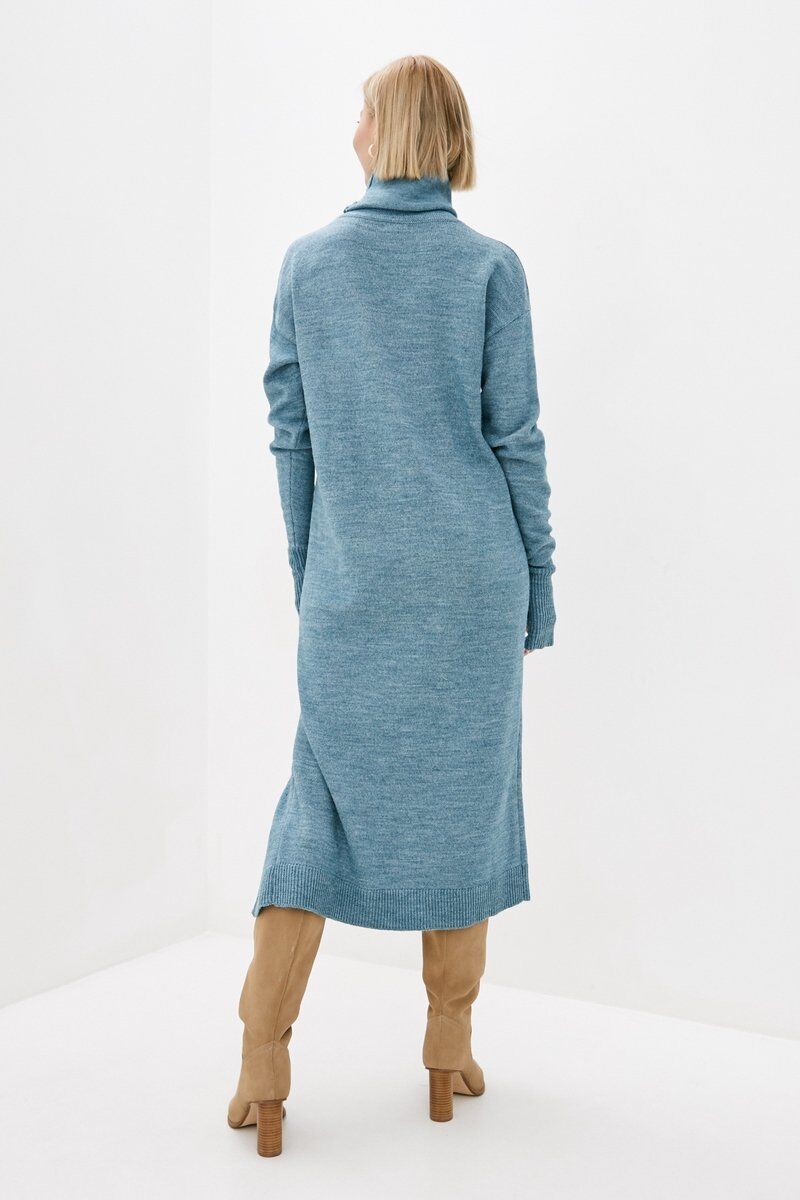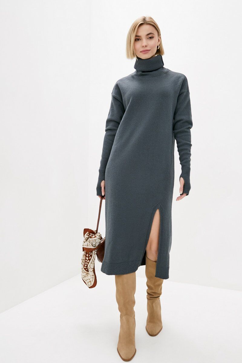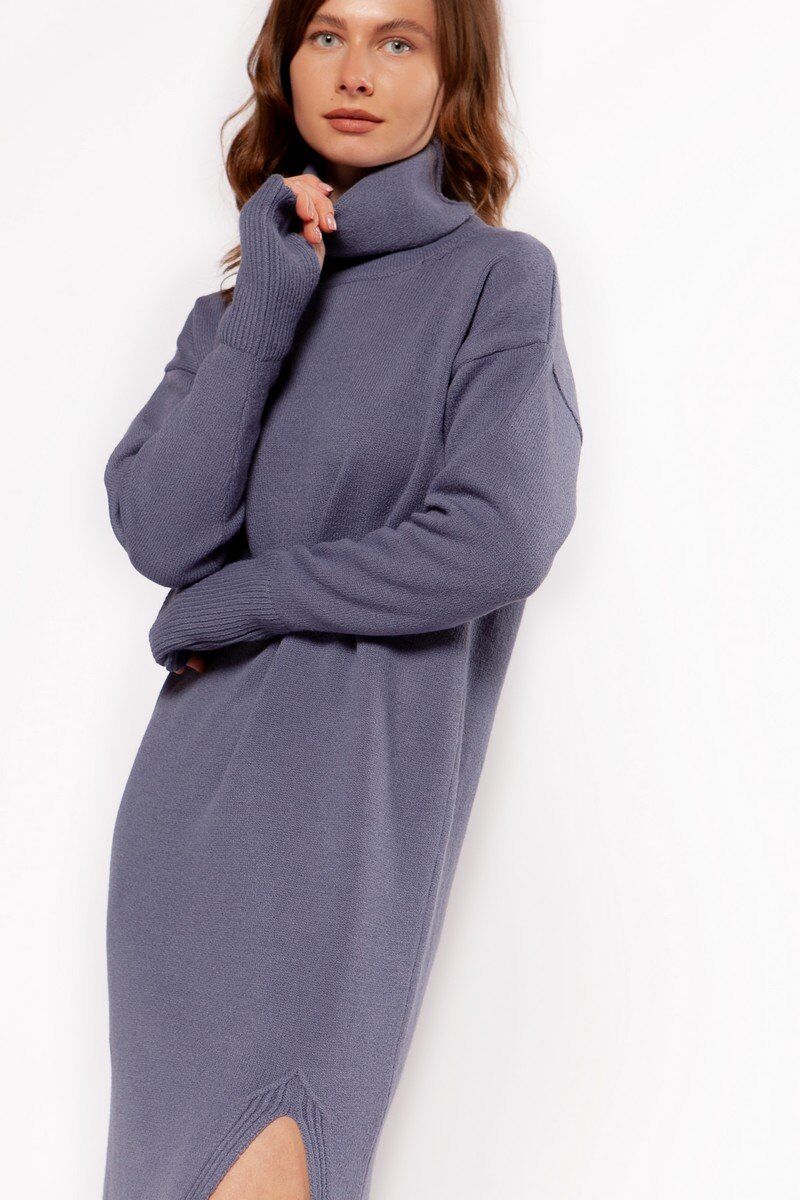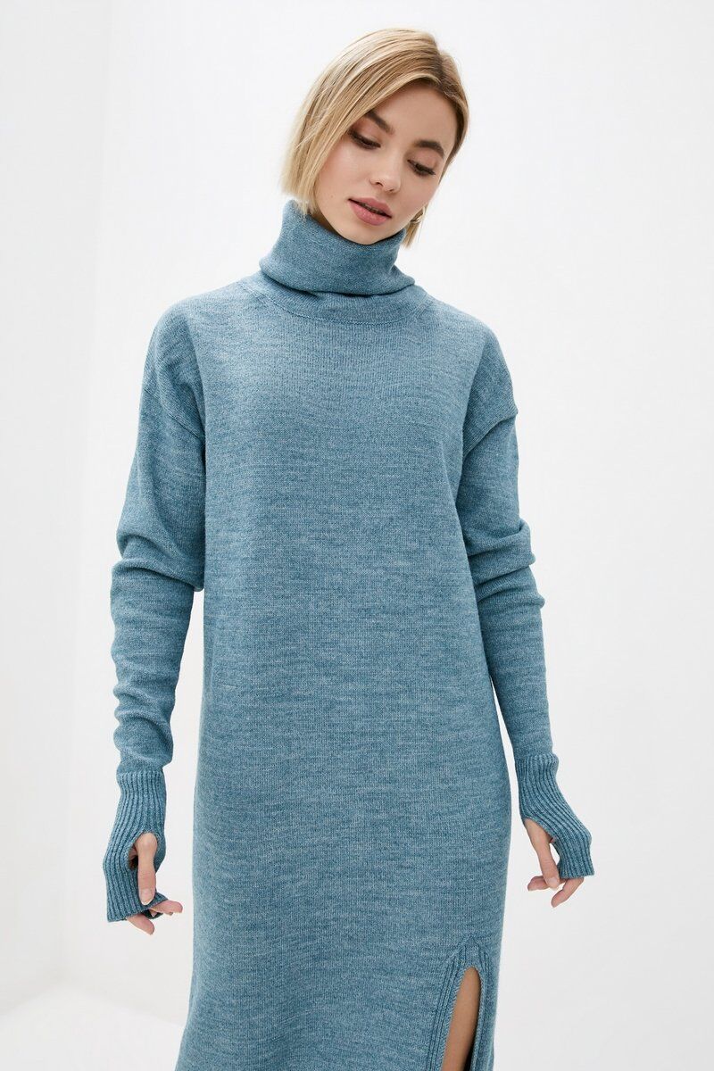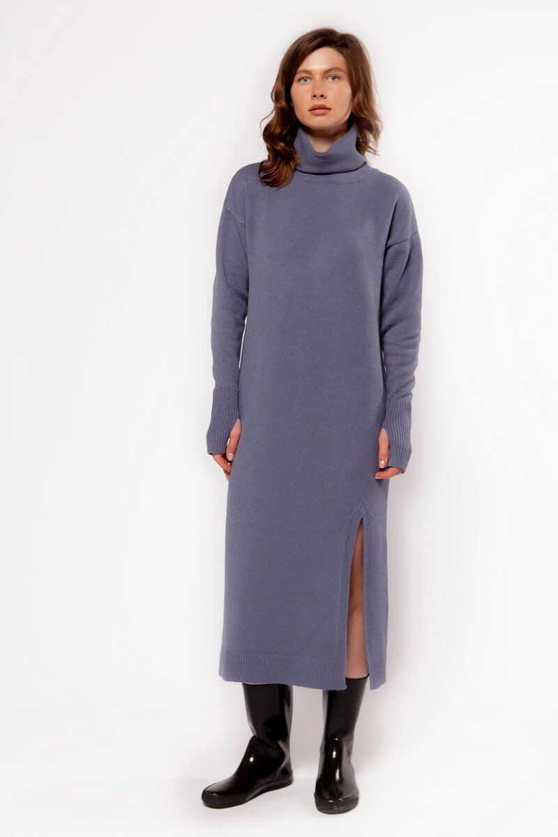 Вязаное платье с воротником-хомутом. Изделие выполнено из мягкой и теплой пряжи. Длинный свободный фасон. Края изделия вывязаны резинкой. Длинные рукава с отверстием для большого пальца. Спереди декоративный разрез.
