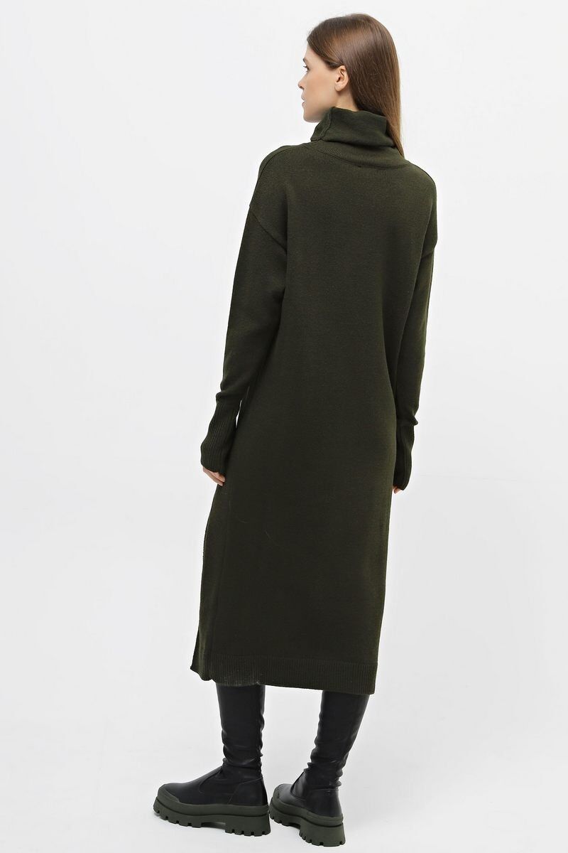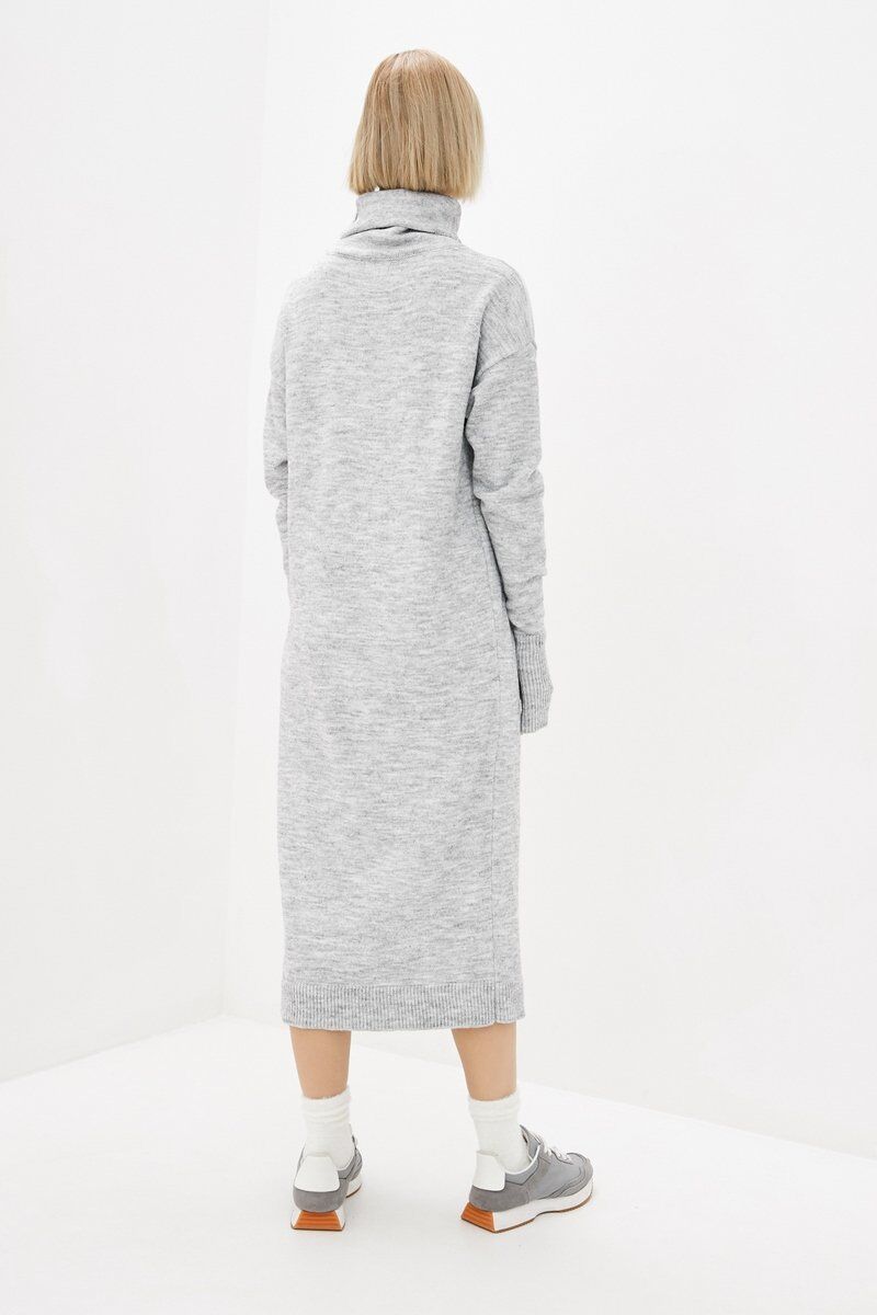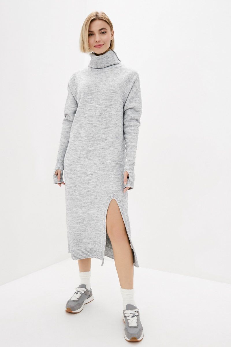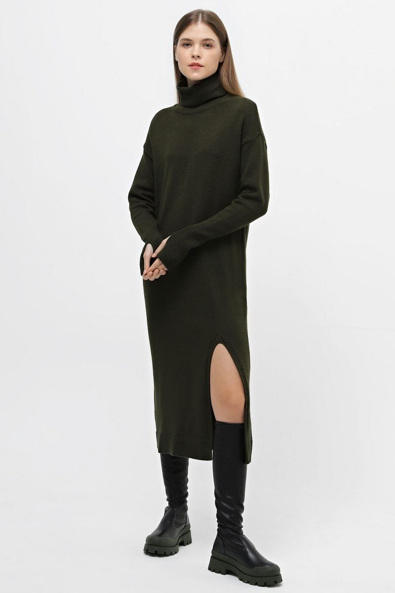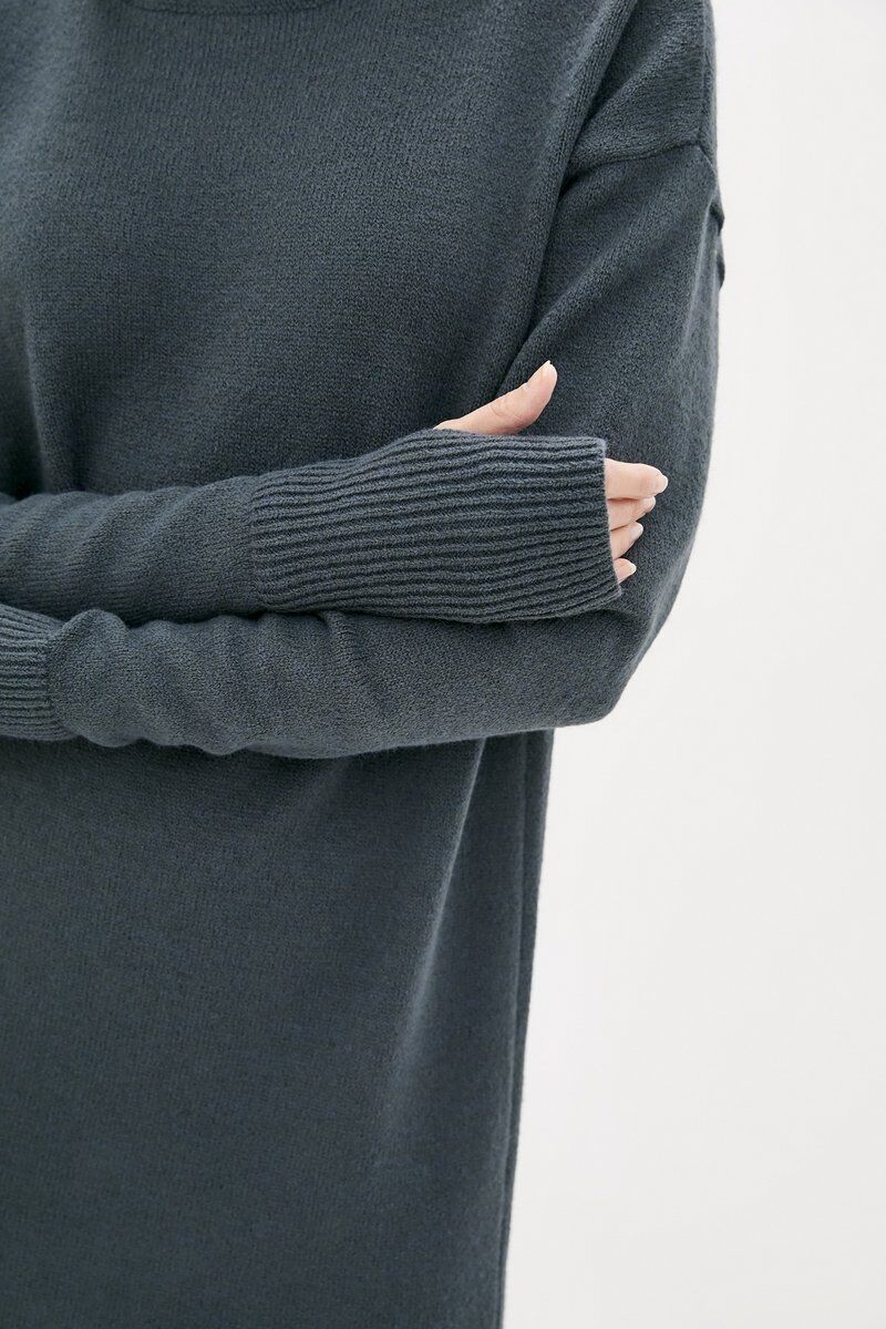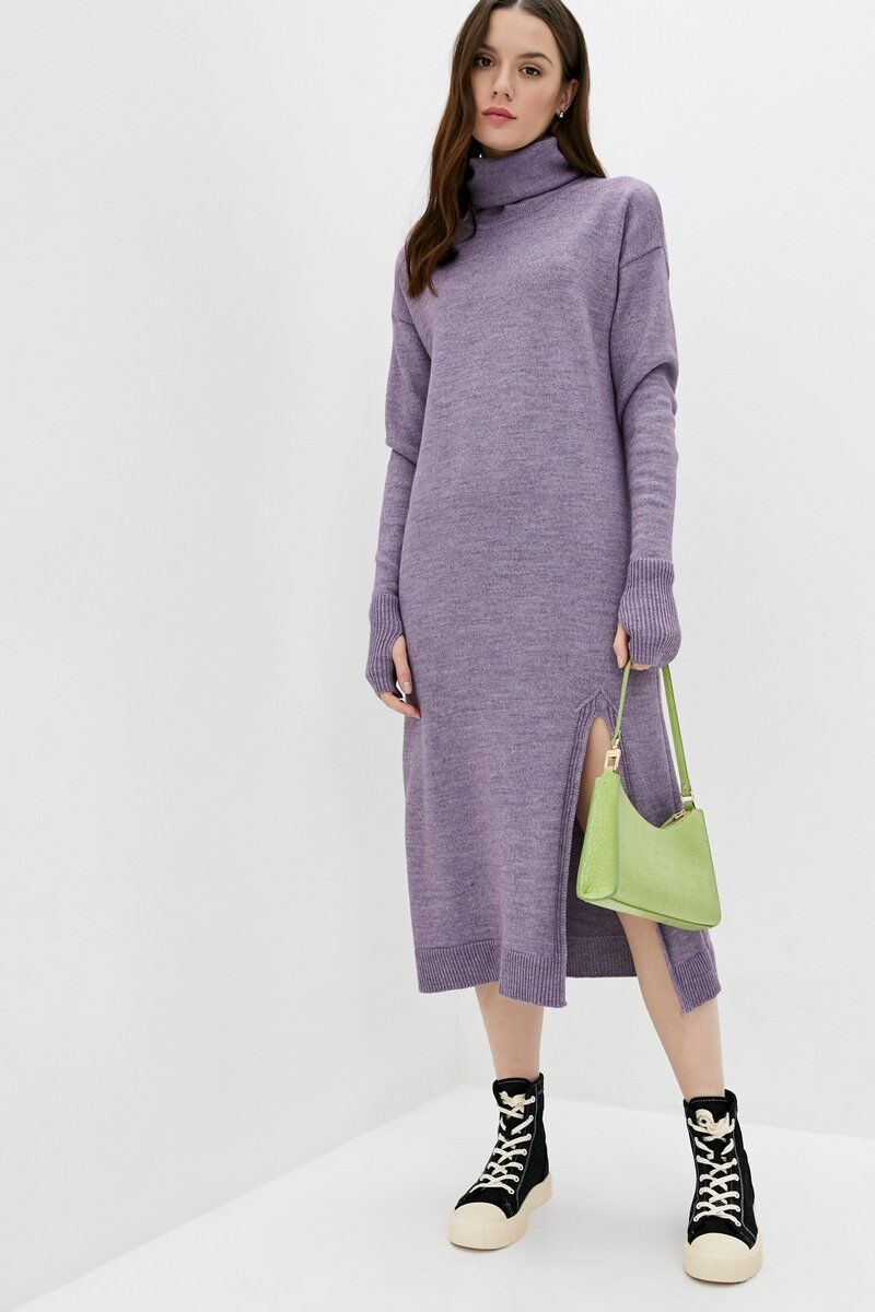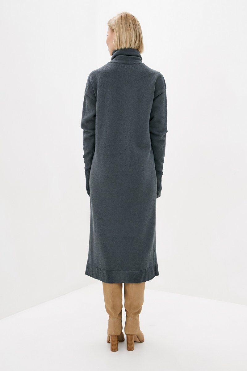 Вязаное платье с воротником-хомутом. Изделие выполнено из мягкой и теплой пряжи. Длинный свободный фасон. Края изделия вывязаны резинкой. Длинные рукава с отверстием для большого пальца. Спереди декоративный разрез.