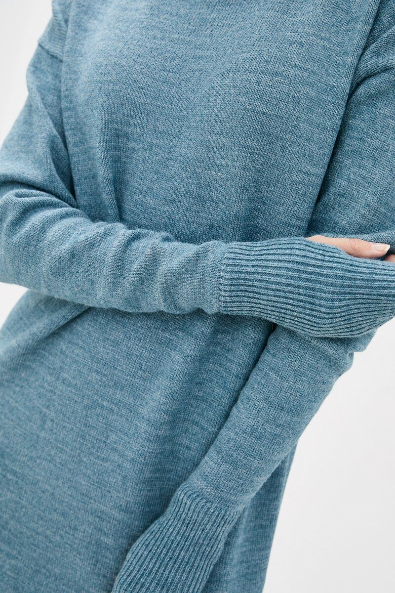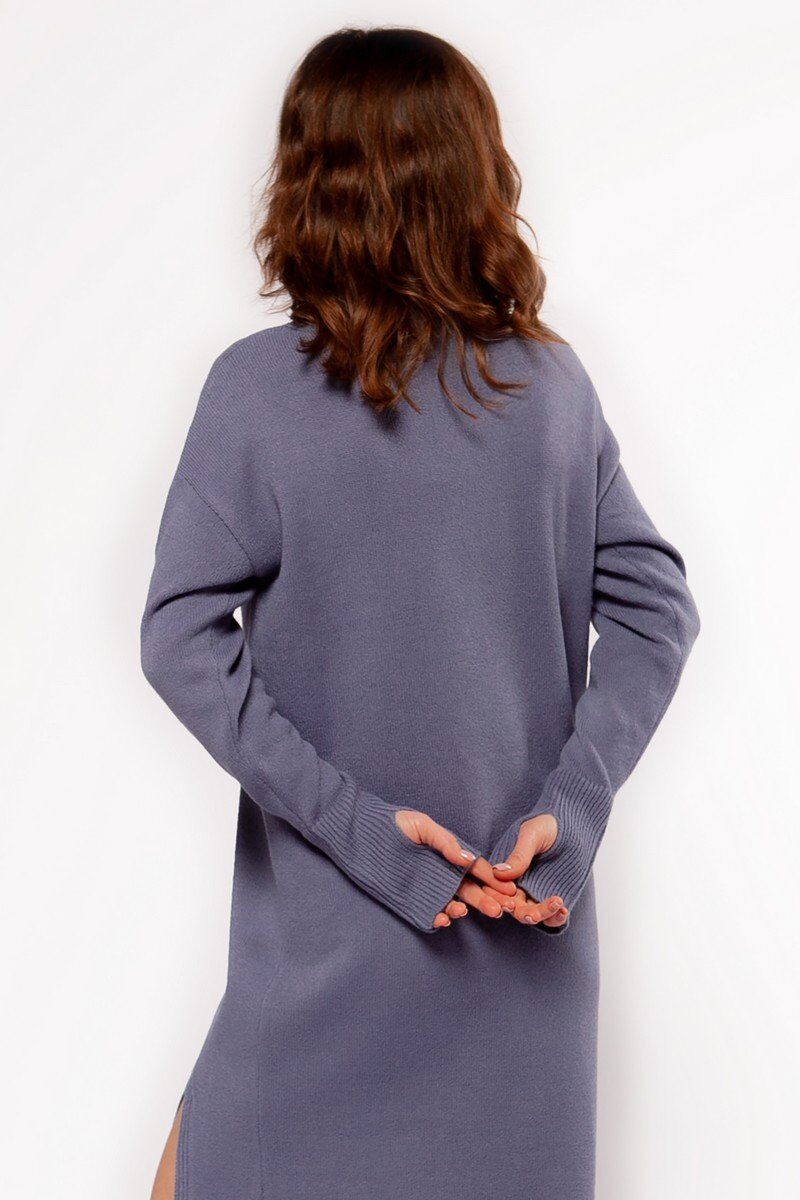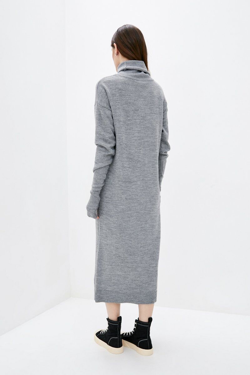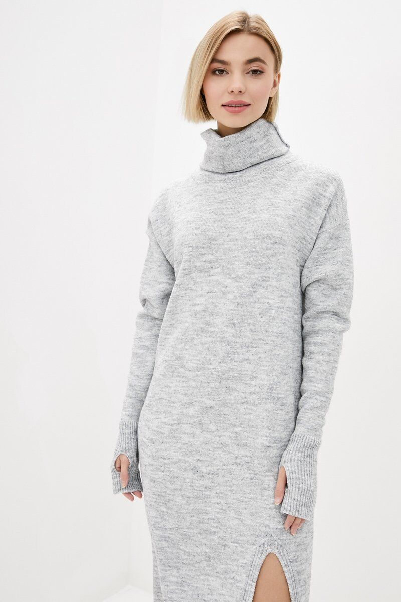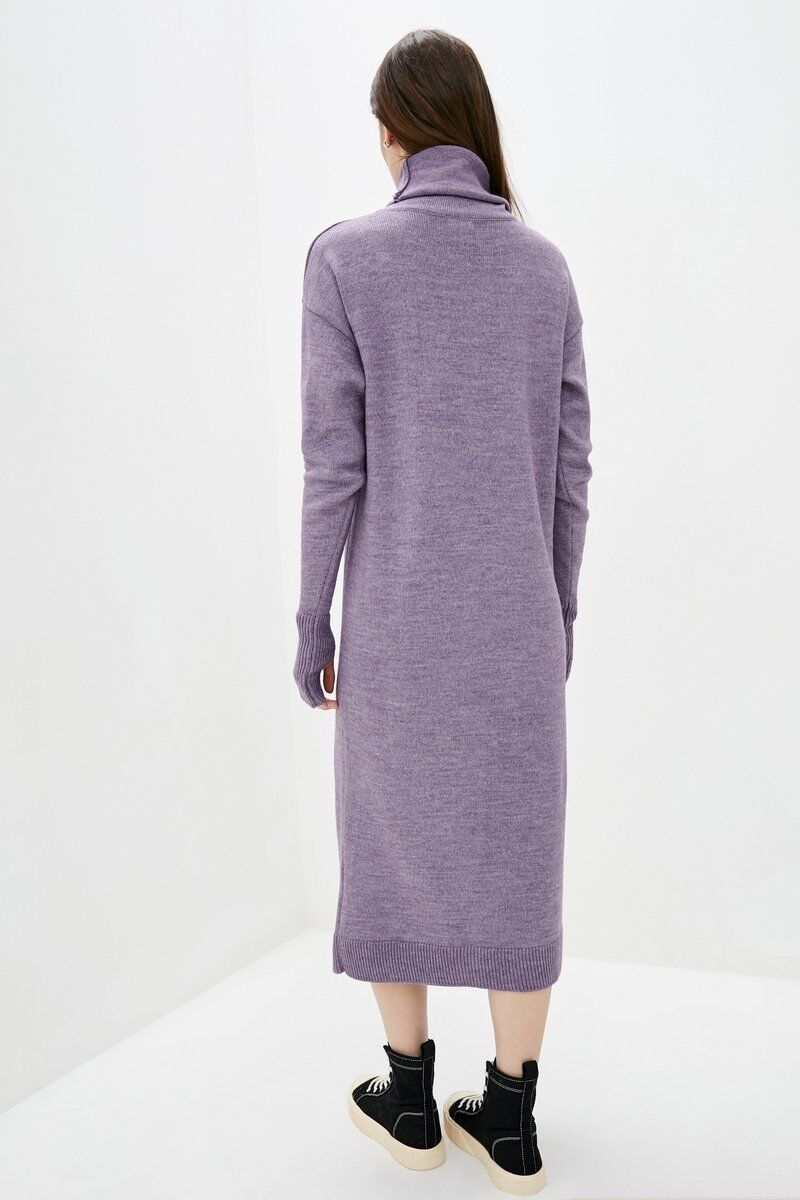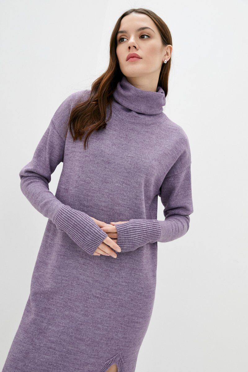 Вязаное платье с воротником-хомутом. Изделие выполнено из мягкой и теплой пряжи. Длинный свободный фасон. Края изделия вывязаны резинкой. Длинные рукава с отверстием для большого пальца. Спереди декоративный разрез.