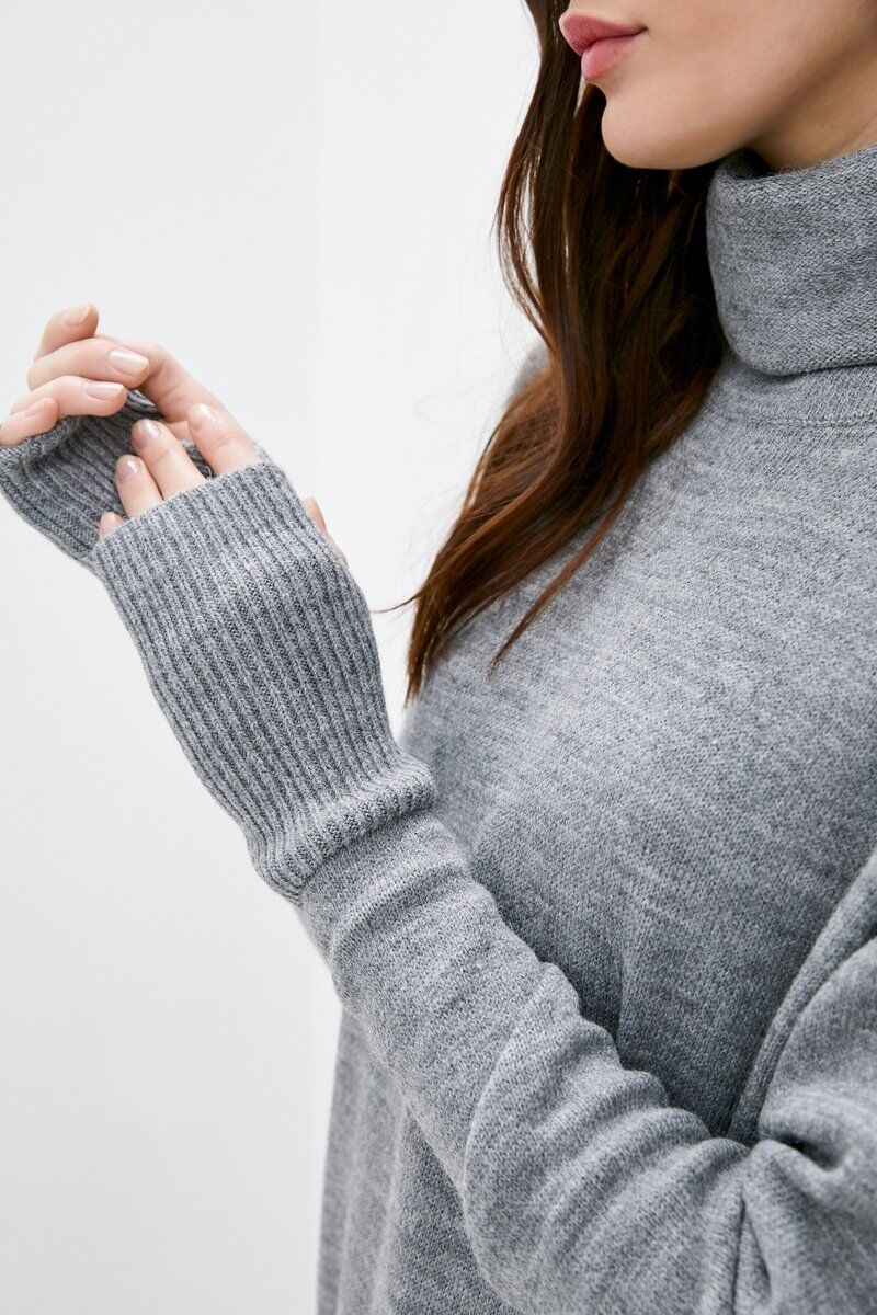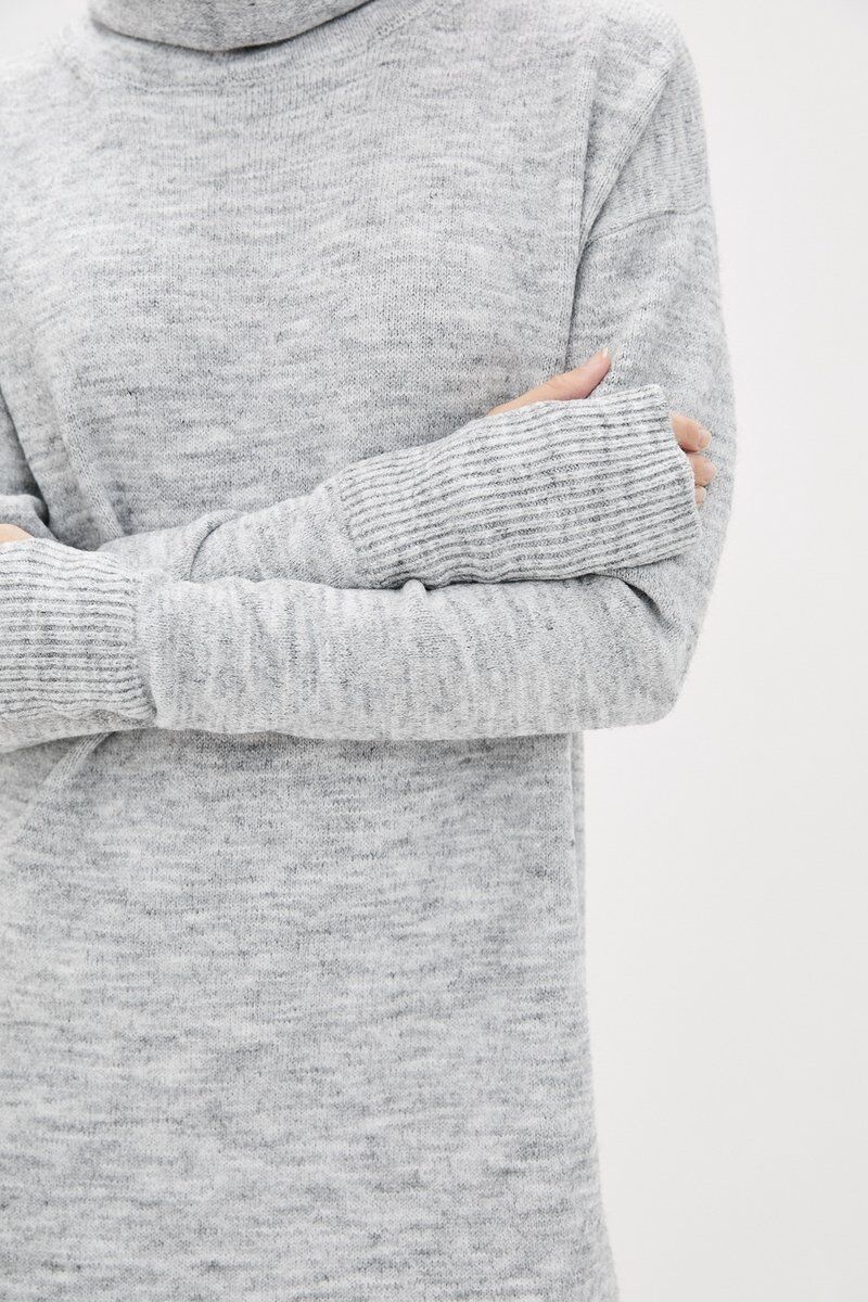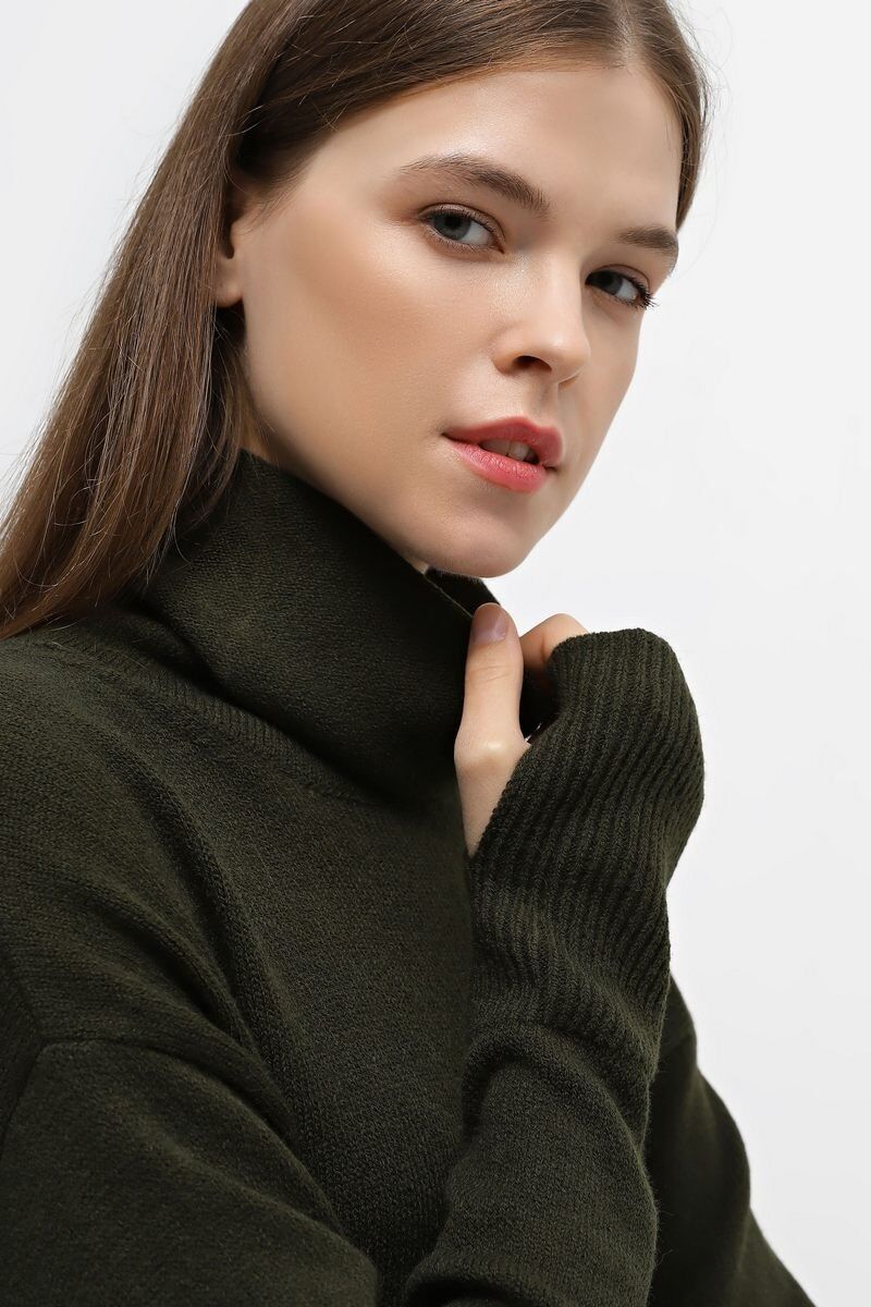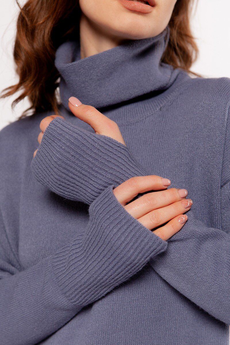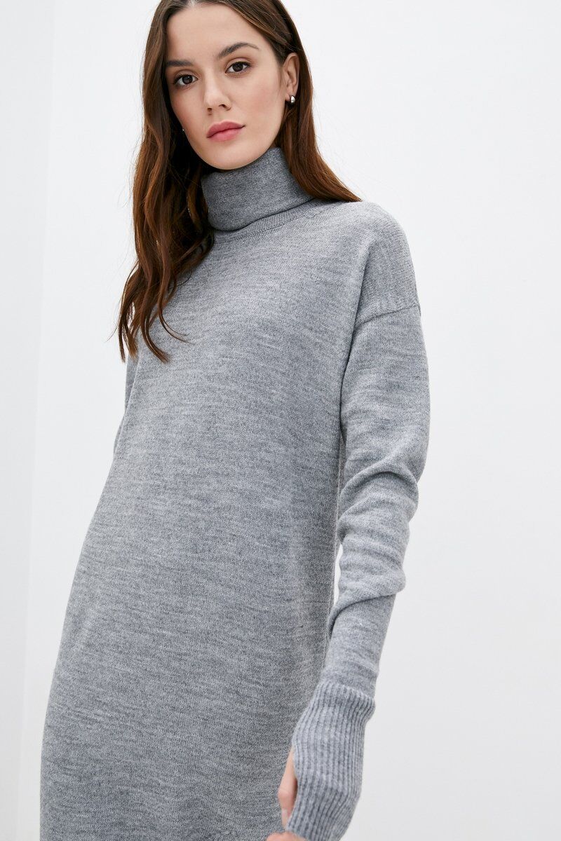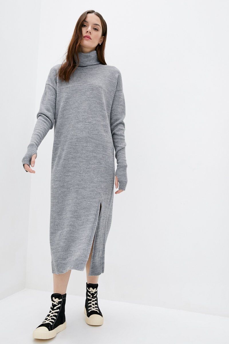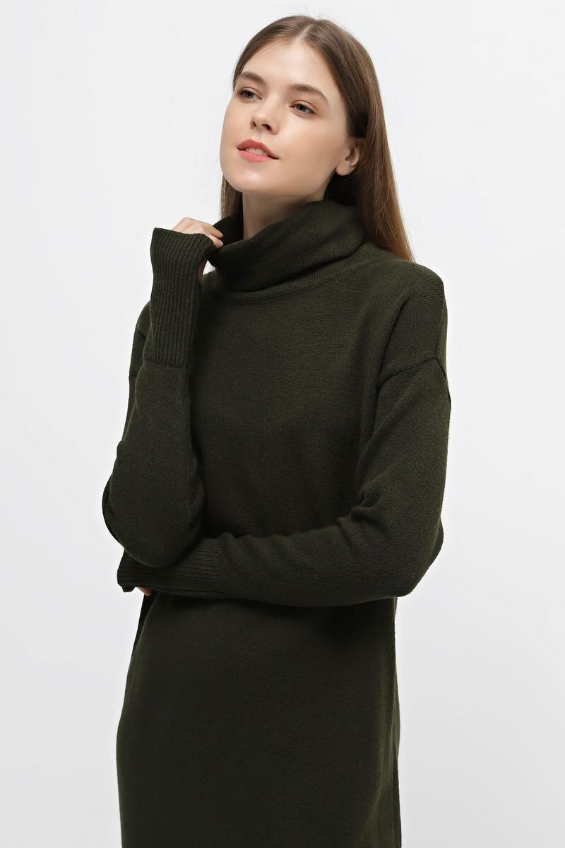 Вязаное платье с воротником-хомутом. Изделие выполнено из мягкой и теплой пряжи. Длинный свободный фасон. Края изделия вывязаны резинкой. Длинные рукава с отверстием для большого пальца. Спереди декоративный разрез.