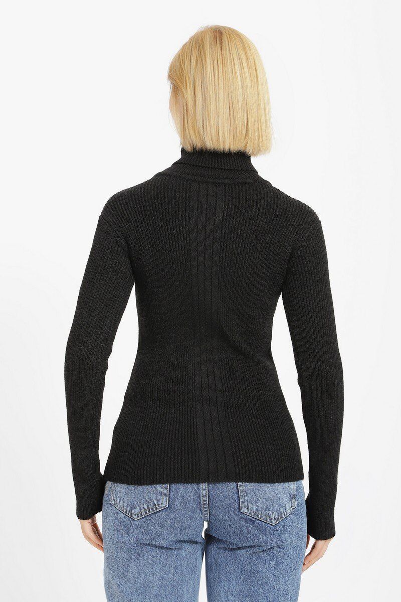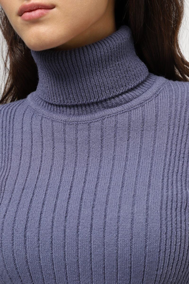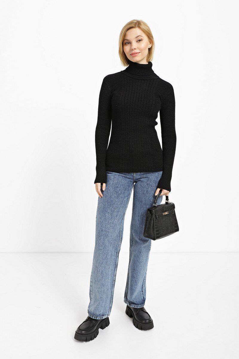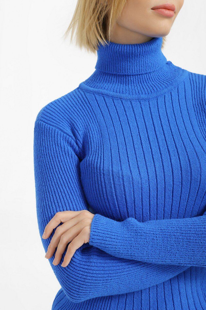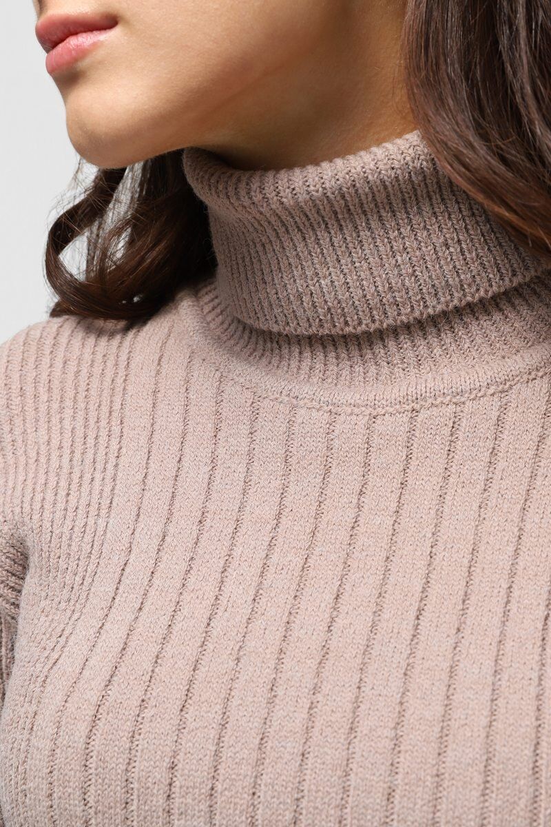 Женский вязаный свитер с высоким горлом. Длинные рукава. Спереди и сзади изделия вывязаны декоративные полосы.