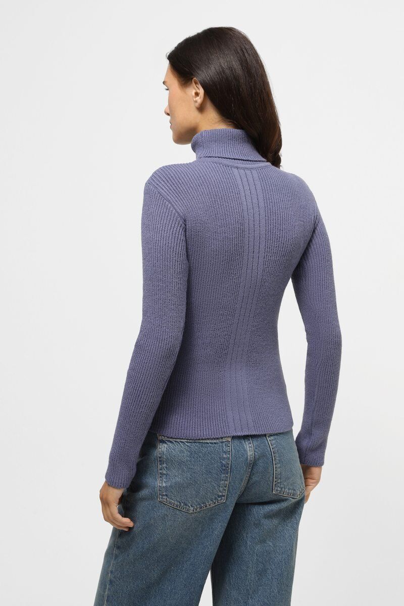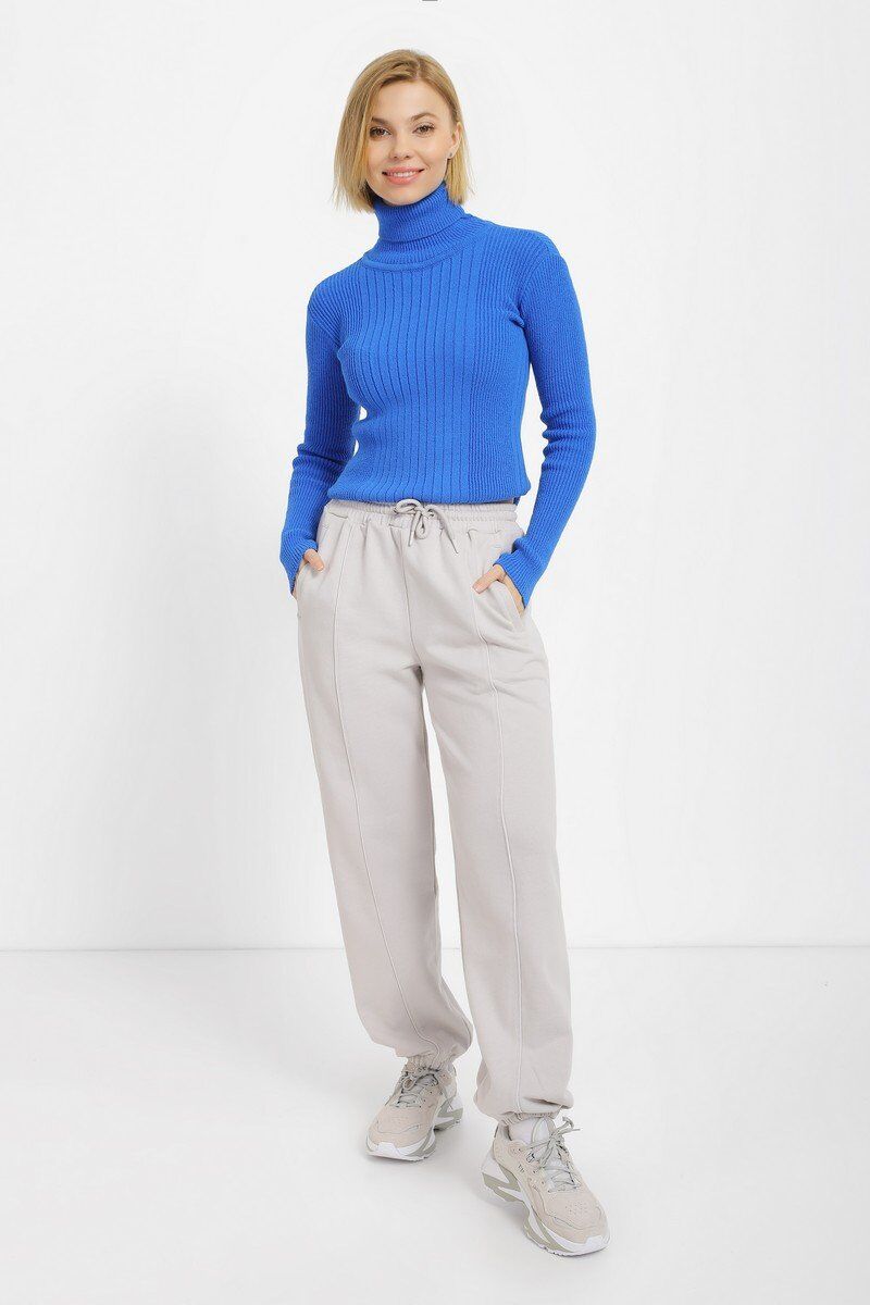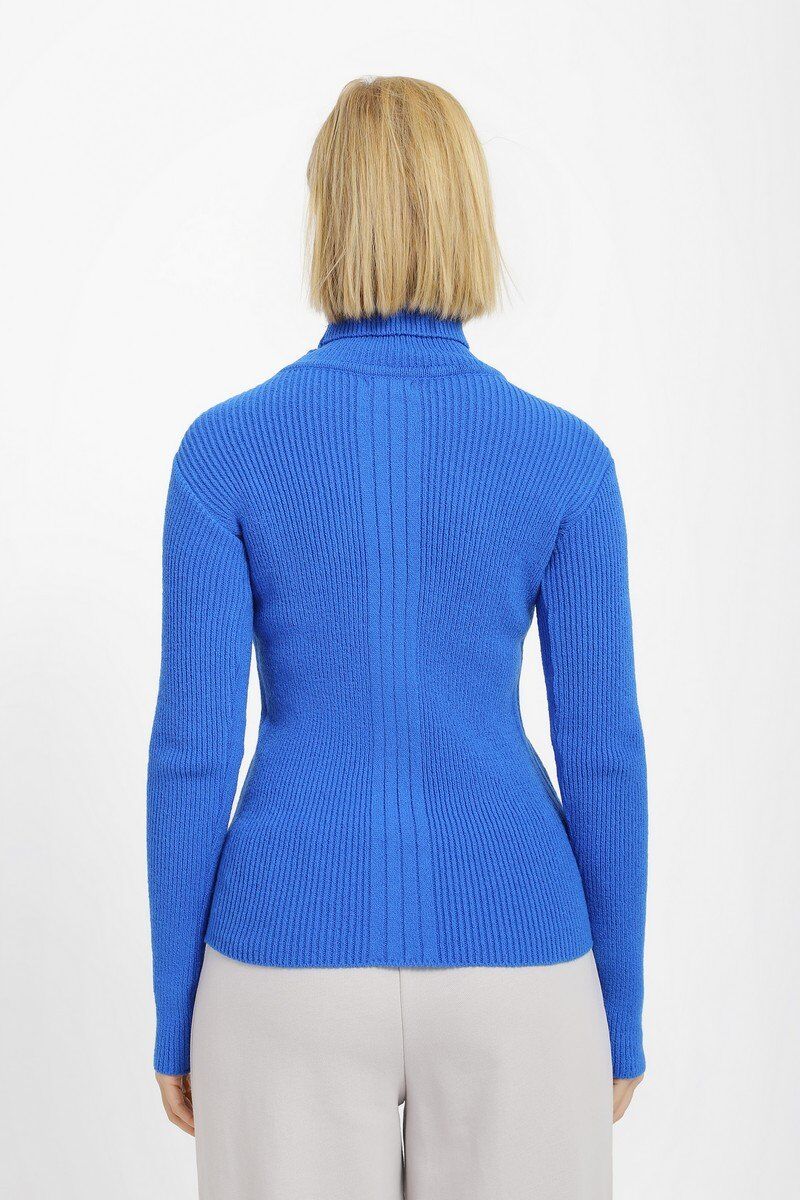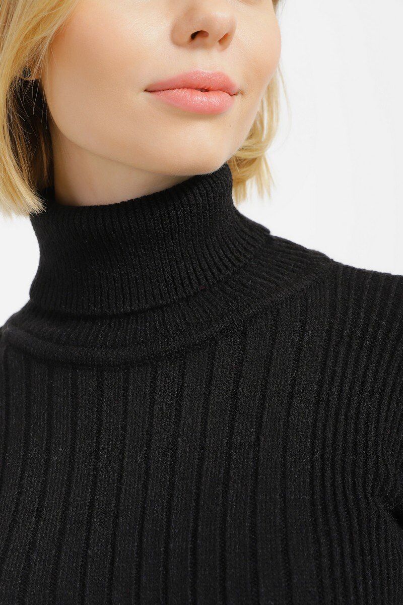 Женский вязаный свитер с высоким горлом. Длинные рукава. Спереди и сзади изделия вывязаны декоративные полосы.