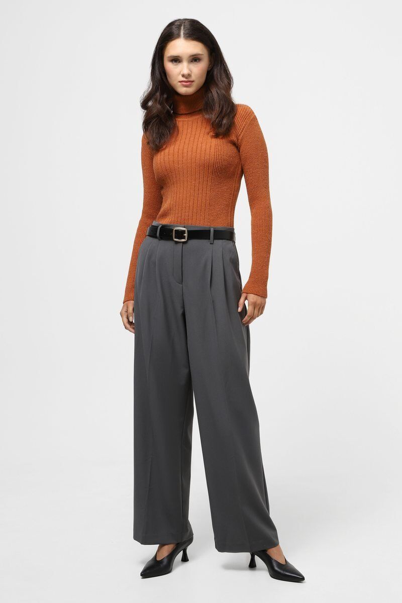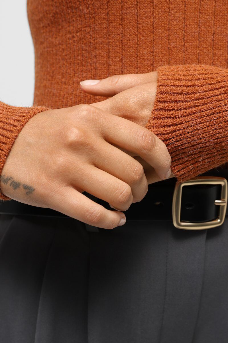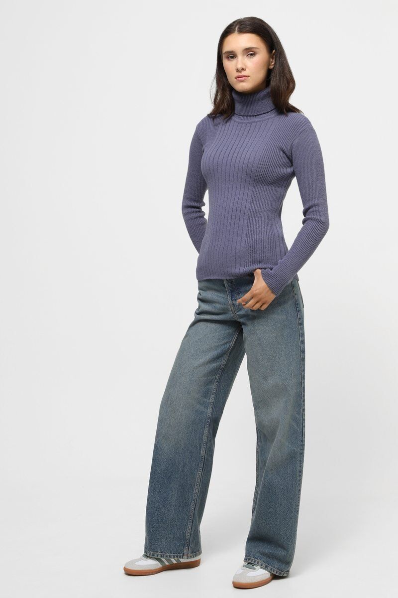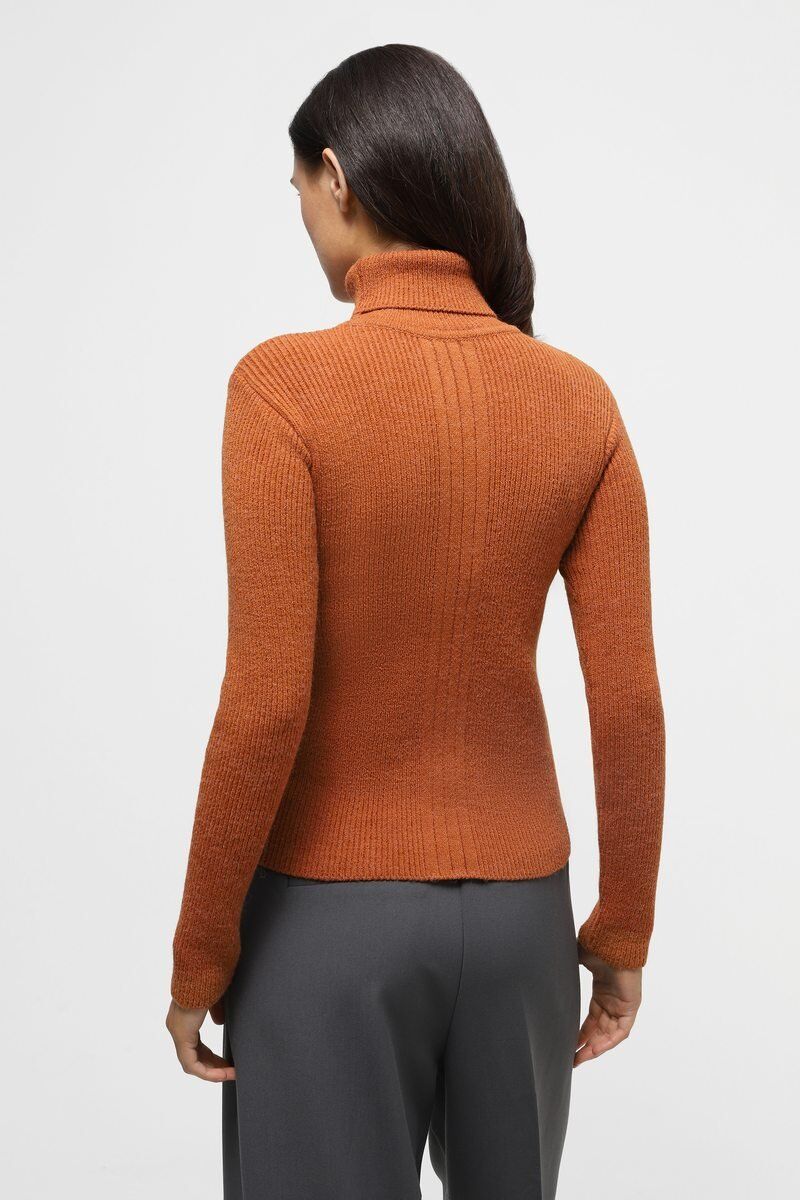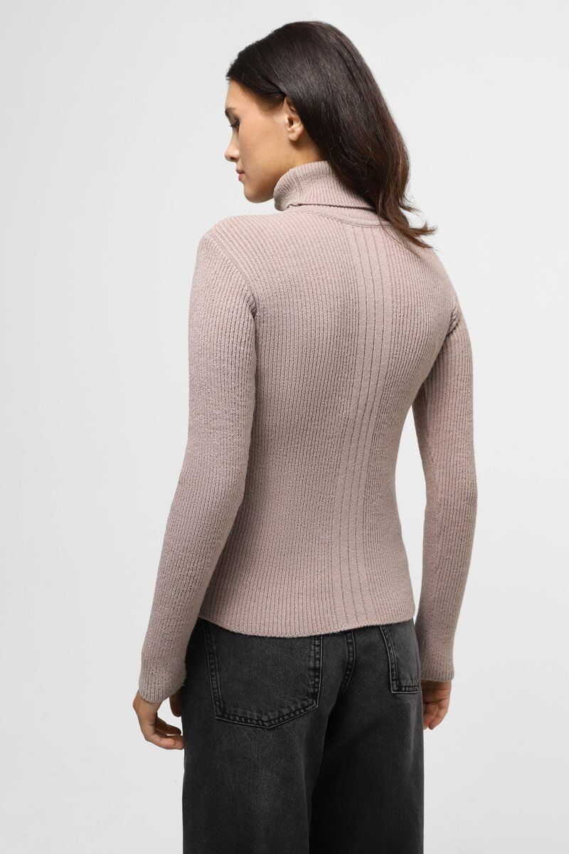 Женский вязаный свитер с высоким горлом. Длинные рукава. Спереди и сзади изделия вывязаны декоративные полосы.