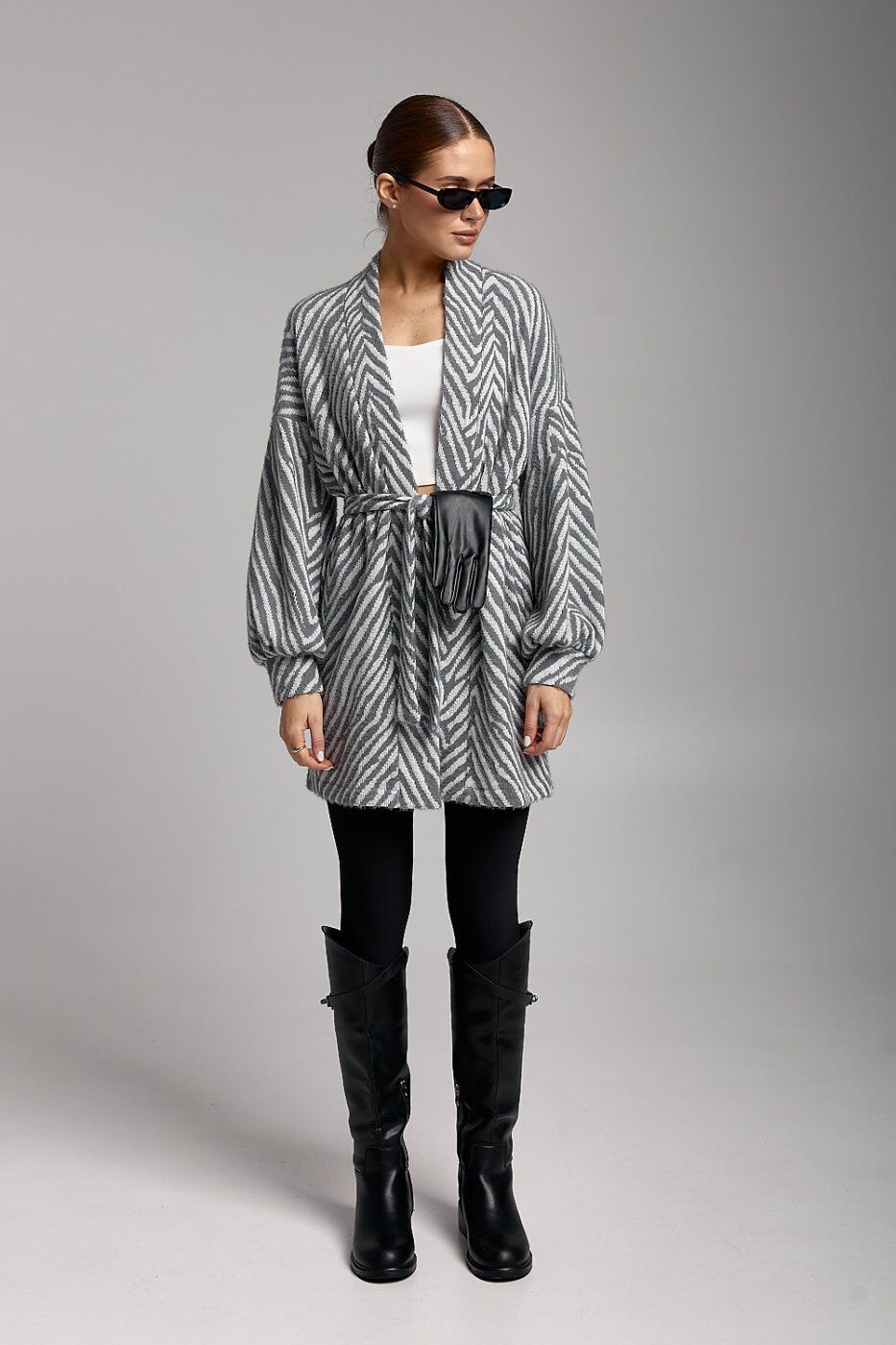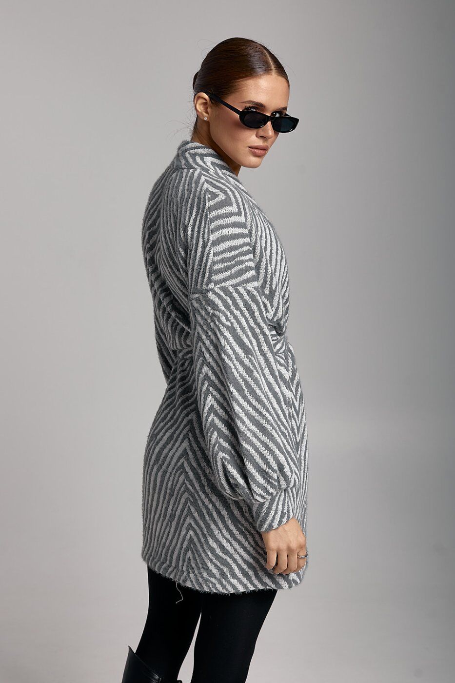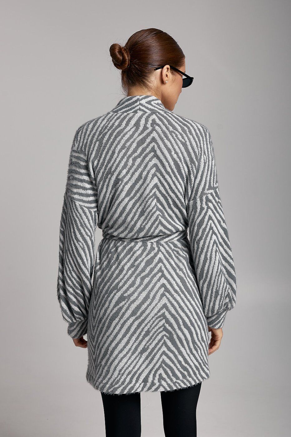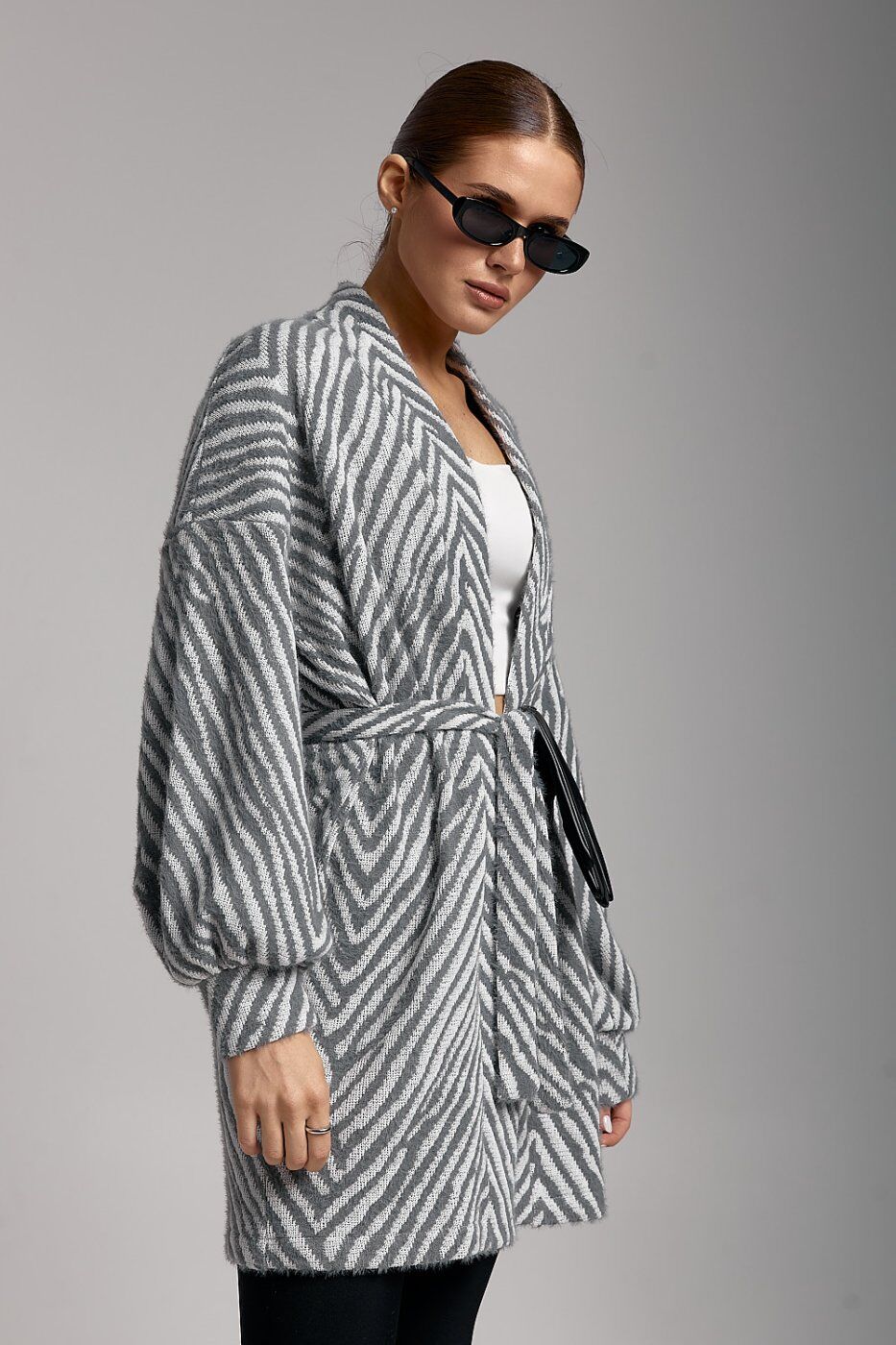 Модний жіночий кардиган ARTMON у сірому кольорі — універсальний елемент гардероба для стильних повсякденних образів. Модель виконана з м’якого в’язаного полотна з виразним геометричним візерунком «ялинка», який візуально витягує силует та додає образу елегантності. Кардиган має прямий крій і середню довжину, добре сідає по фігурі та не сковує рухів. Об’ємні довгі рукави з манжетами створюють сучасний та трендовий вигляд. Кардиган легко поєднується з базовими топами, легінсами, джинсами або сукнями. Підходить для створення casual, city та мінімалістичних образів у прохолодну пору року.