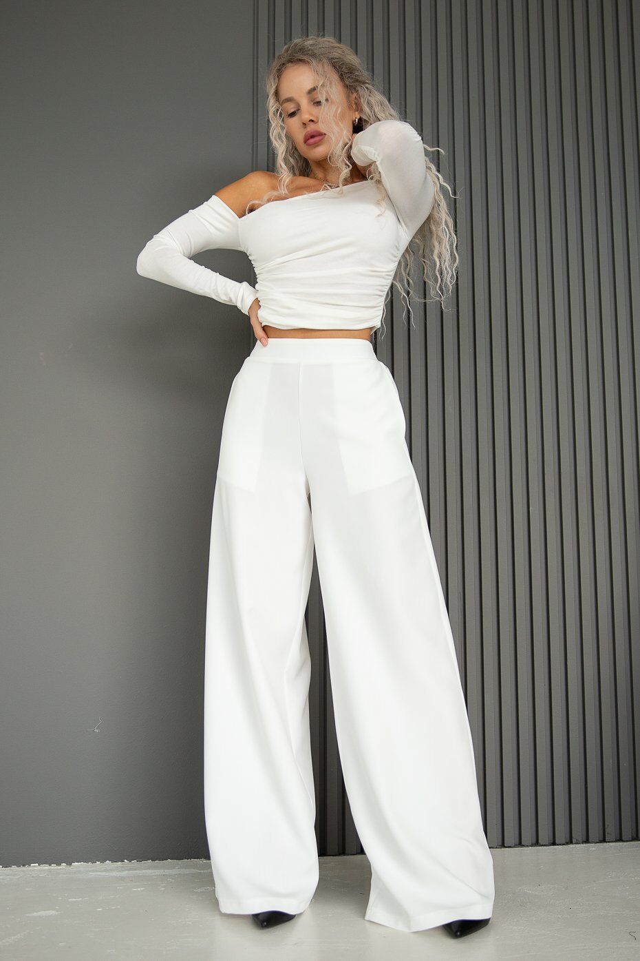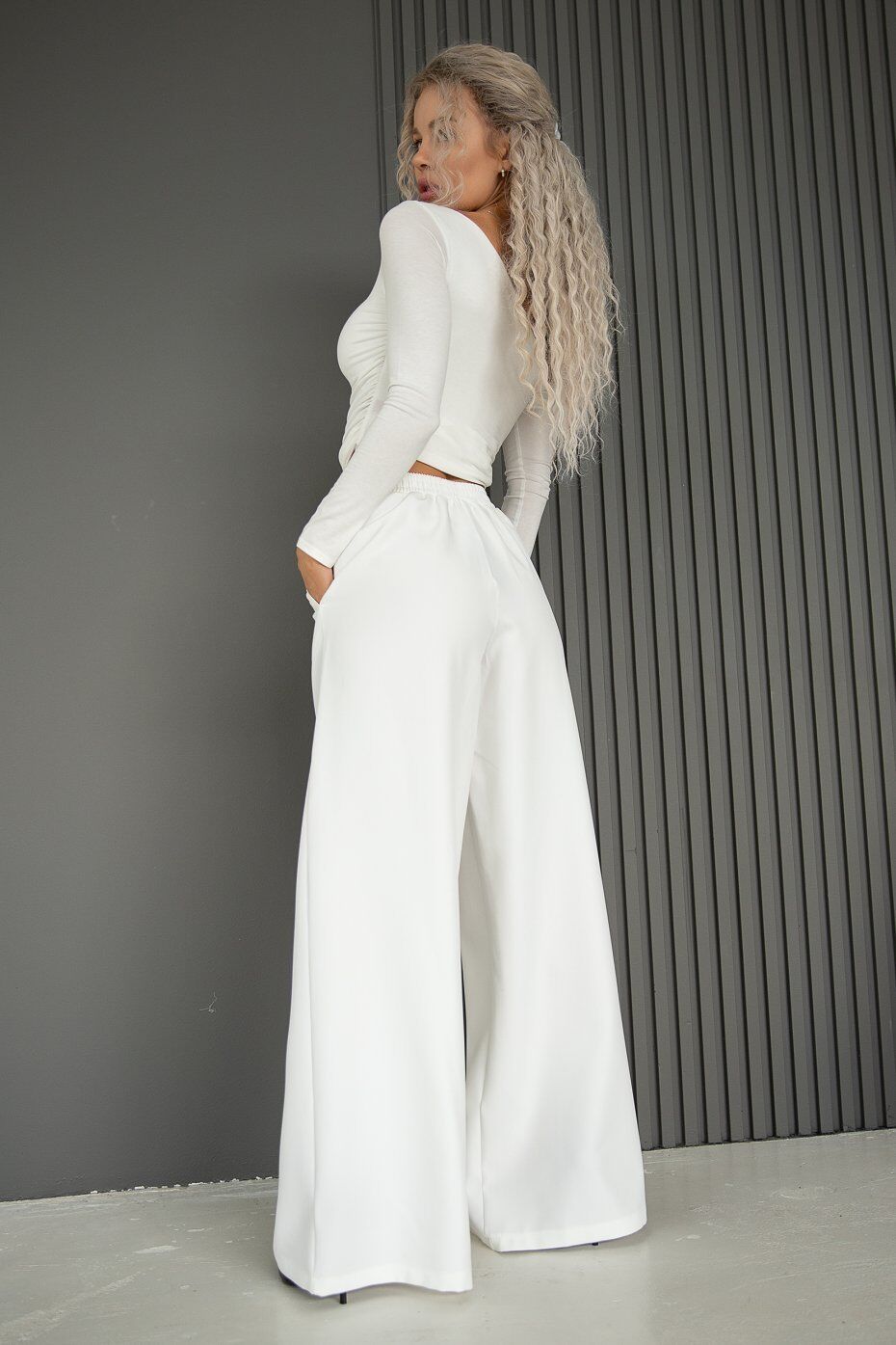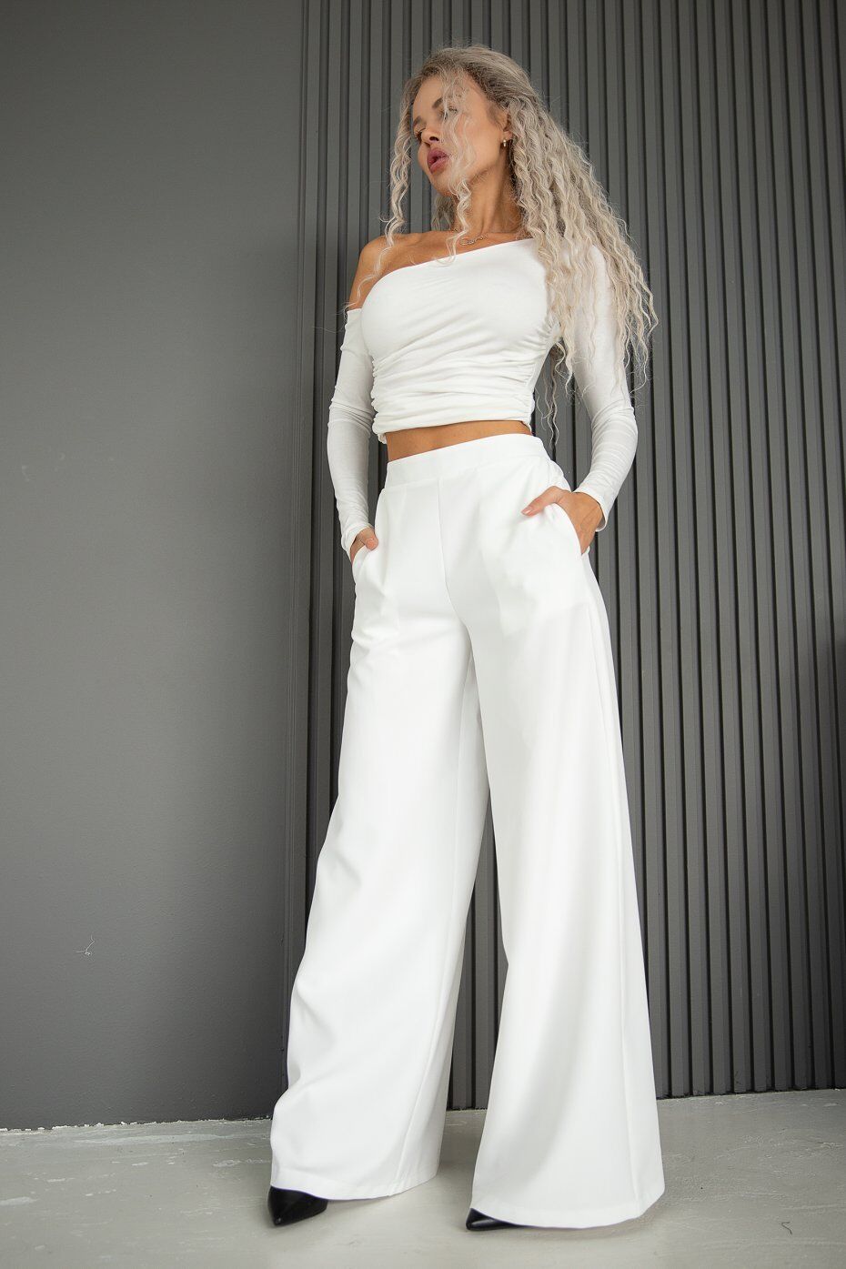 Трендовые брюки клёш от бедра. Сзади на поясе вставлена резинка для удобства одевания. По бокам карманы в швах.
