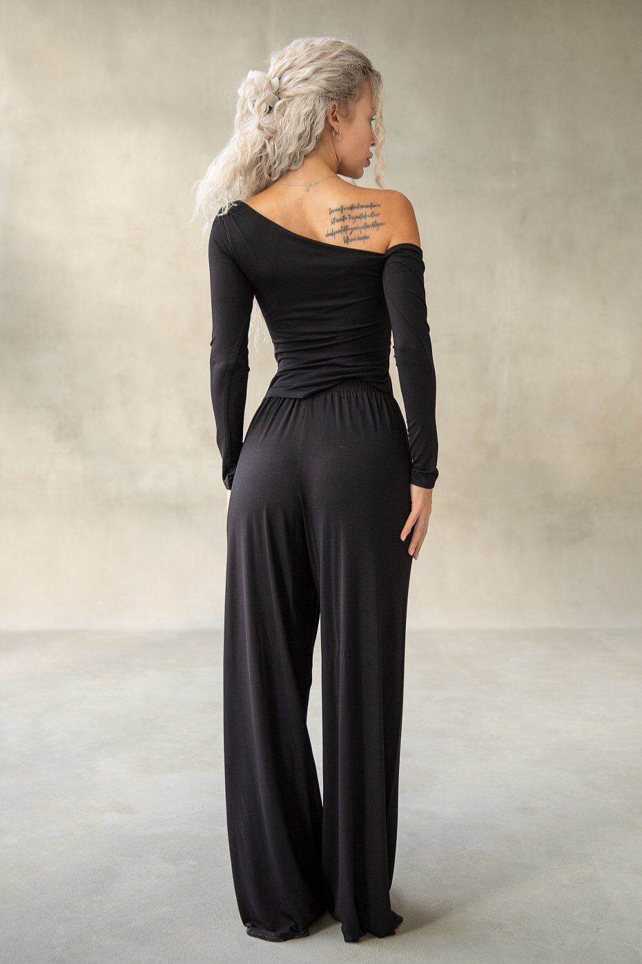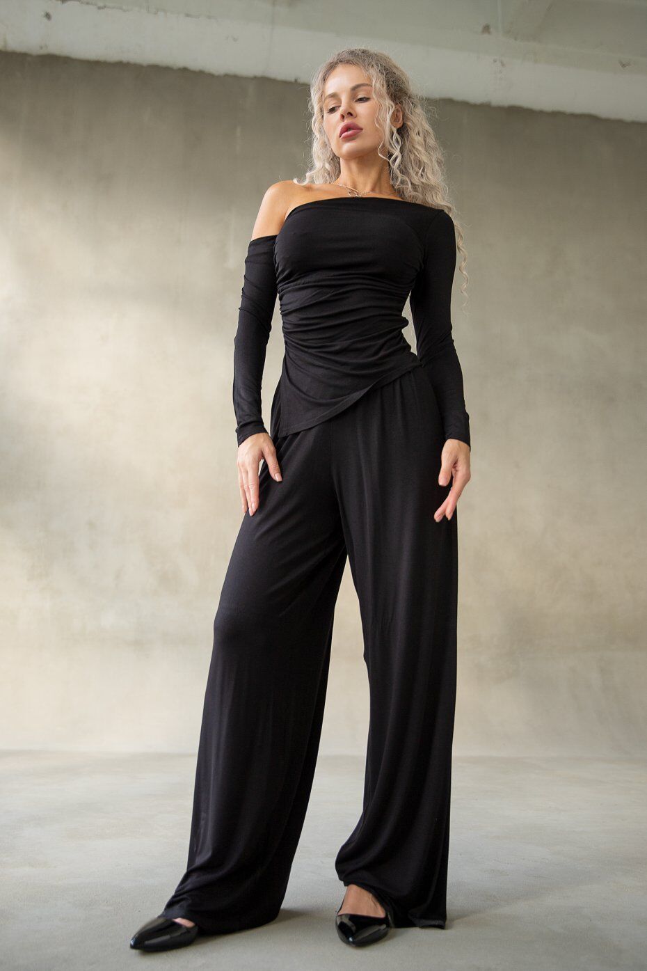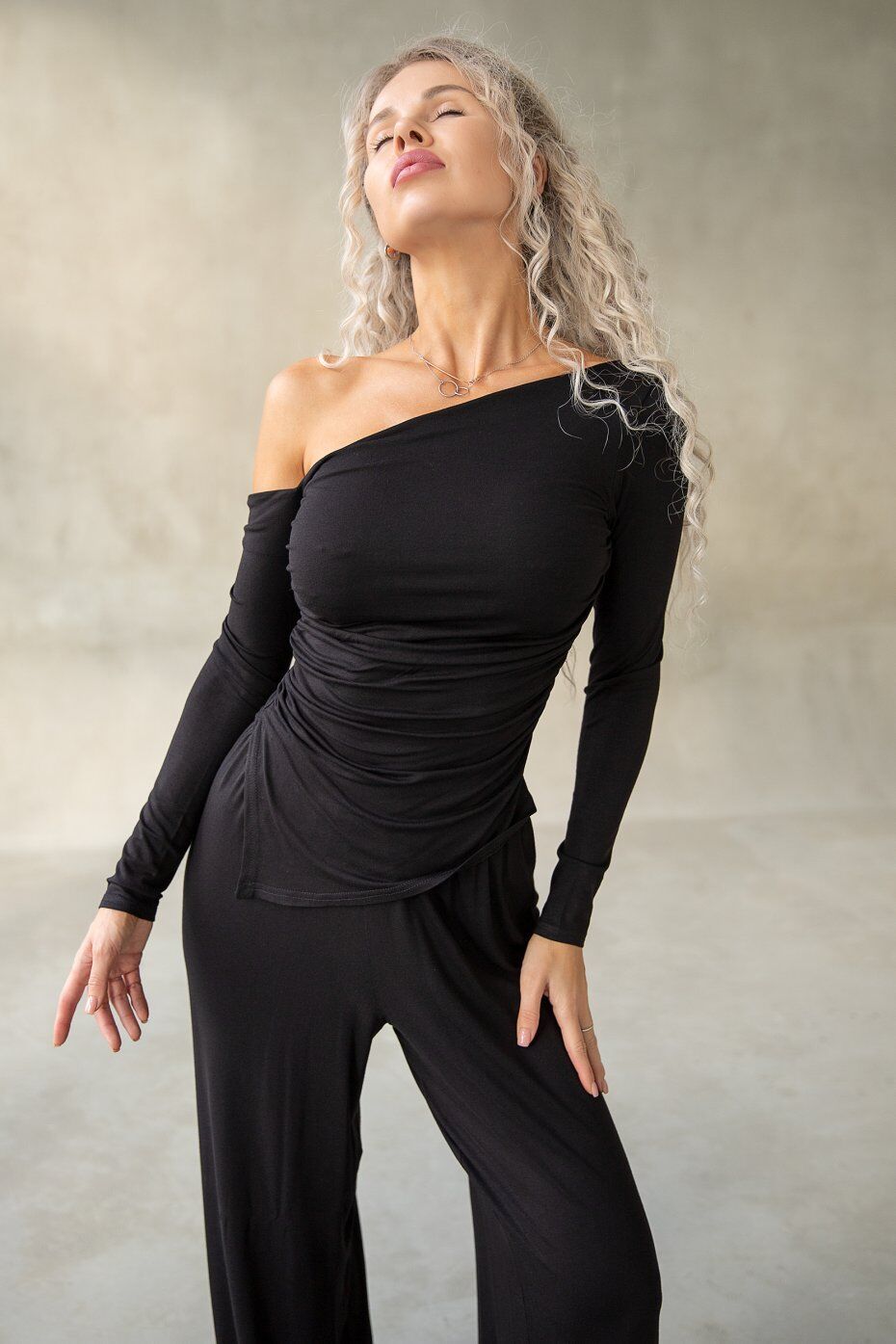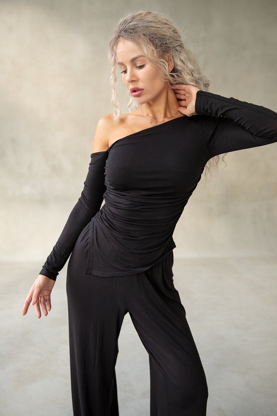 Лонгслив с открытыми плечами и драпировкой спереди. Линия низа асимметричная с уголками слева. Длина изделия по центру спинки 45 см.
