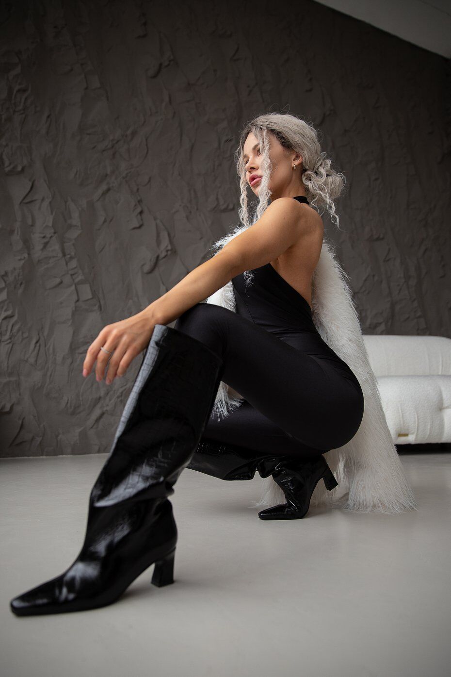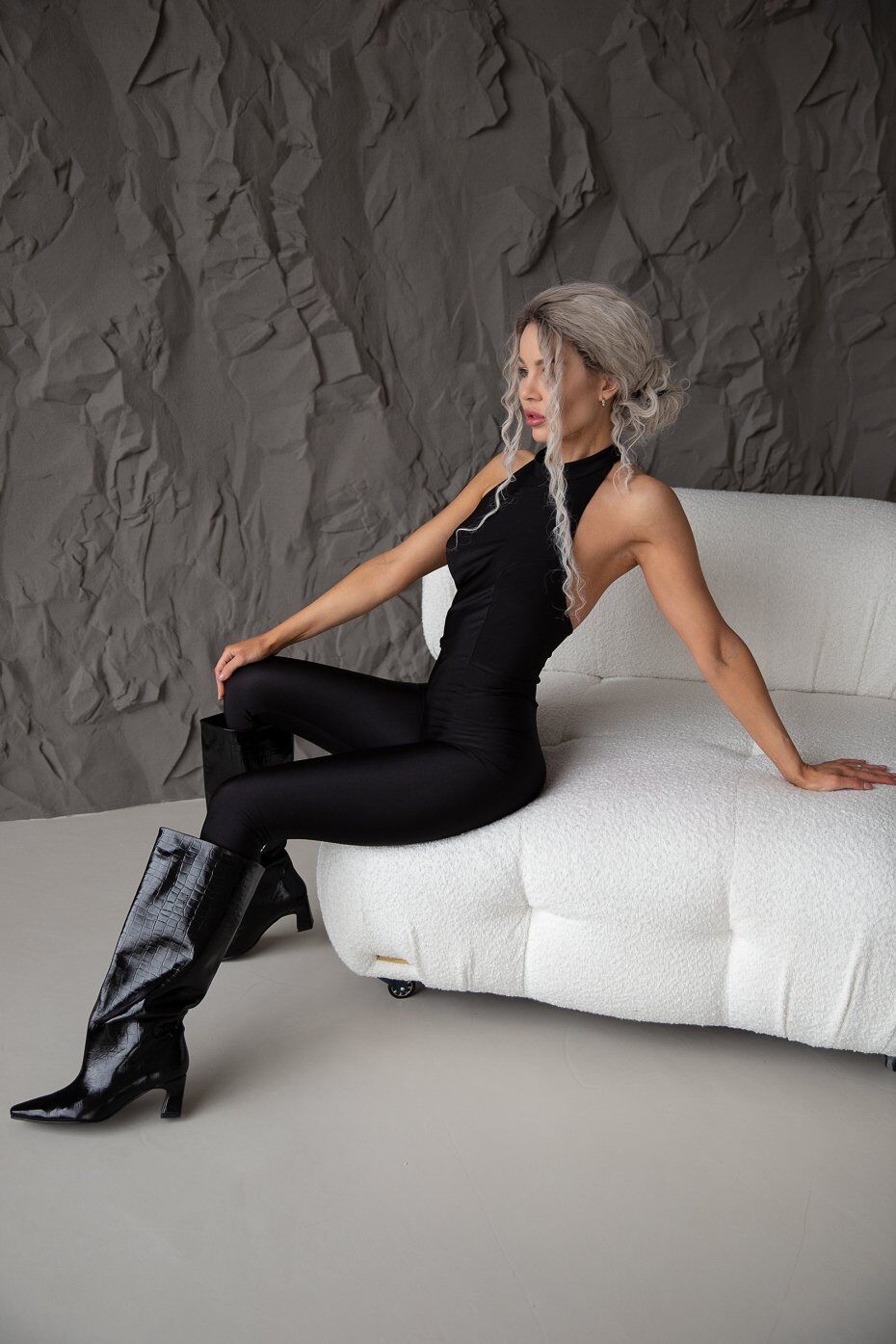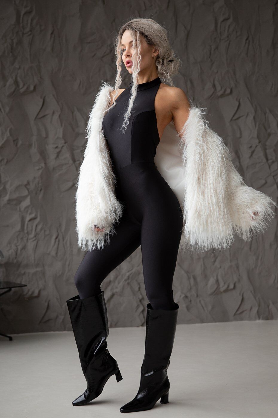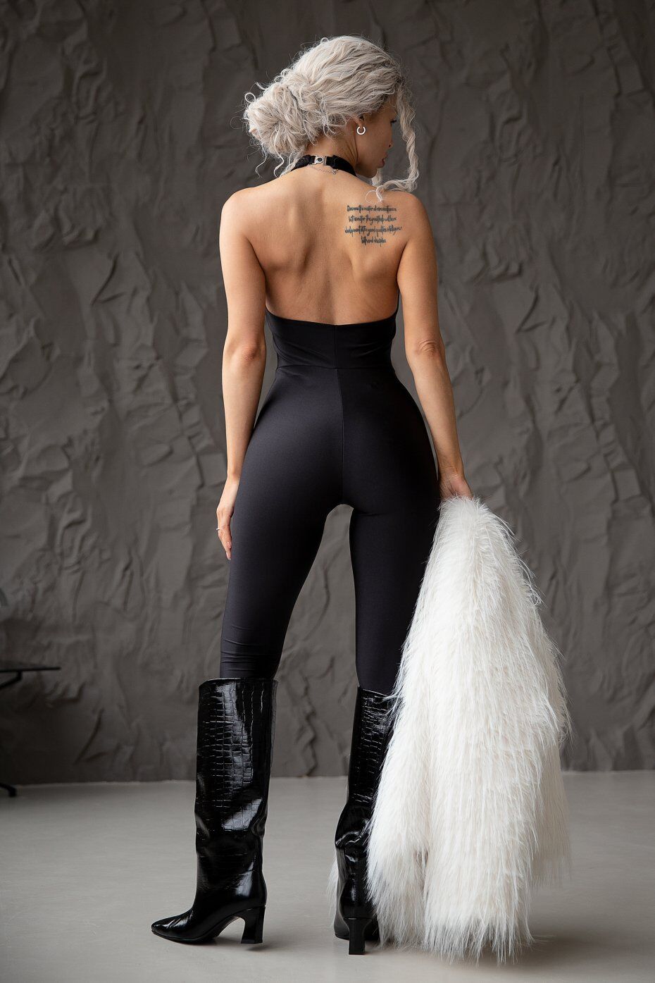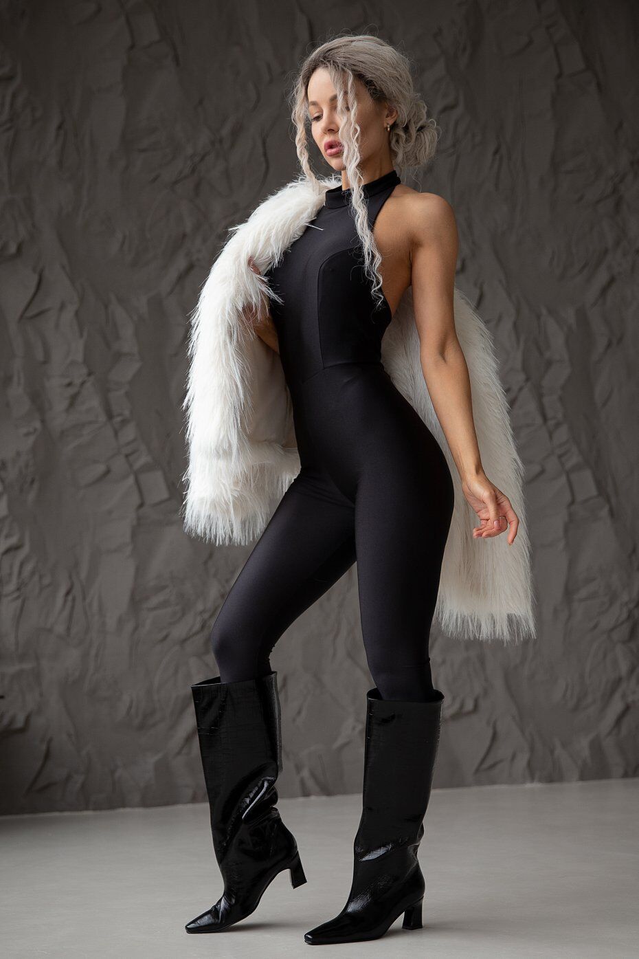 Элегантный комбинезон с открытой спиной в стиле Catwalk. Застежка сзади на воротнике-стойке.