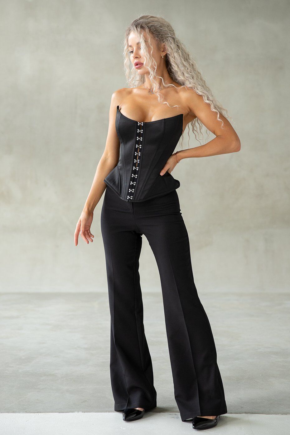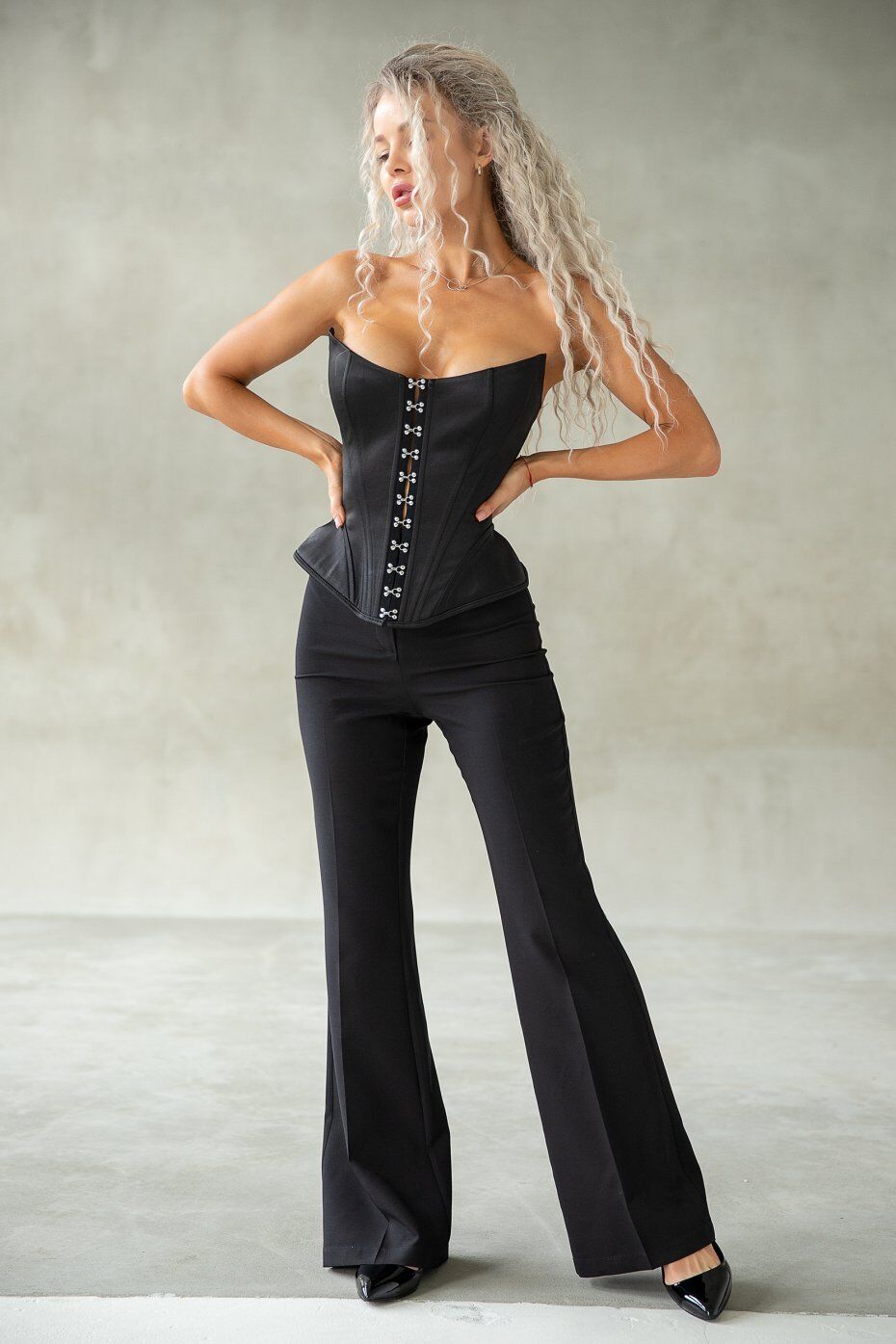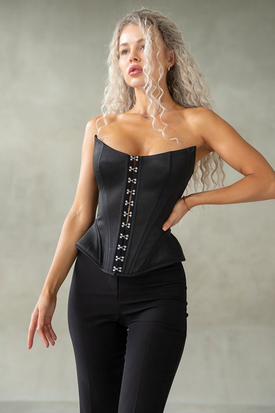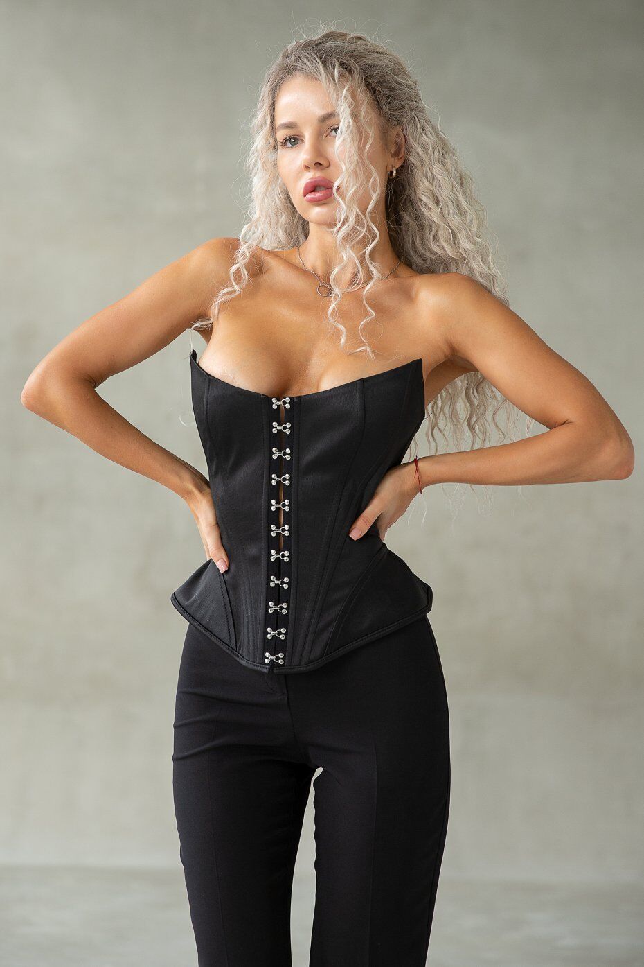 Корсет из плотного атласа на подкладе с фигурными линиями верха и низа. Изящные линии рельефов в сочетании с отрезными бочками выгодно корректируют фигуру. Застёжка по переду на крючки, по спинке можно регулировать размер с помощью шнуровки. Длина по центру переда 33 см, по центру спинки 27 см.