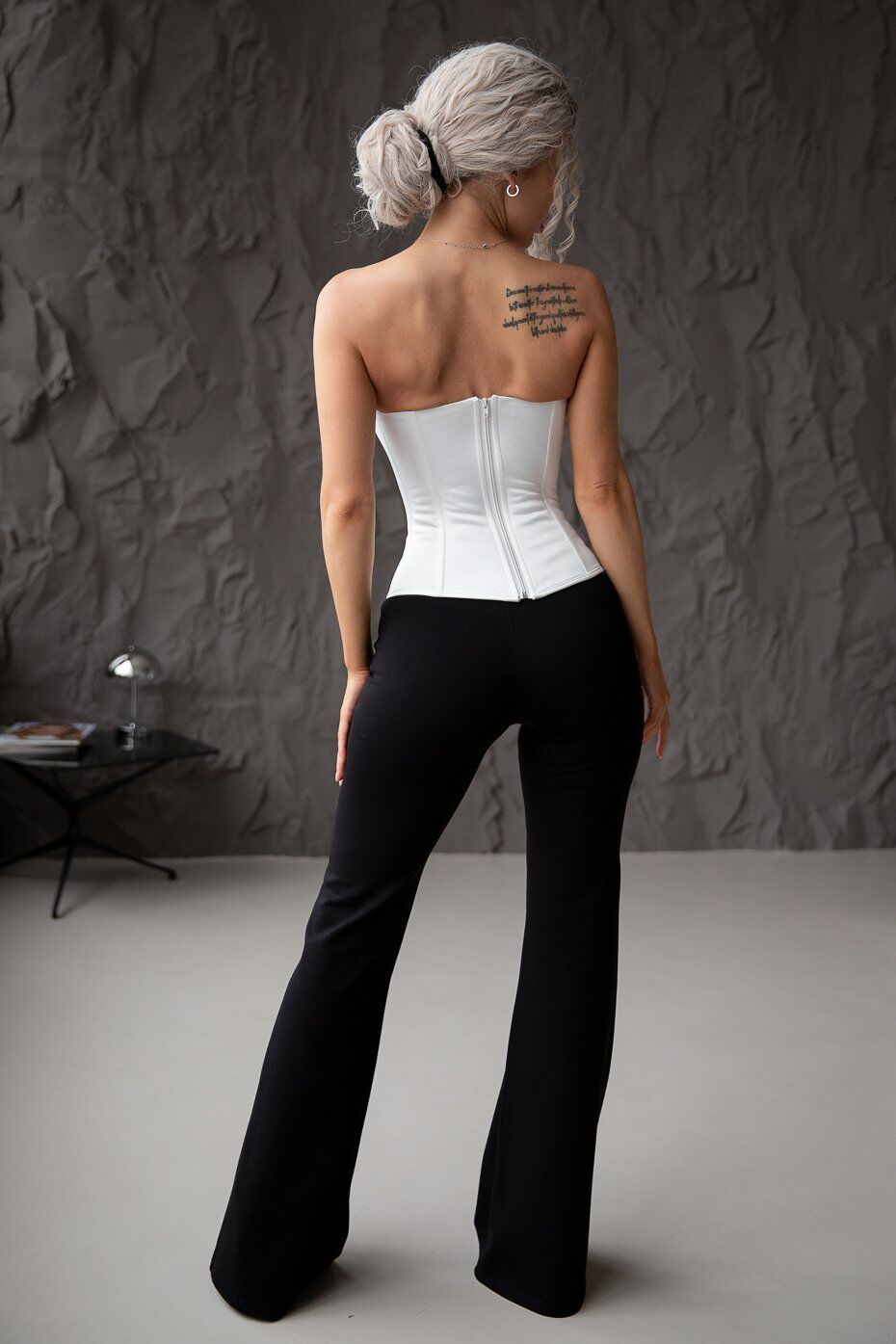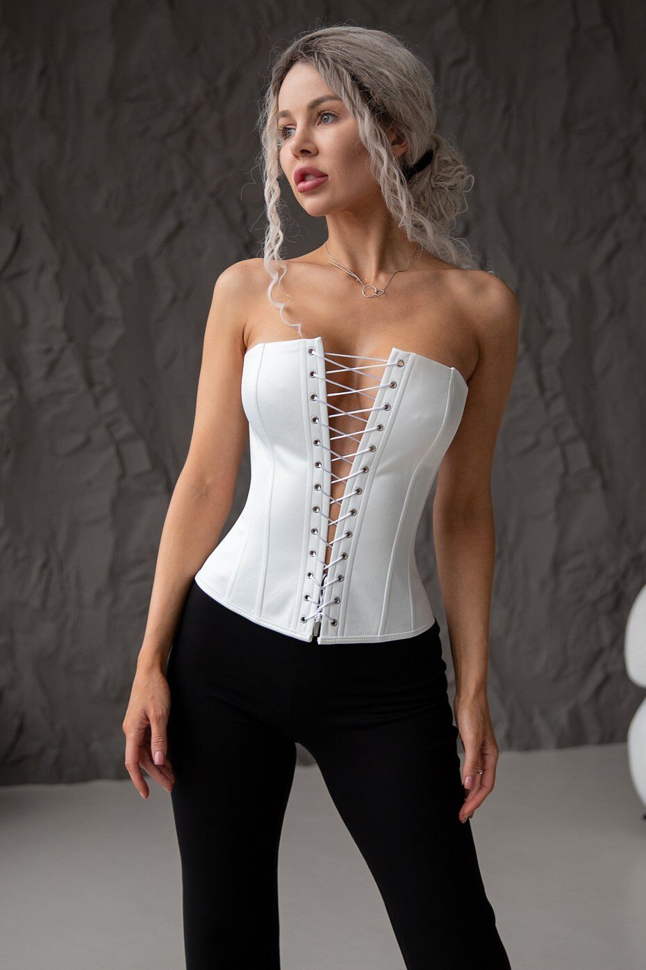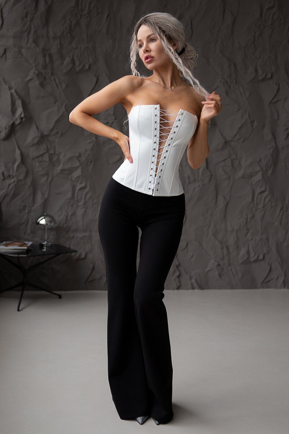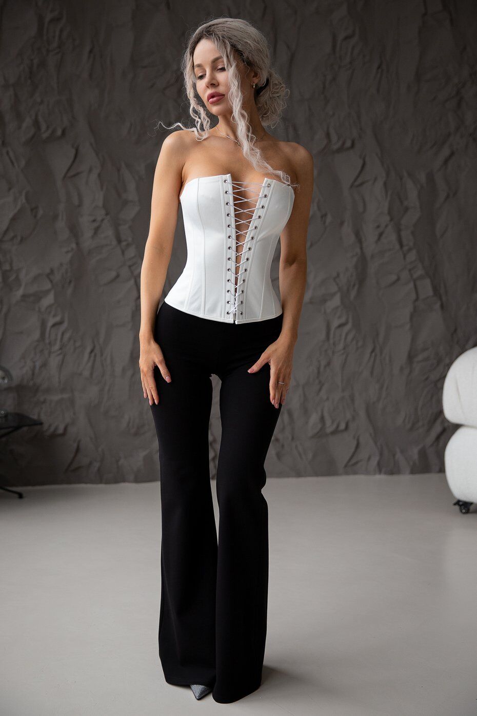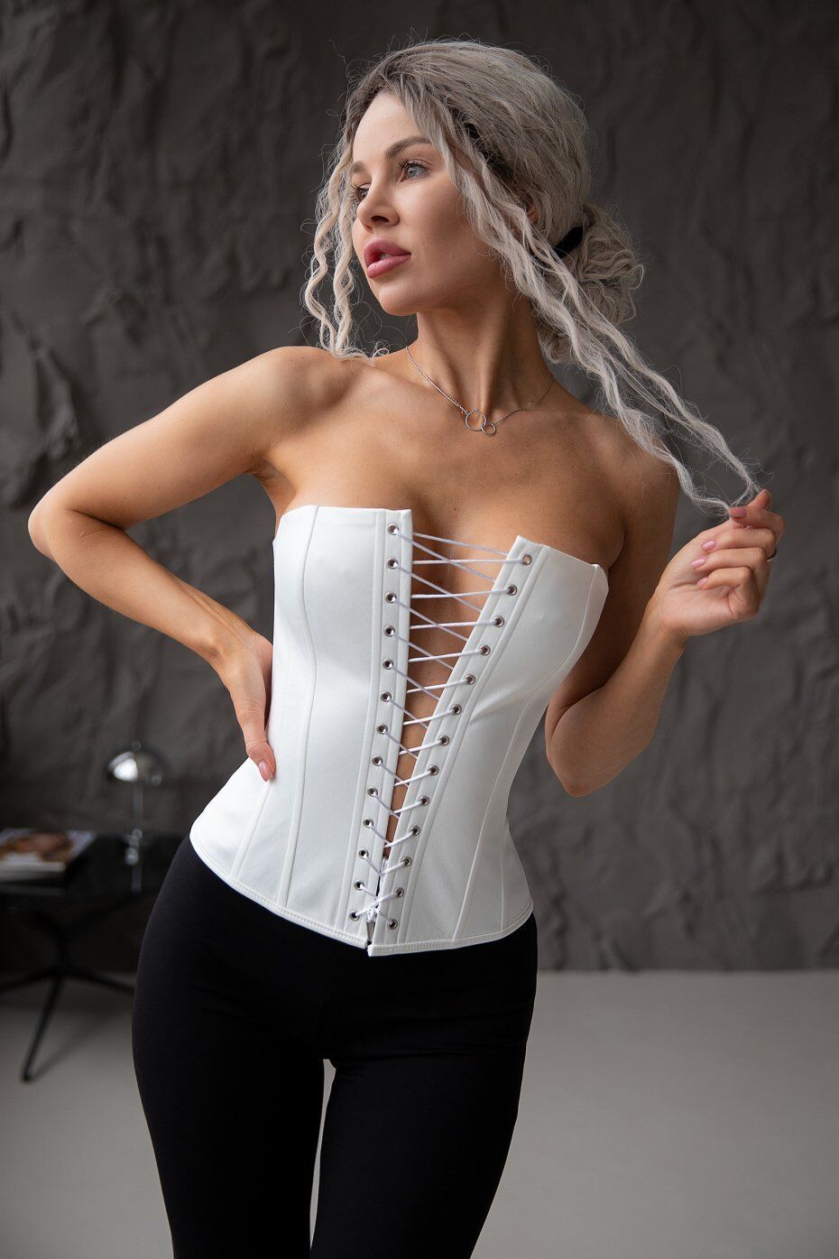 Изящный корсет из атласа со шнуровкой спереди. В рельефы вставлены косточки. Благодаря шнуровке корсет удобно регулировать по фигуре. Застежка сзади на молнию.