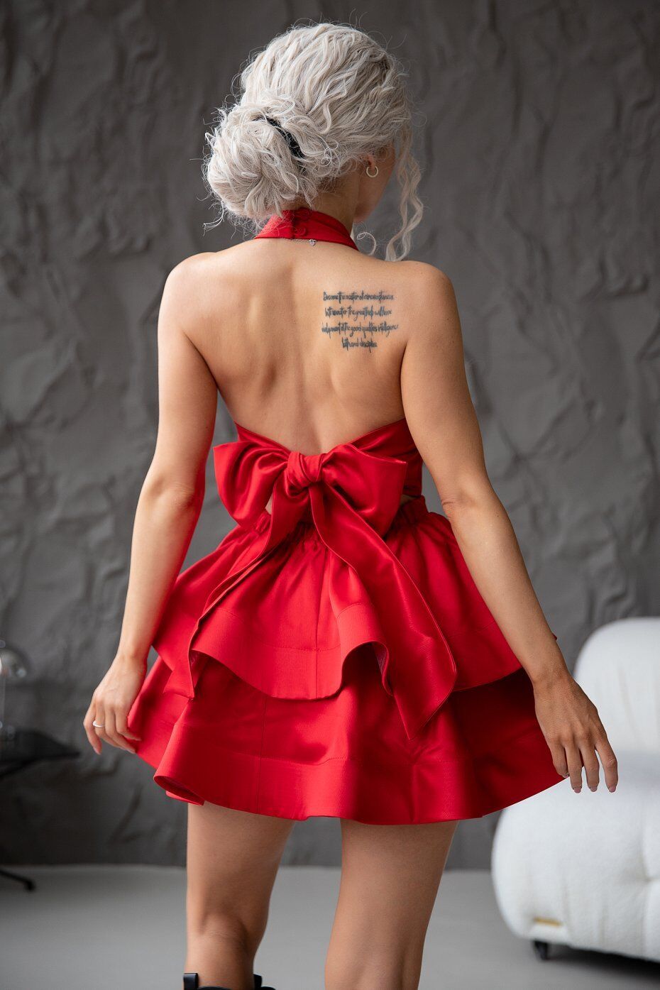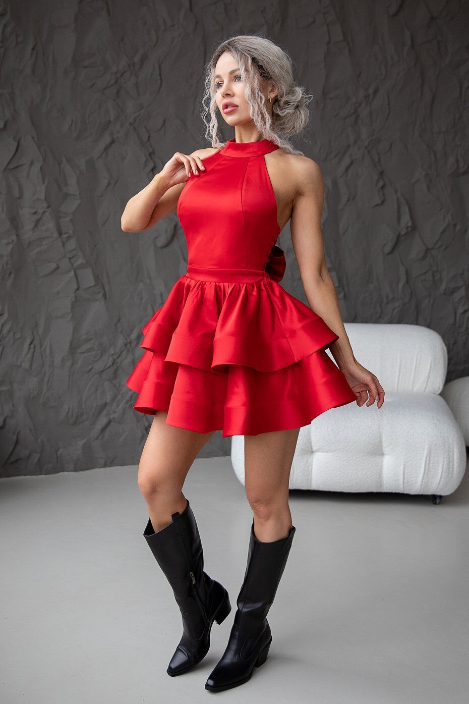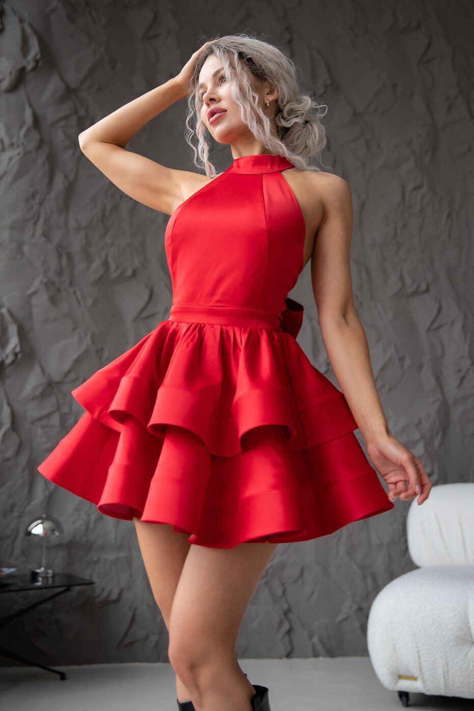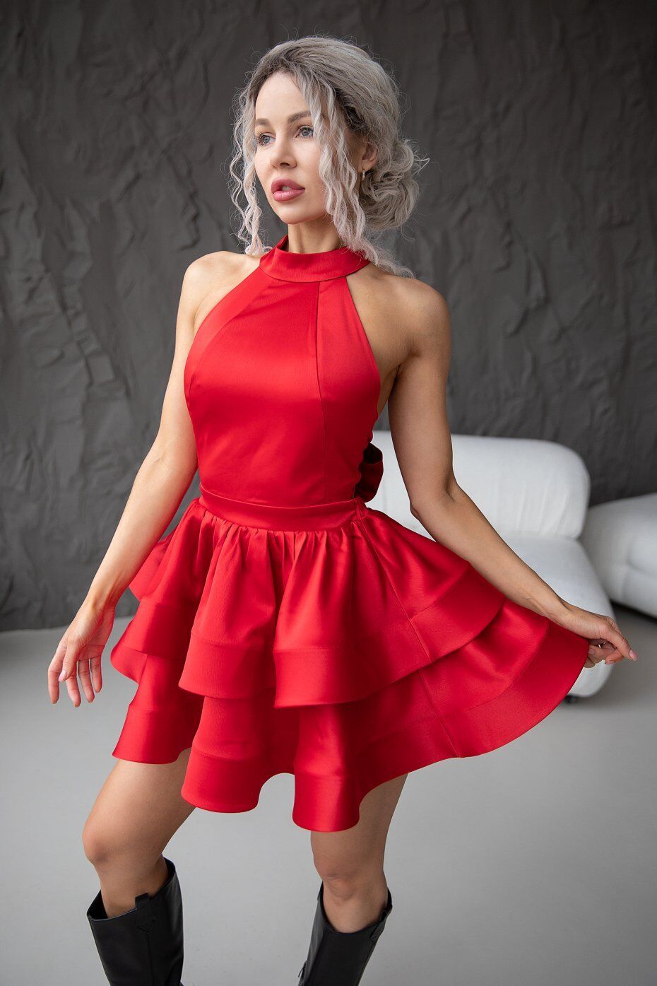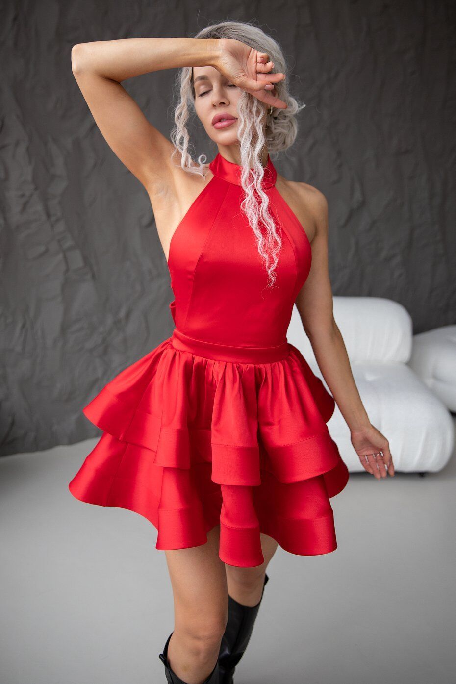 Стильний сарафан довжиною міні виконаний з атласу. Верх - облягаючий з високим коміром, що застібається на гудзики. Об'ємна хвилеподібна спідниця додає образу легкості та динаміки. Ефектний літній варіант, що підкреслить вашу фігуру. Потайна застібка - блискавка по спині. Довжина спідниці 41см.