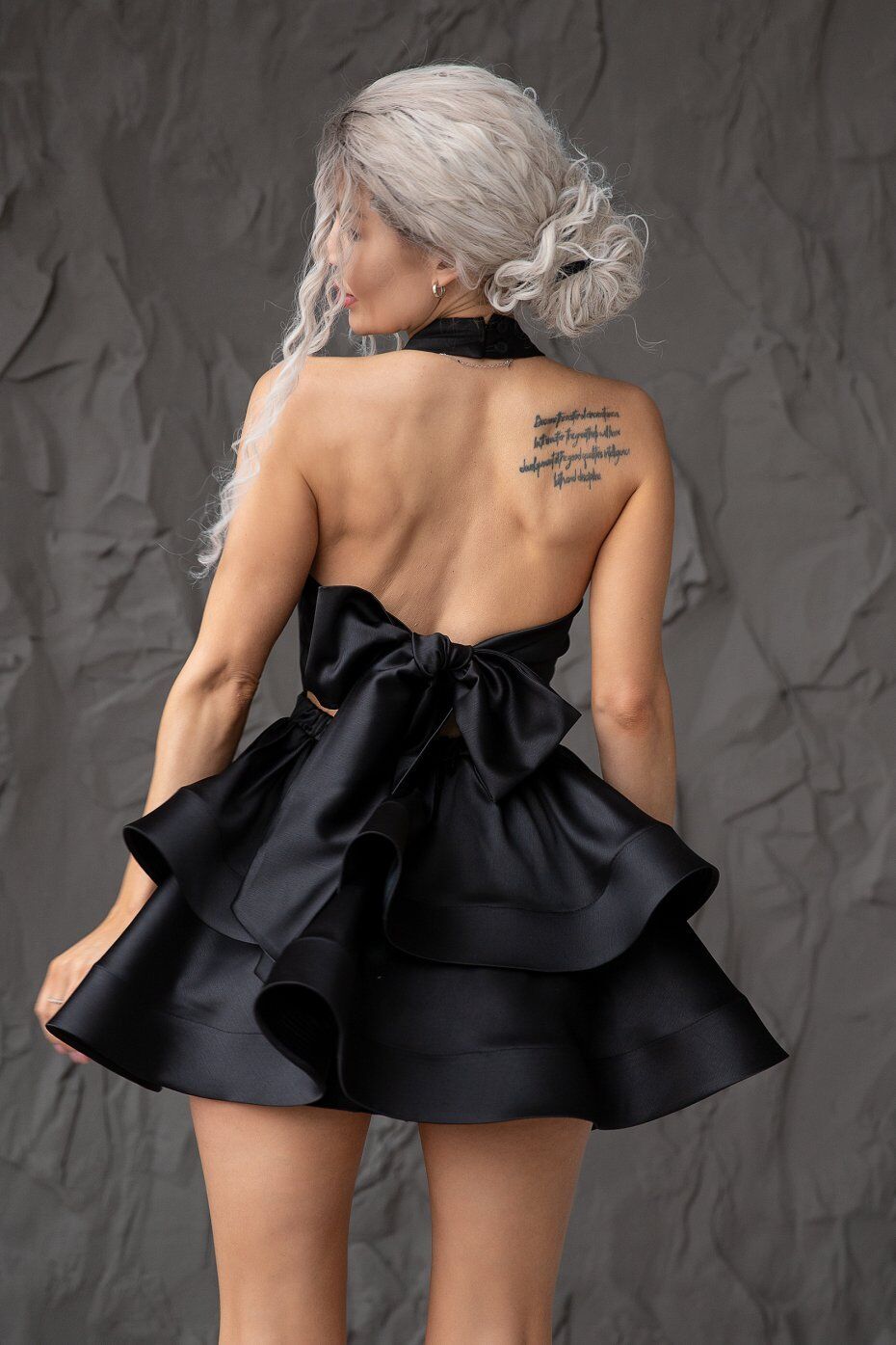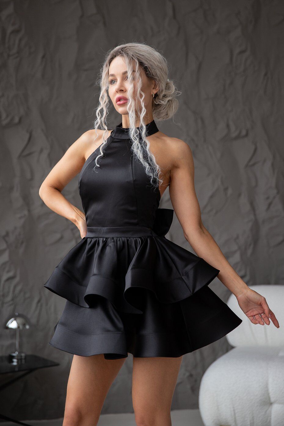 Стильний сарафан довжиною міні виконаний з атласу. Верх - облягаючий з високим коміром, що застібається на гудзики. Об'ємна хвилеподібна спідниця додає образу легкості та динаміки. Ефектний літній варіант, що підкреслить вашу фігуру. Потайна застібка - блискавка по спині. Довжина спідниці 41см.