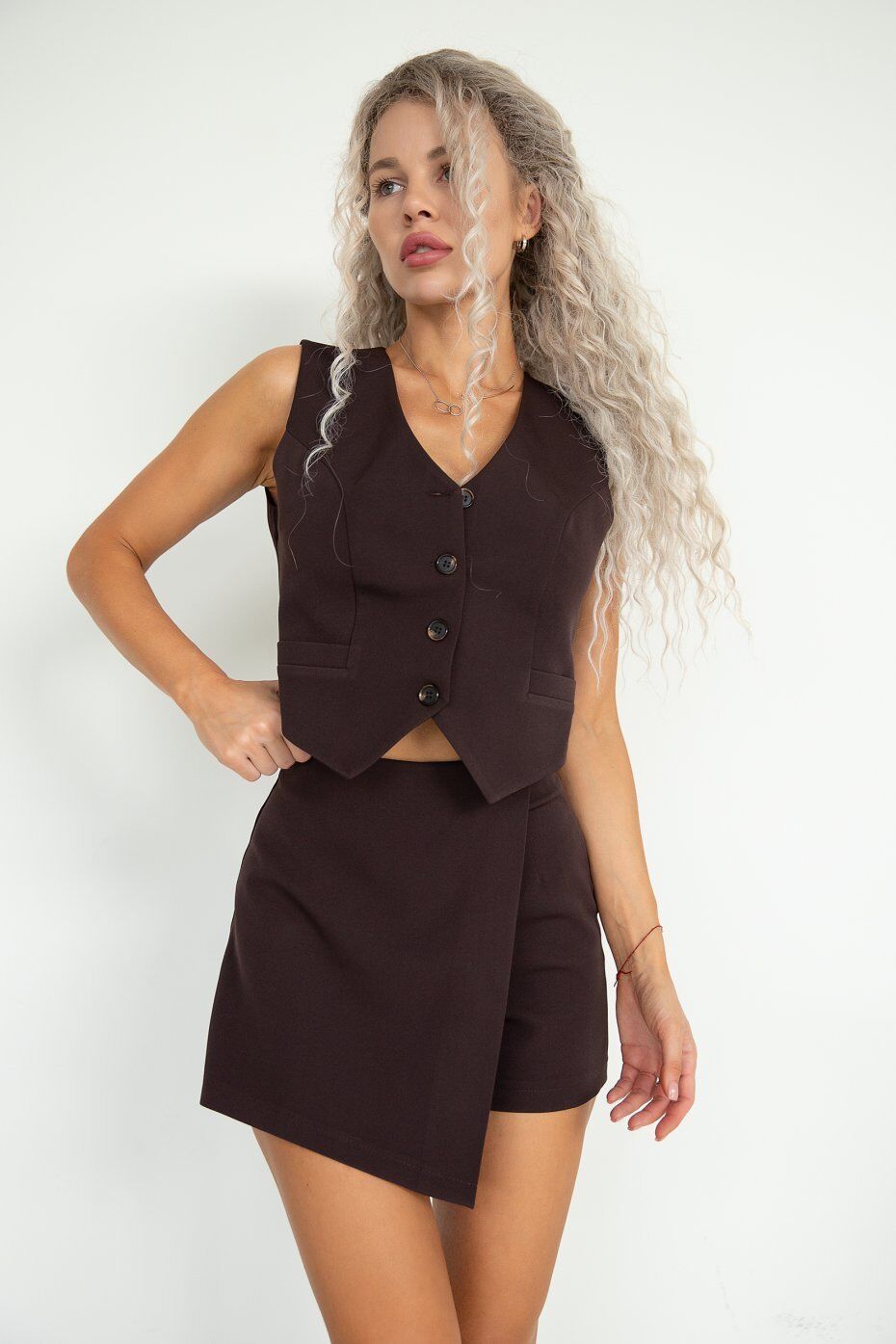 Юбка-шорты на запах спереди. Застежка в боку на потайную молнию. Длина изделия по боковому шву 37см. По шаговому 9 см.