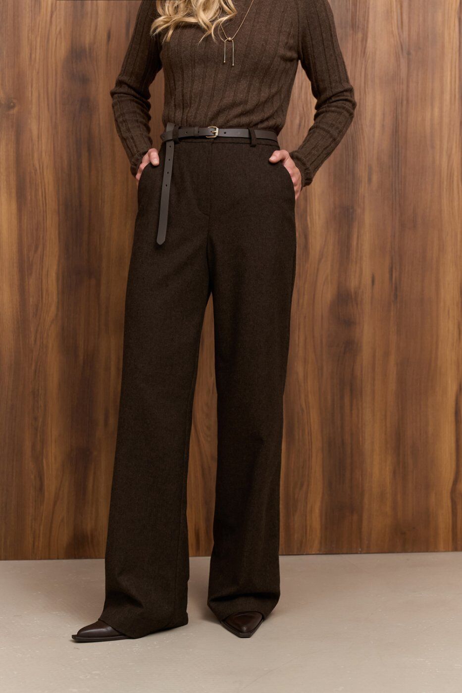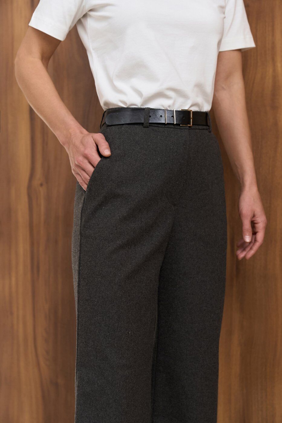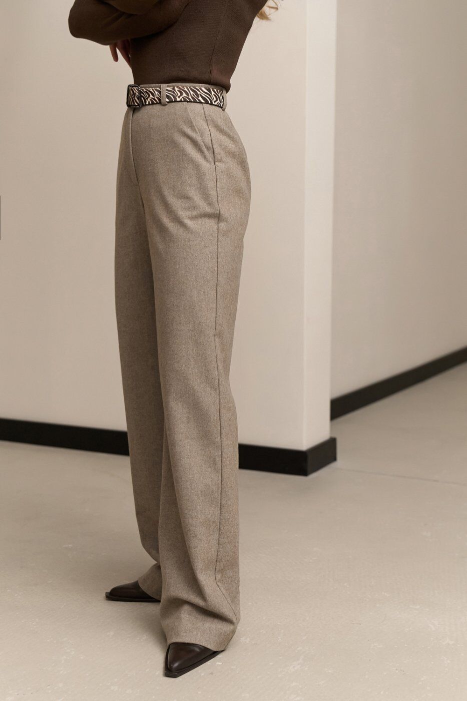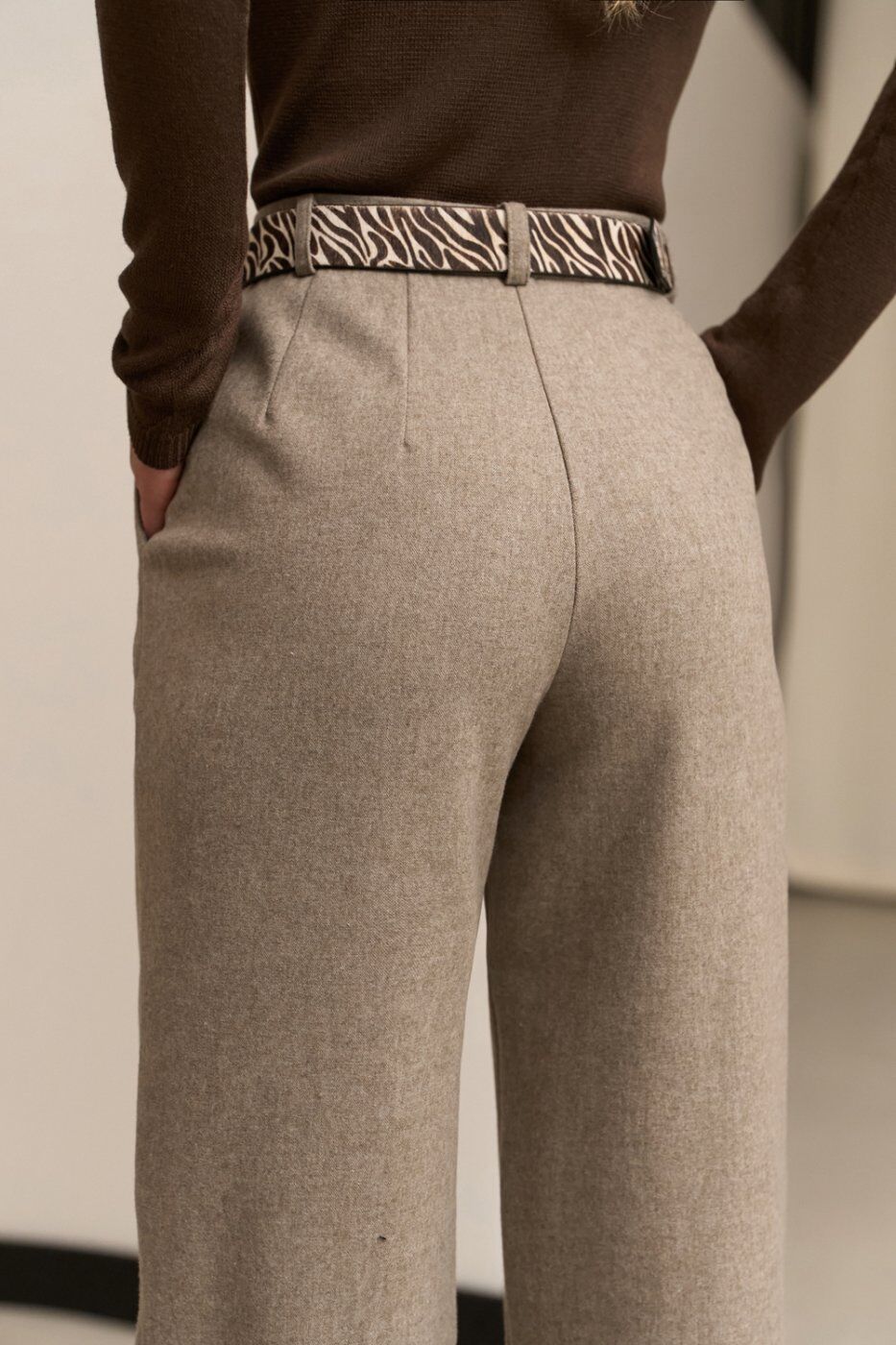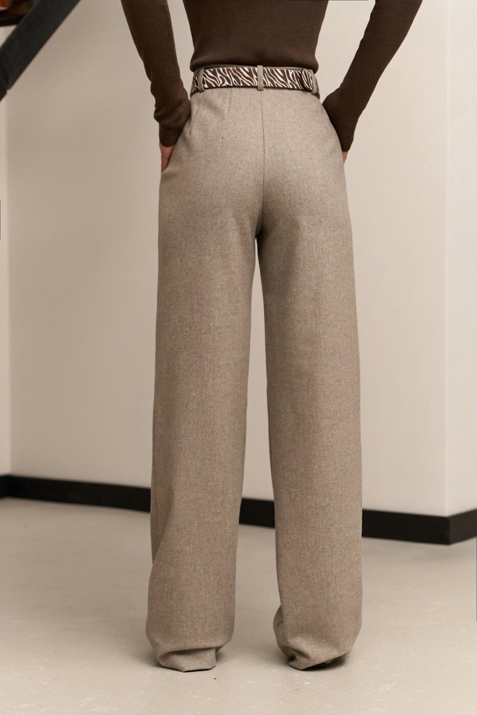 Теплі класичні штани прямого крою, виготовлені з напіввовняної тканини з додаванням віскози та еластану. Модель із високою посадкою та функціональними кишенями.