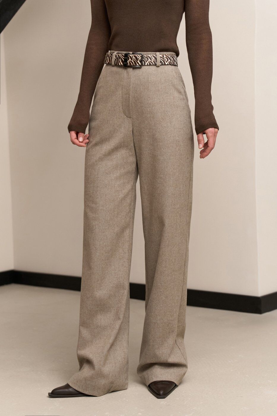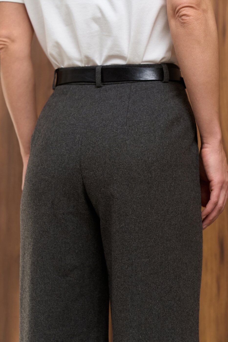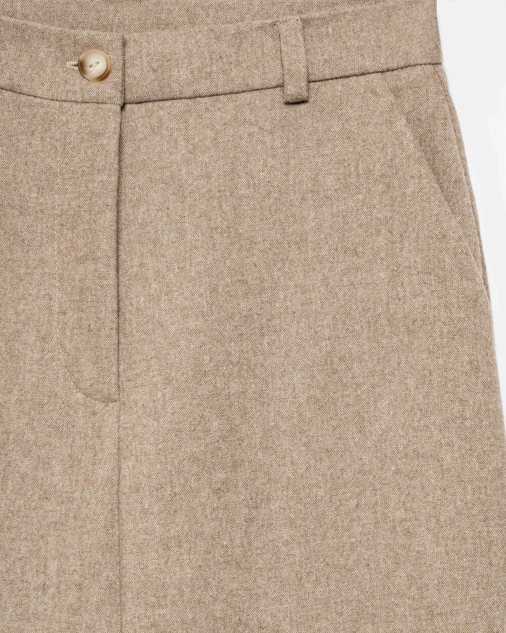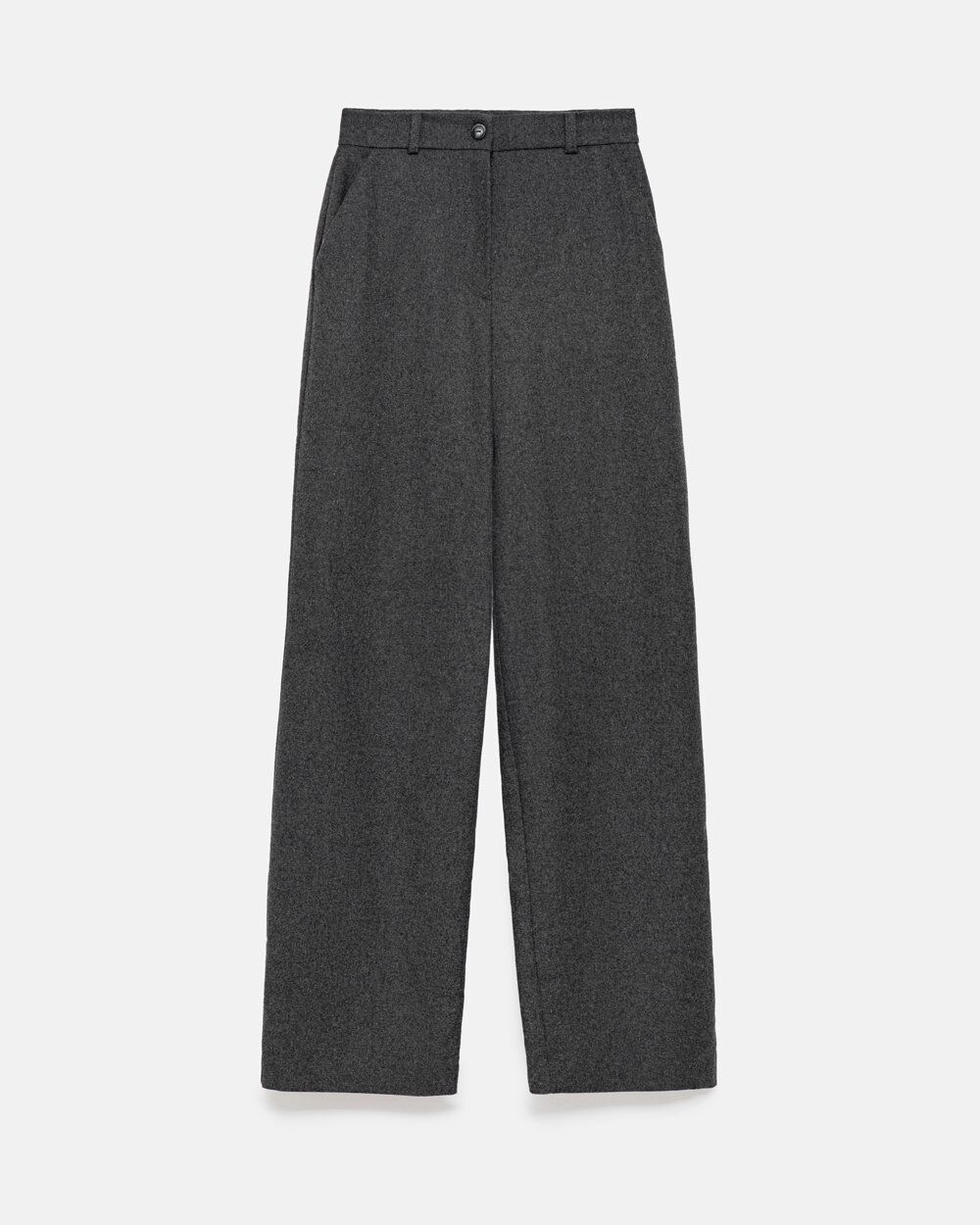 Теплі класичні штани прямого крою, виготовлені з напіввовняної тканини з додаванням віскози та еластану. Модель із високою посадкою та функціональними кишенями.
