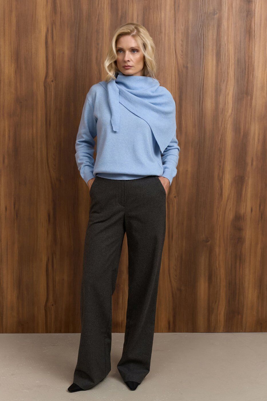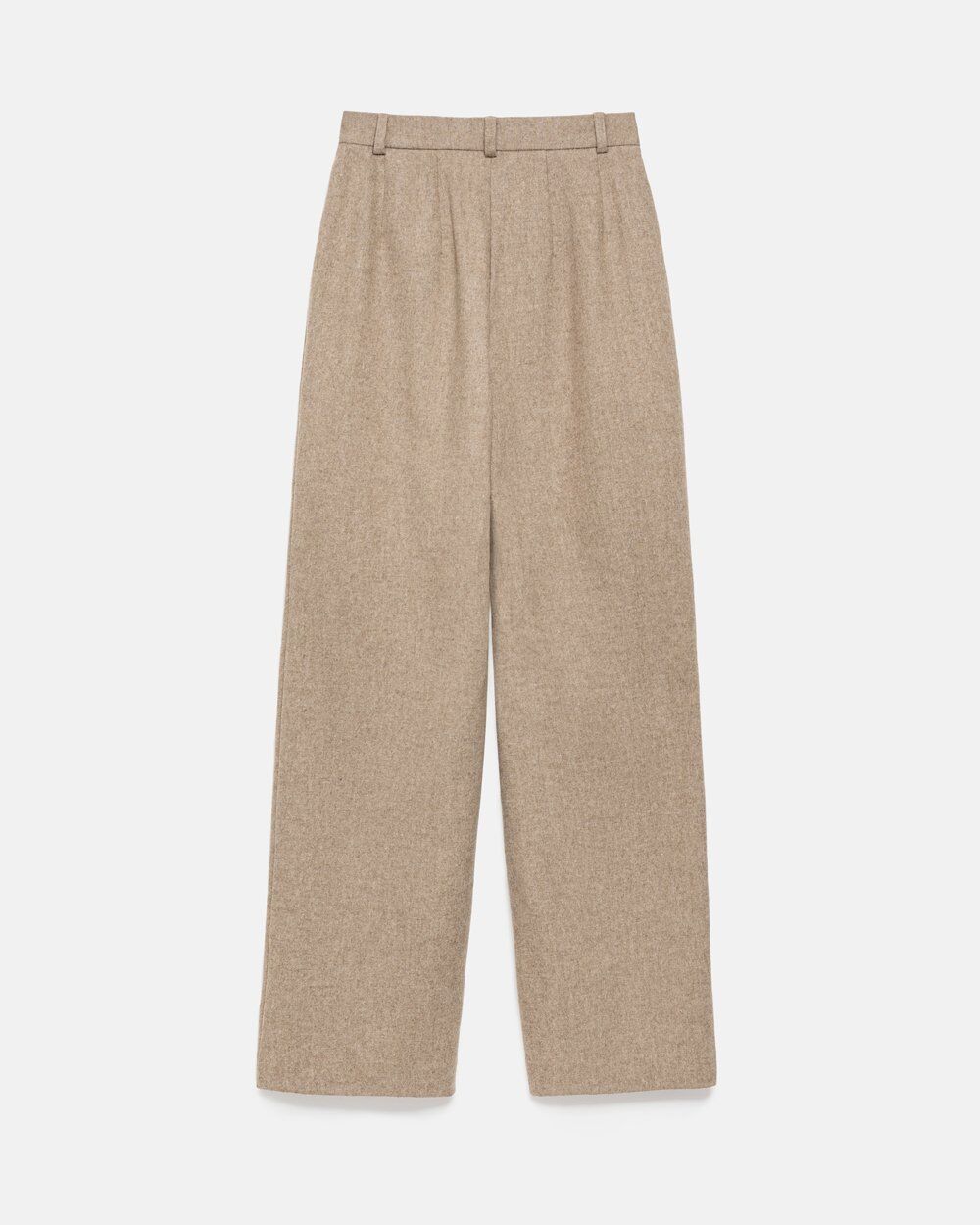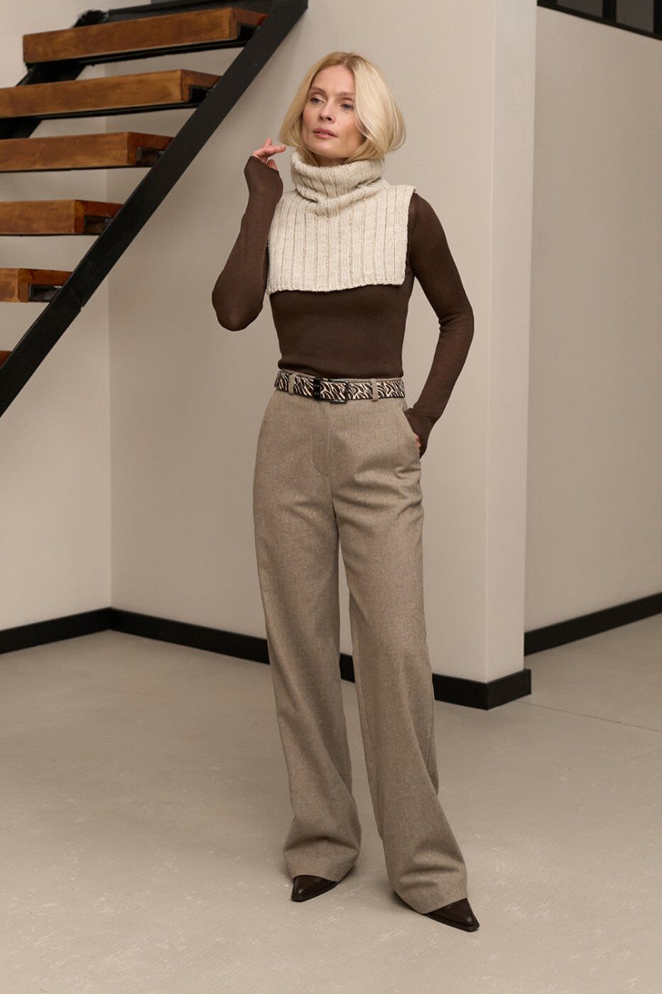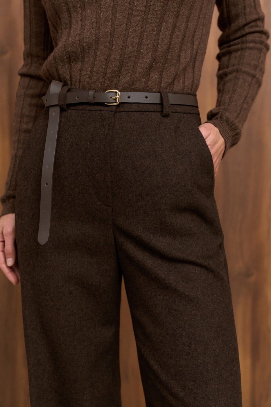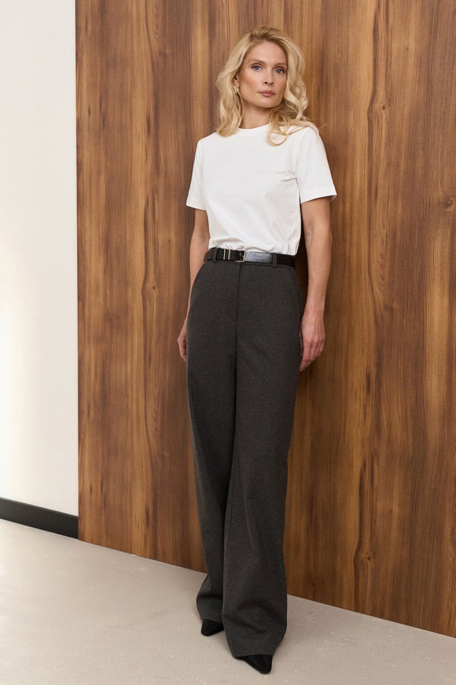 Теплі класичні штани прямого крою, виготовлені з напіввовняної тканини з додаванням віскози та еластану. Модель із високою посадкою та функціональними кишенями.