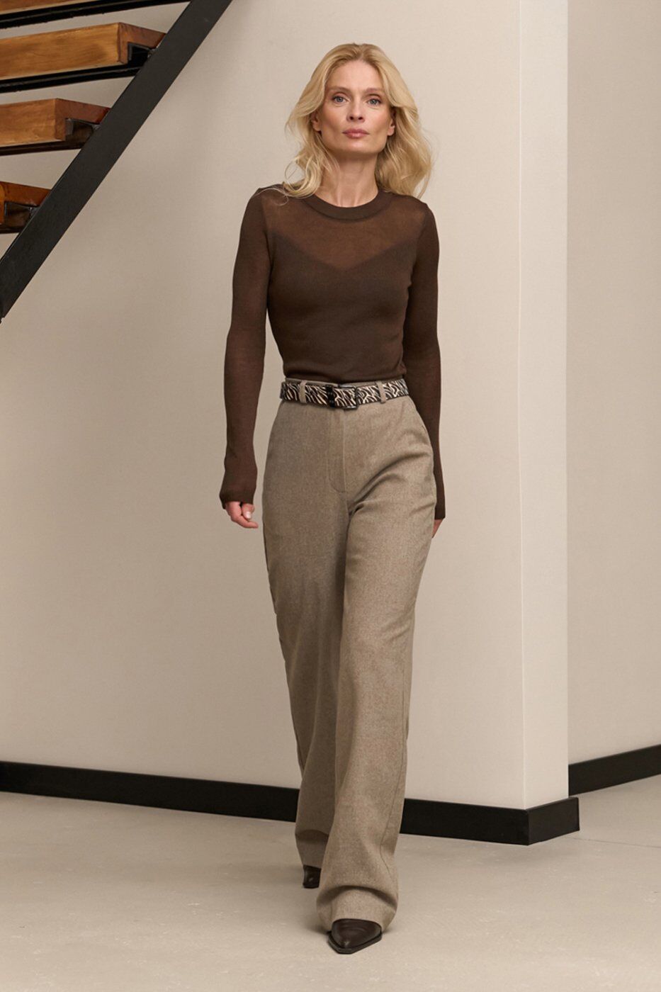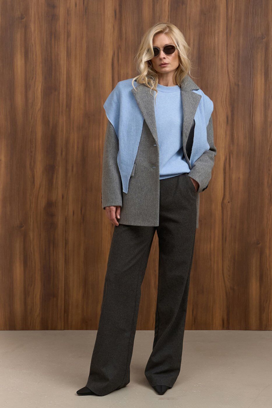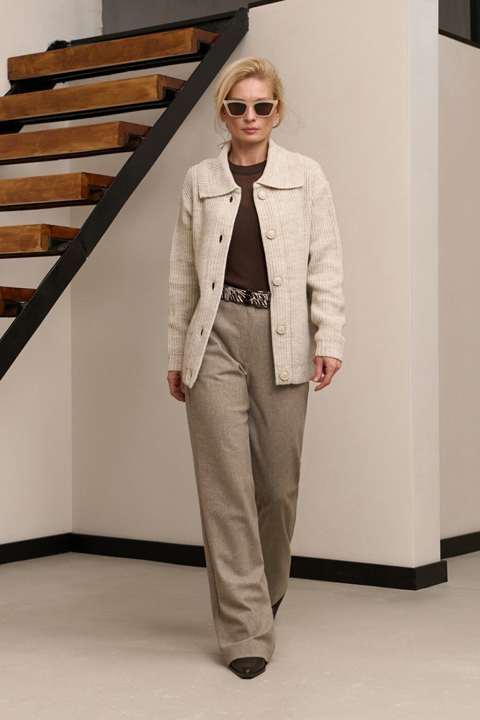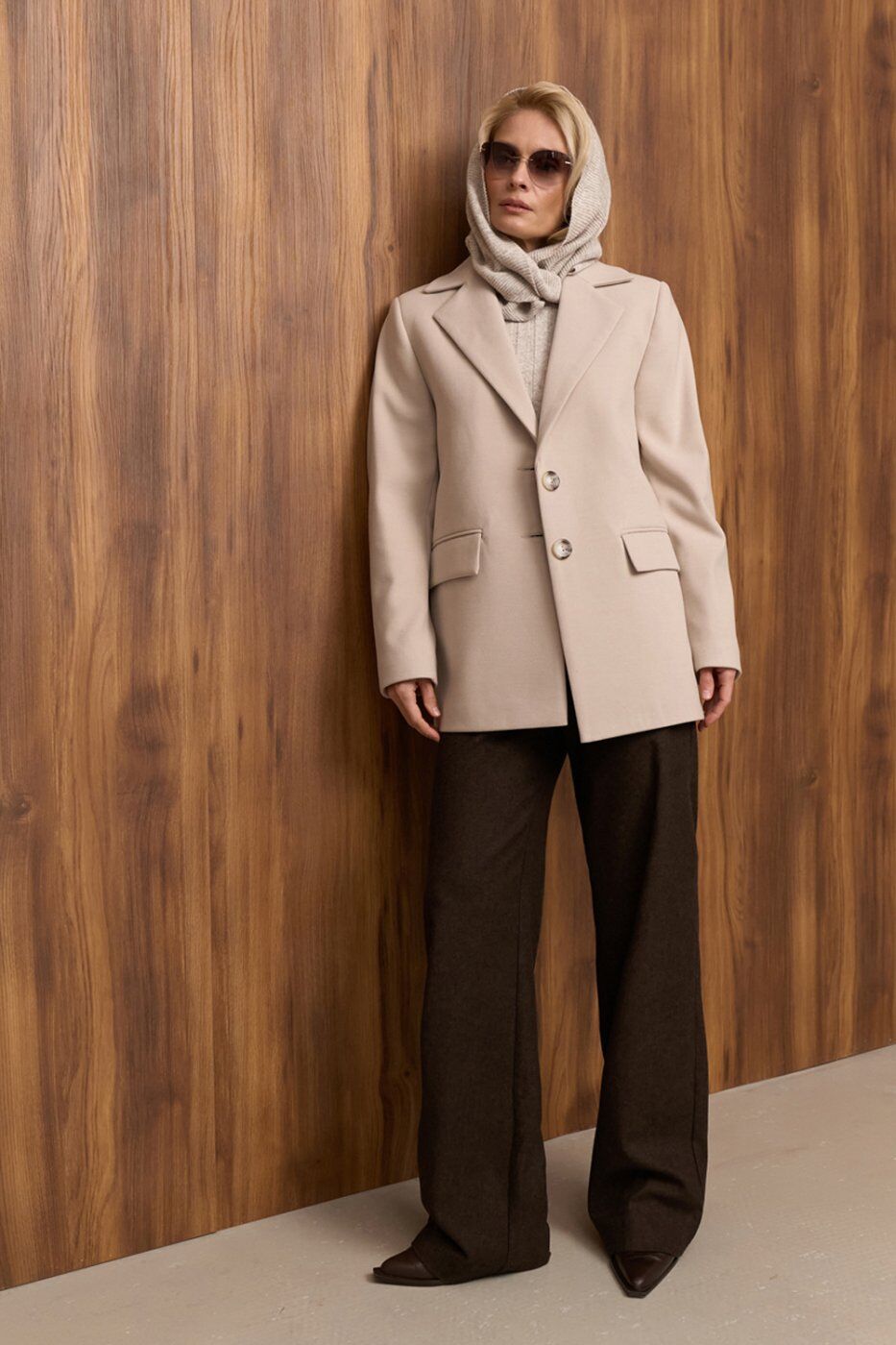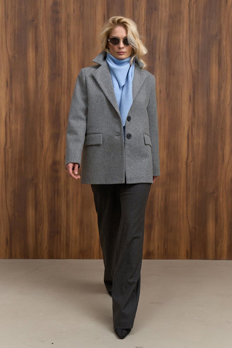Теплі класичні штани прямого крою, виготовлені з напіввовняної тканини з додаванням віскози та еластану. Модель із високою посадкою та функціональними кишенями.