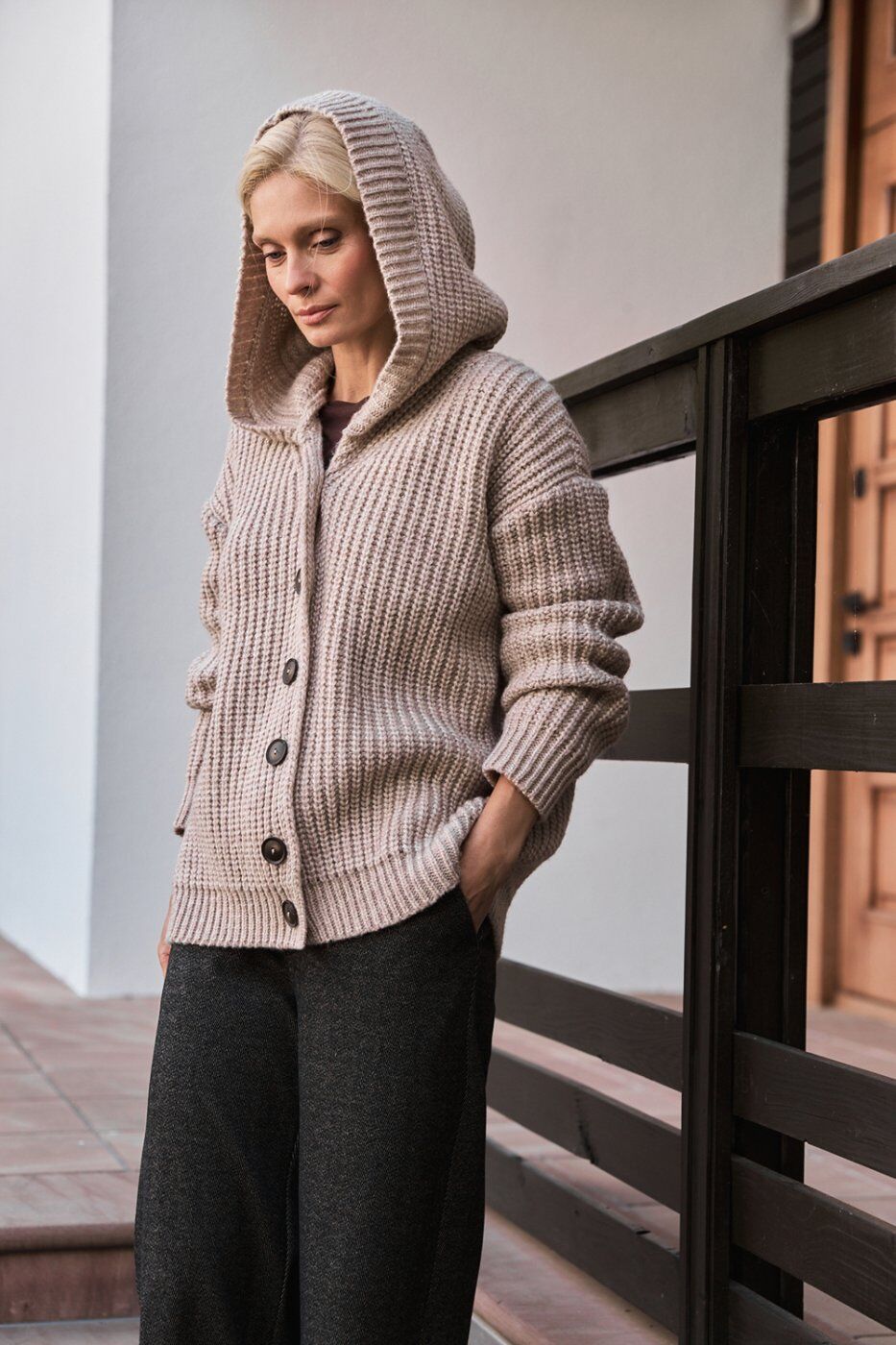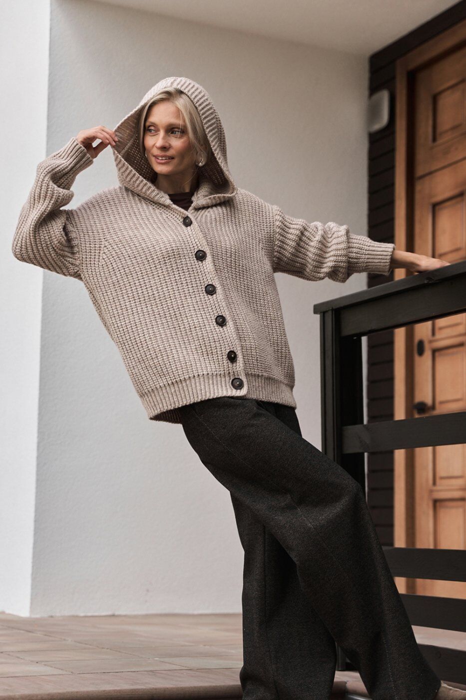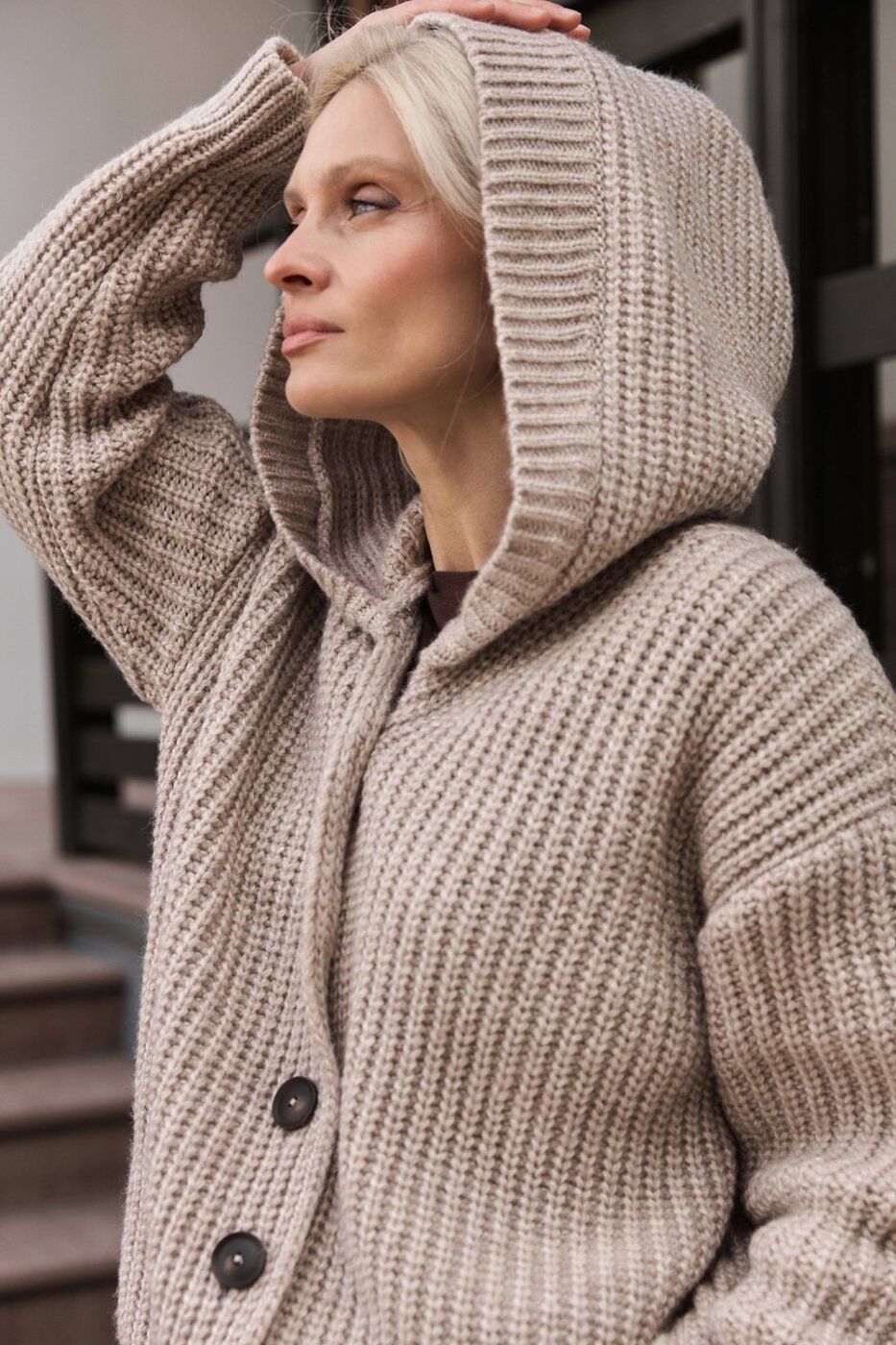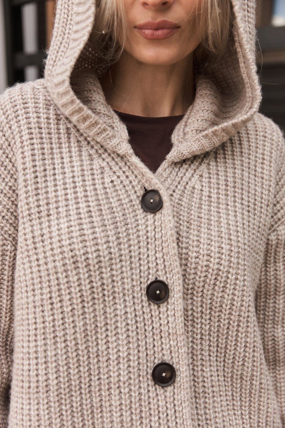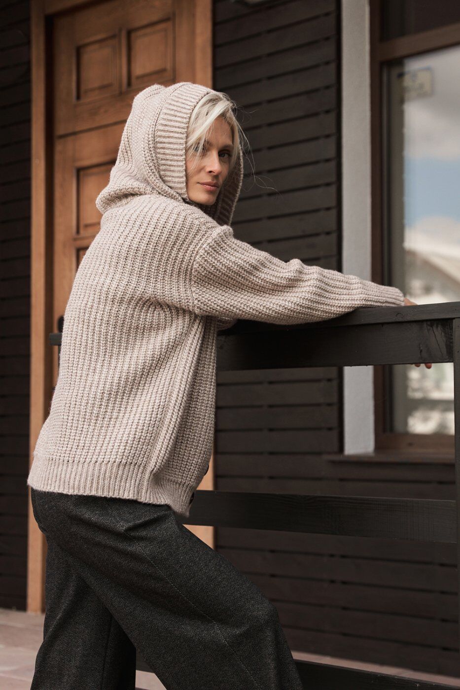 Трендове в’язане пальто об’ємного силуету з капюшоном. Виконане щільною фактурною в’язкою із пряжі з високим вмістом вовною мериноса та альпаки.