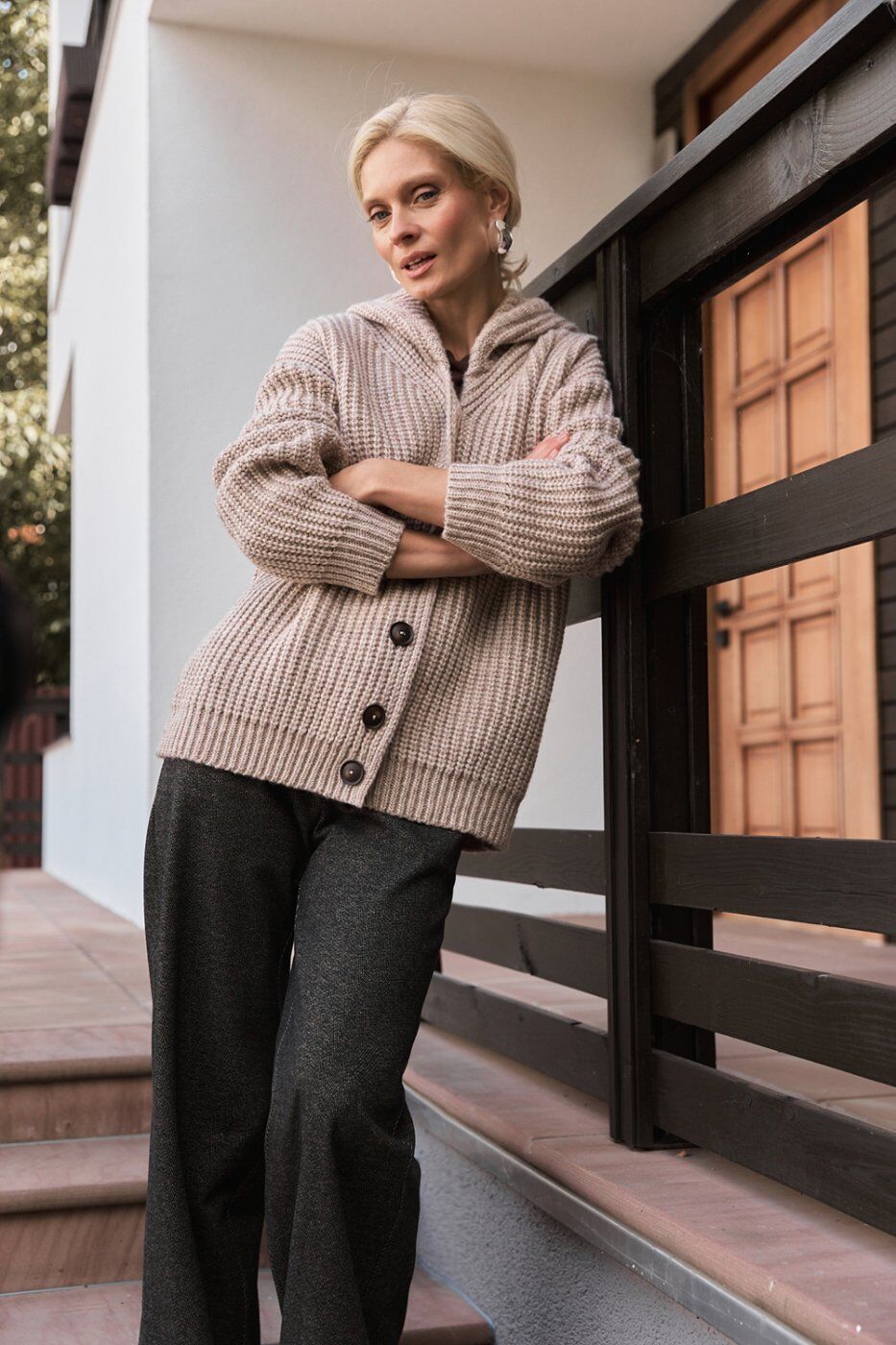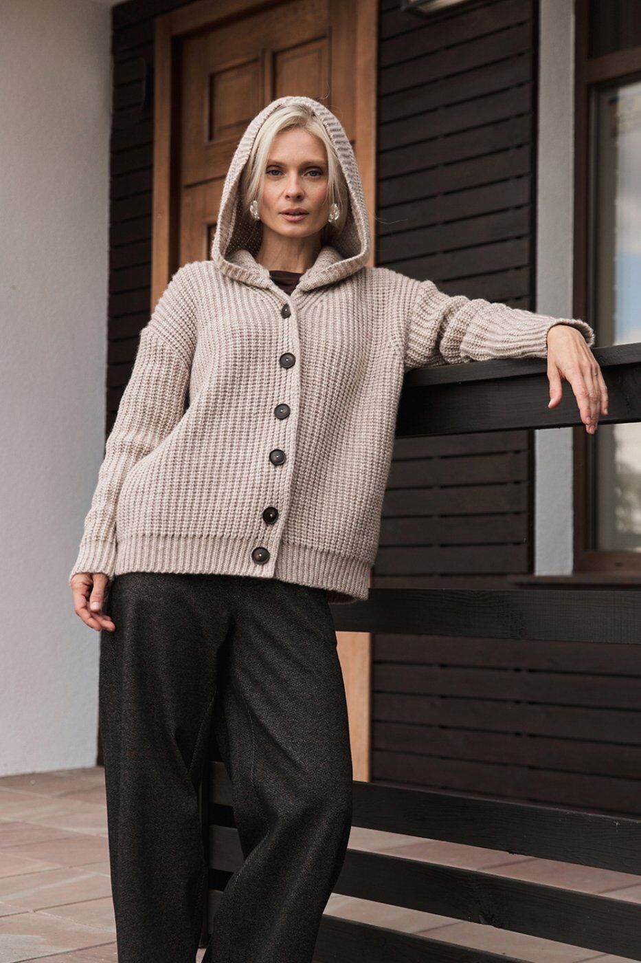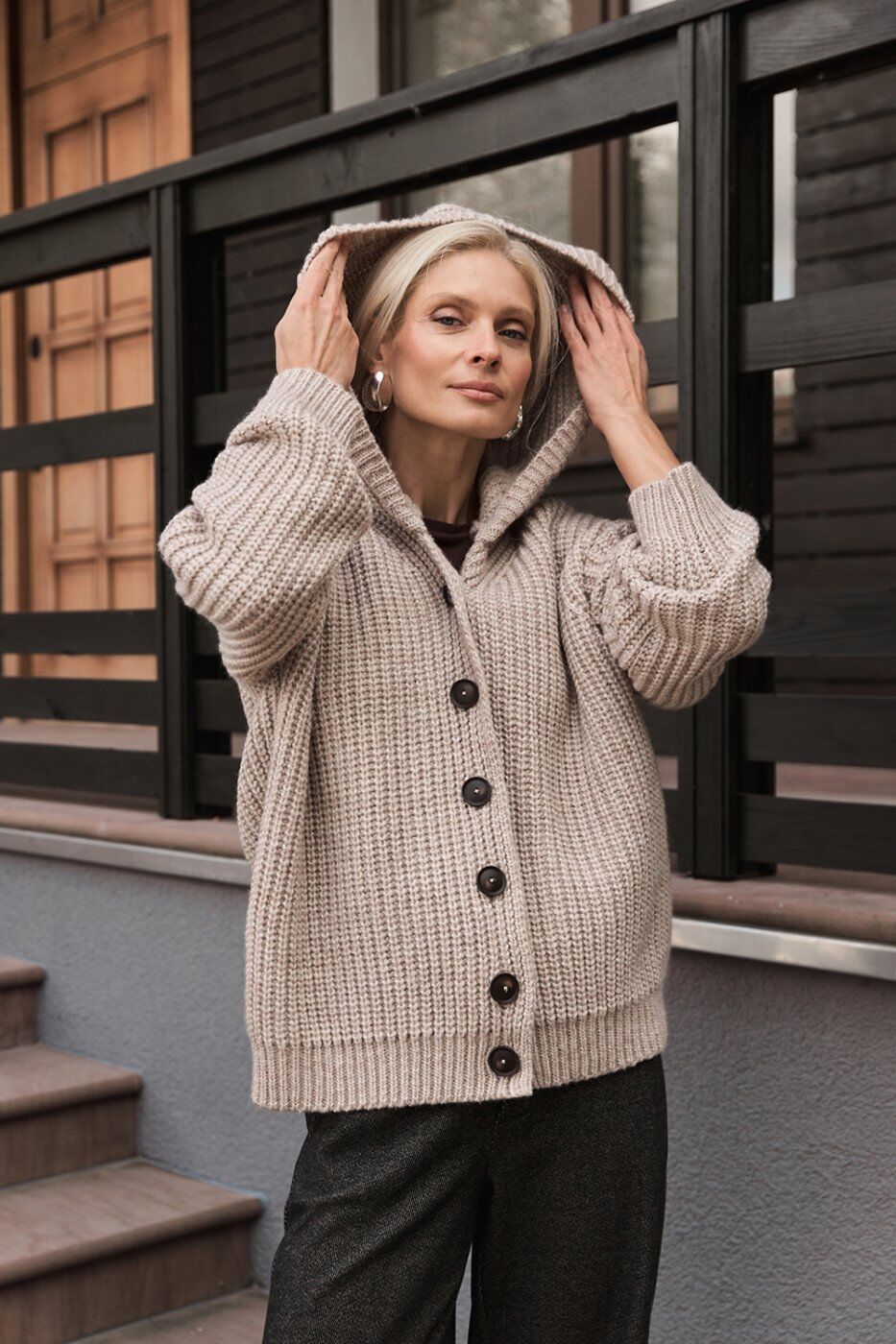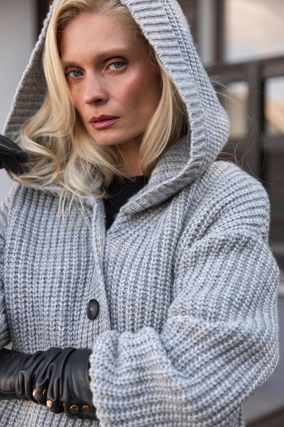Трендове в’язане пальто об’ємного силуету з капюшоном. Виконане щільною фактурною в’язкою із пряжі з високим вмістом вовною мериноса та альпаки.