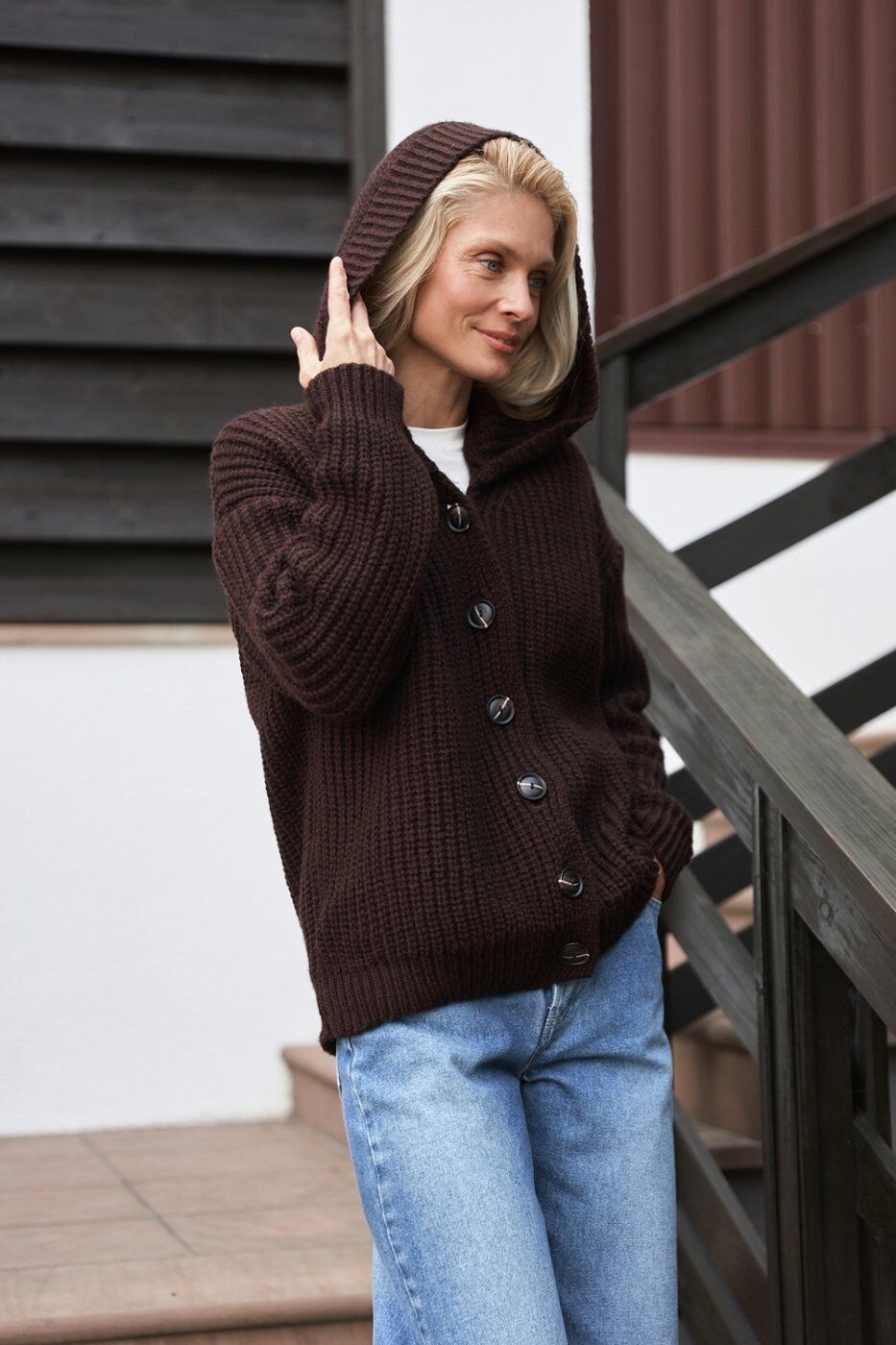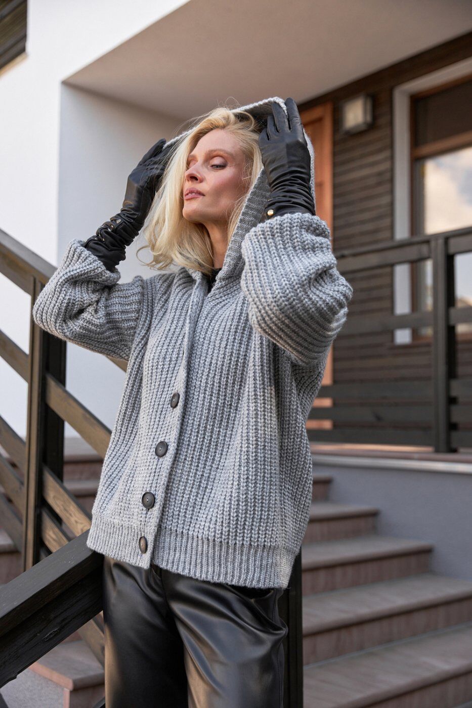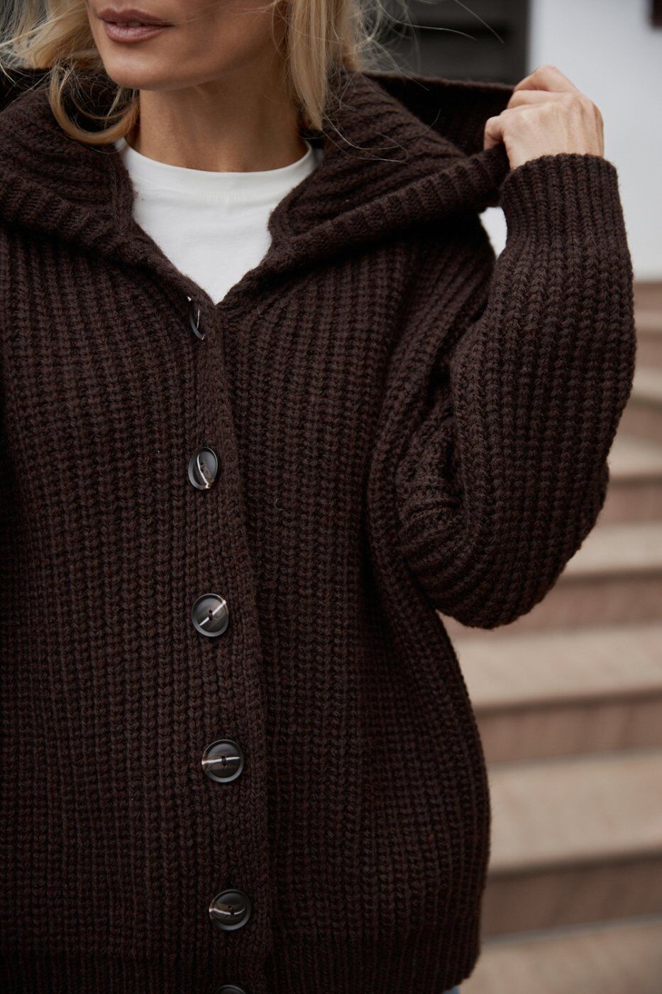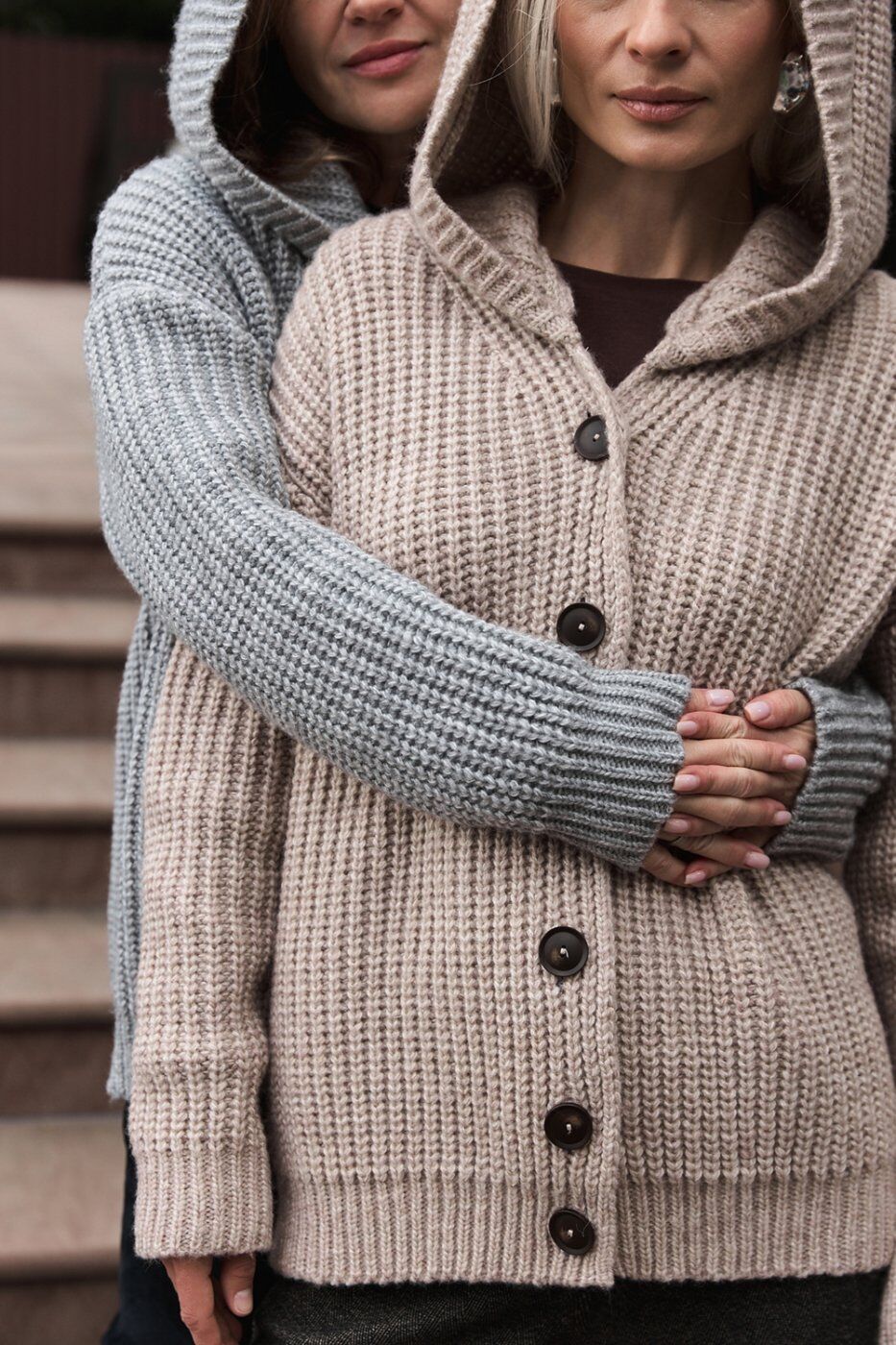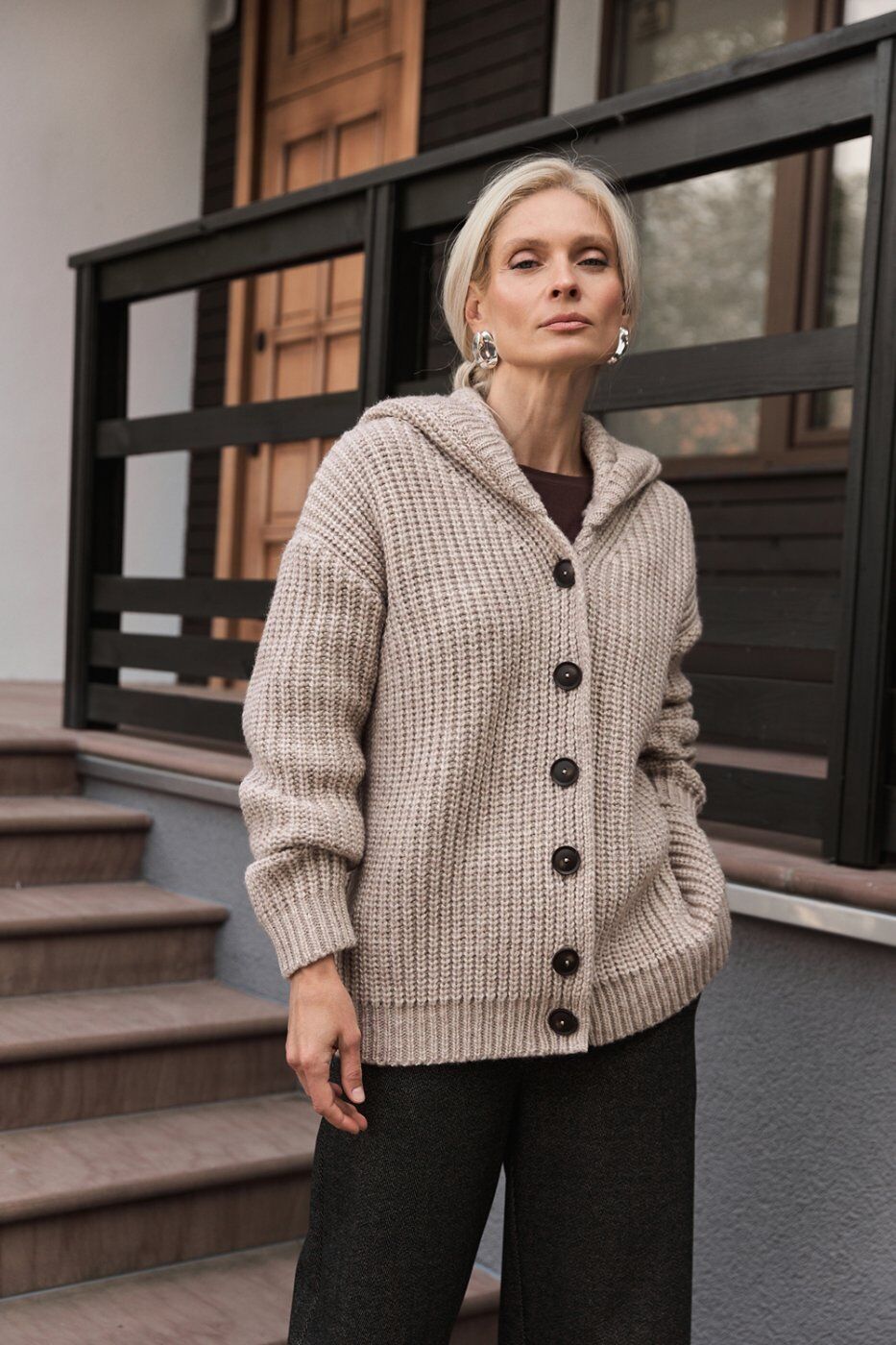 Трендове в’язане пальто об’ємного силуету з капюшоном. Виконане щільною фактурною в’язкою із пряжі з високим вмістом вовною мериноса та альпаки.