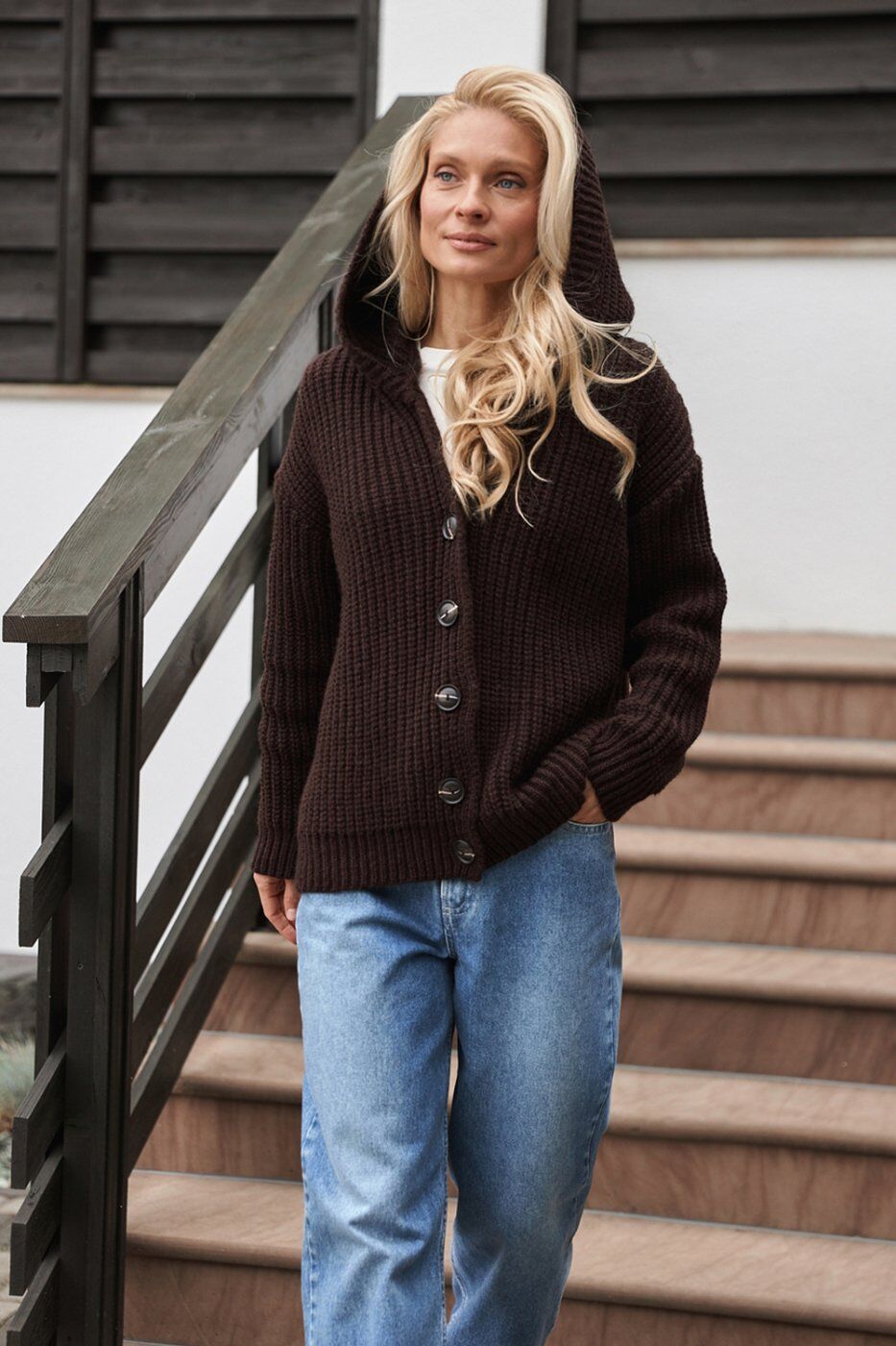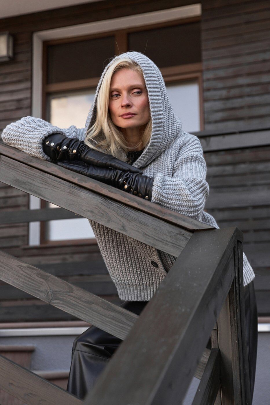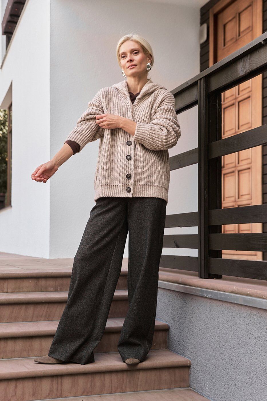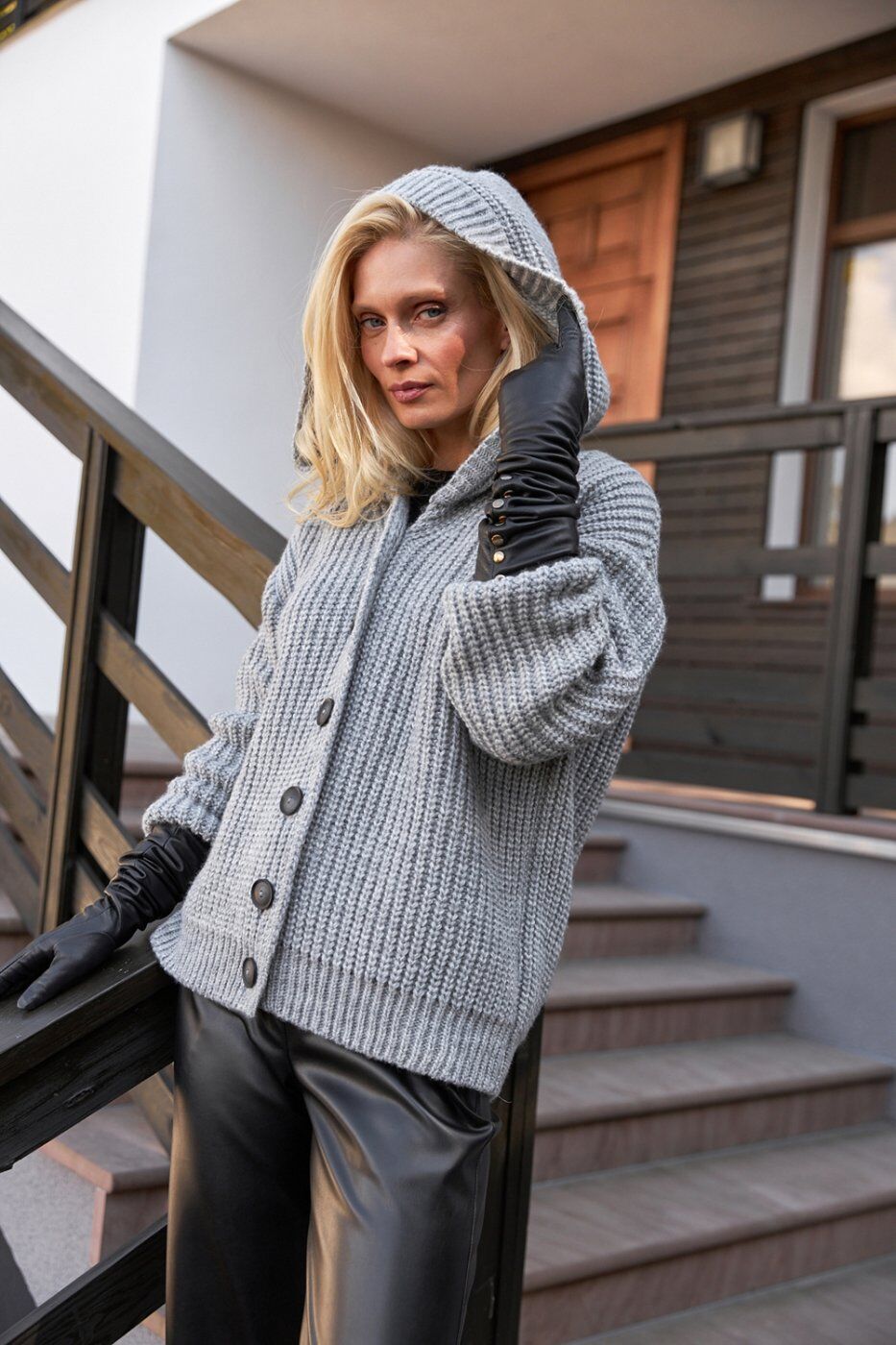 Трендове в’язане пальто об’ємного силуету з капюшоном. Виконане щільною фактурною в’язкою із пряжі з високим вмістом вовною мериноса та альпаки.