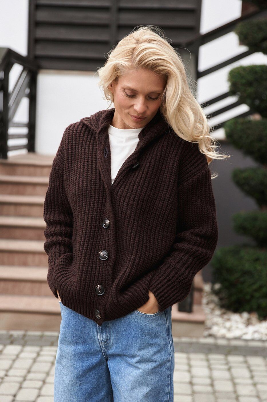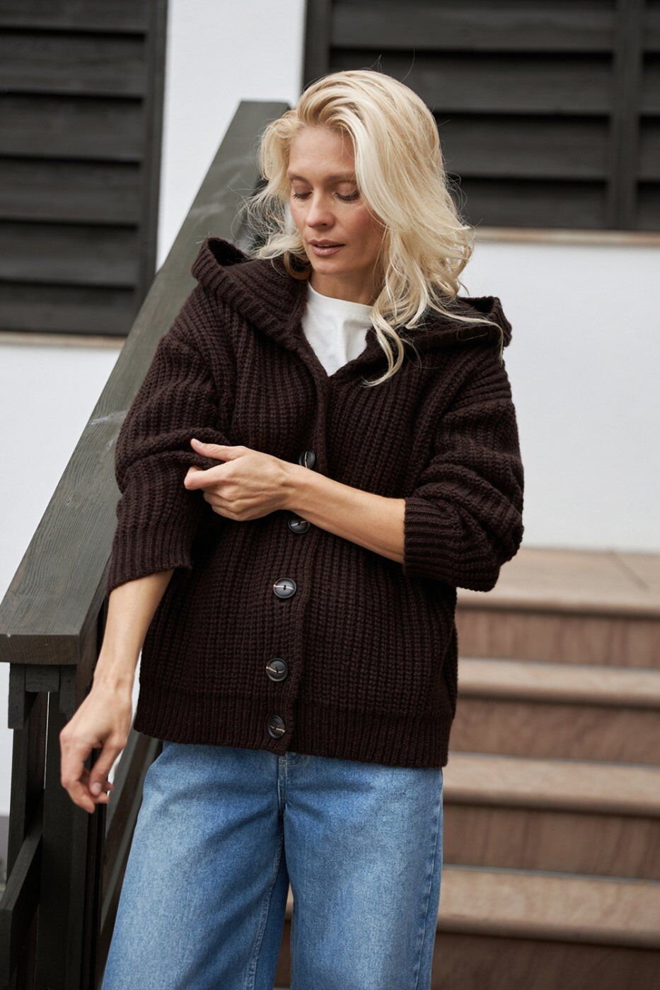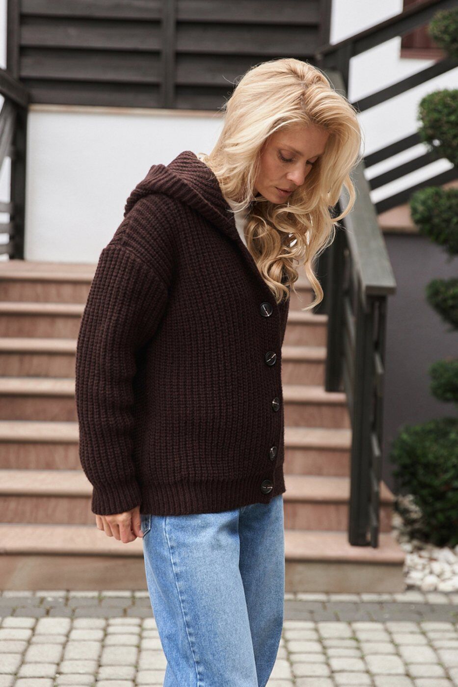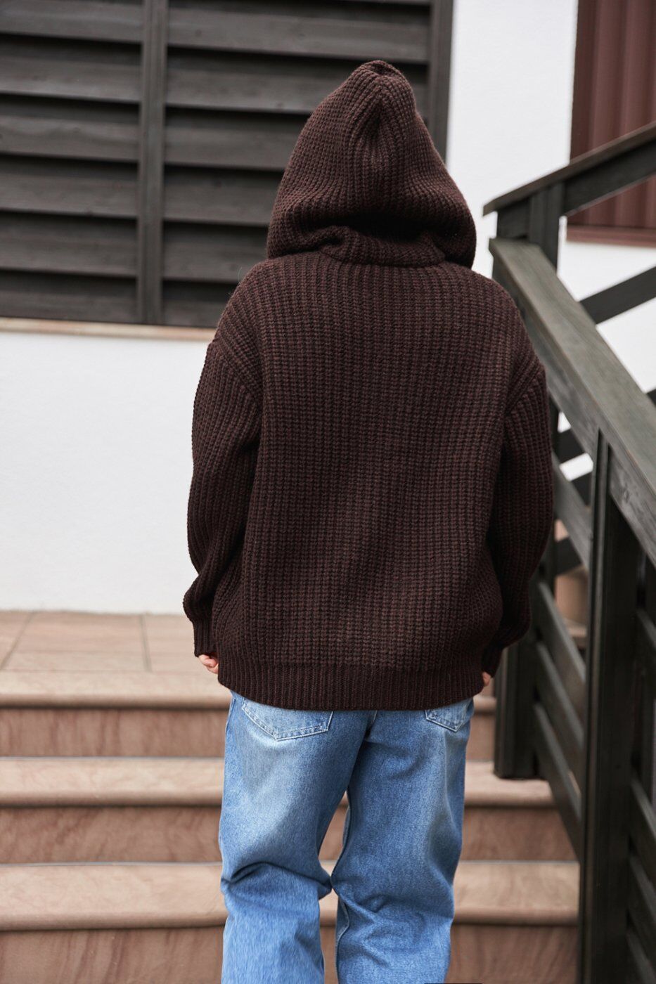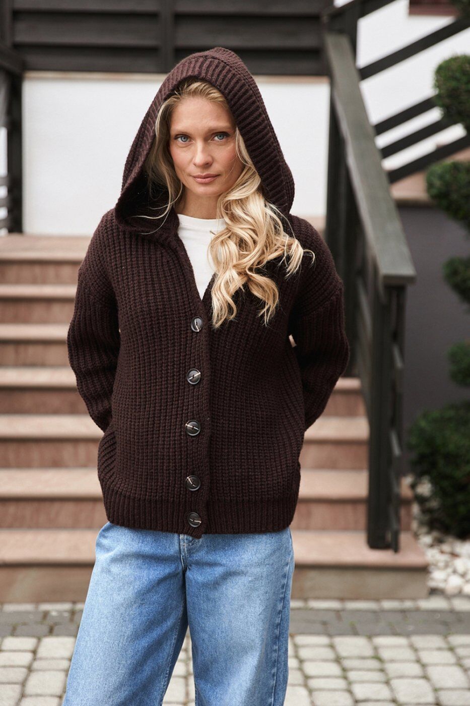 Трендове в’язане пальто об’ємного силуету з капюшоном. Виконане щільною фактурною в’язкою із пряжі з високим вмістом вовною мериноса та альпаки.