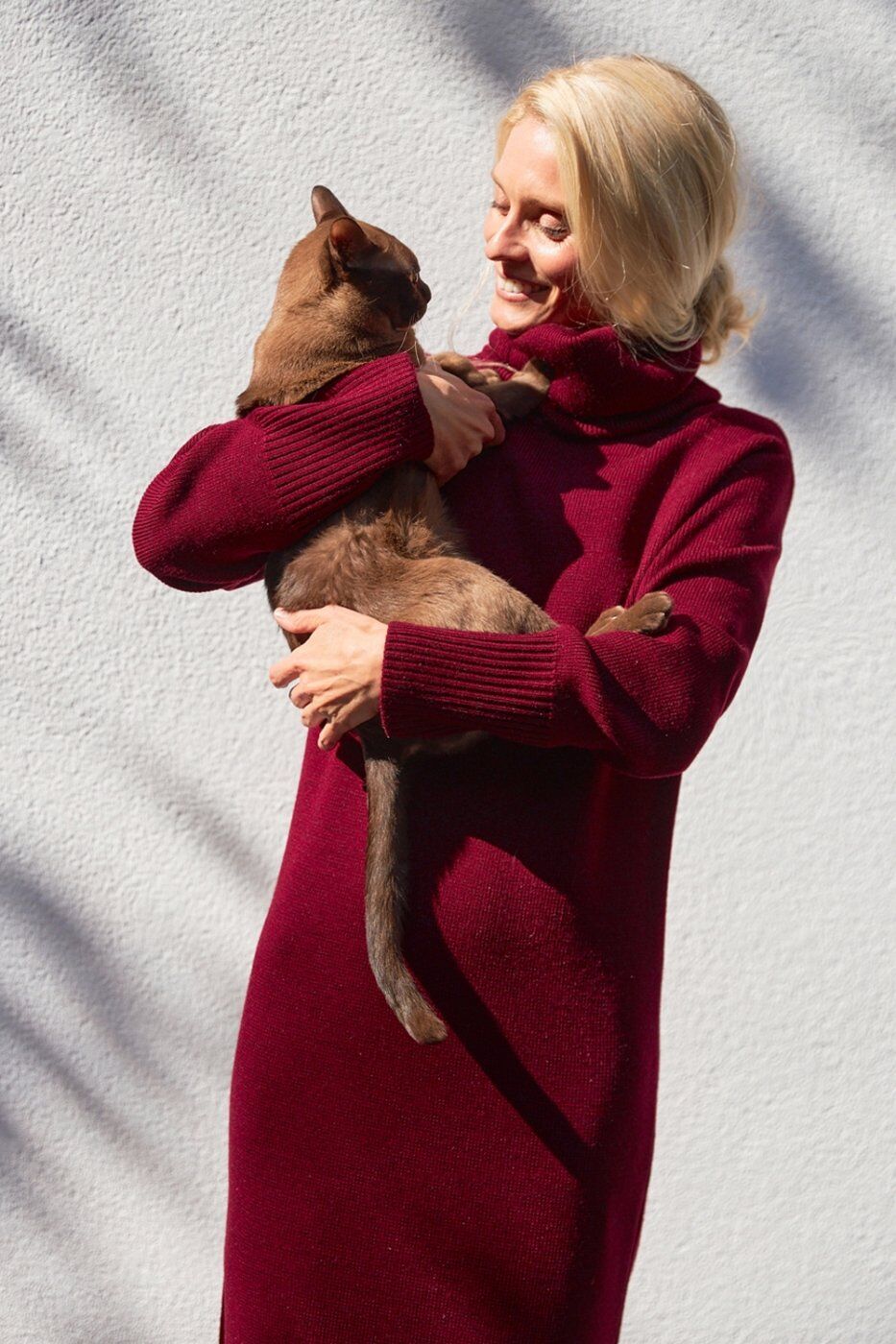 Сукня прямого силуету середньої довжини, виконана з вовняної пряжі щільного, гладкого плетіння.