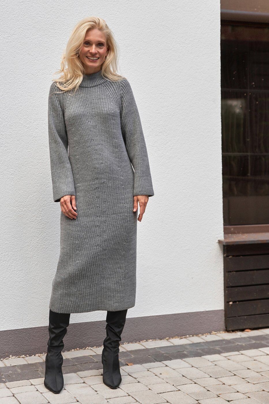 Елегантна сукня міді довжини, виконана з напіввовняної пряжі щільним, стабільним плетінням. Мінімалістичний орнамент попереду додає вишуканості. Комір-стійка ніжно огортає шию.