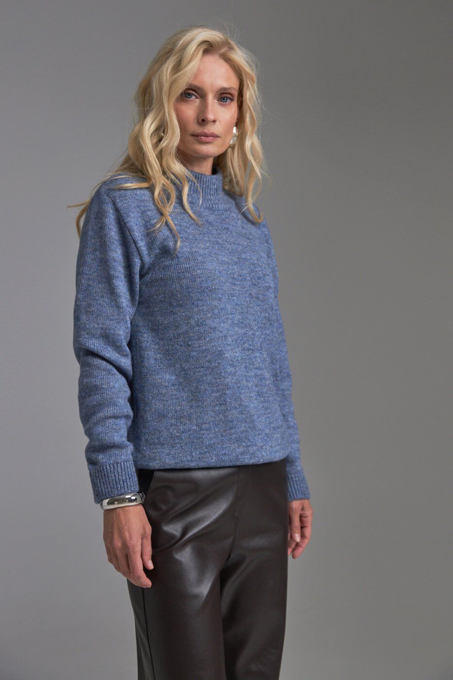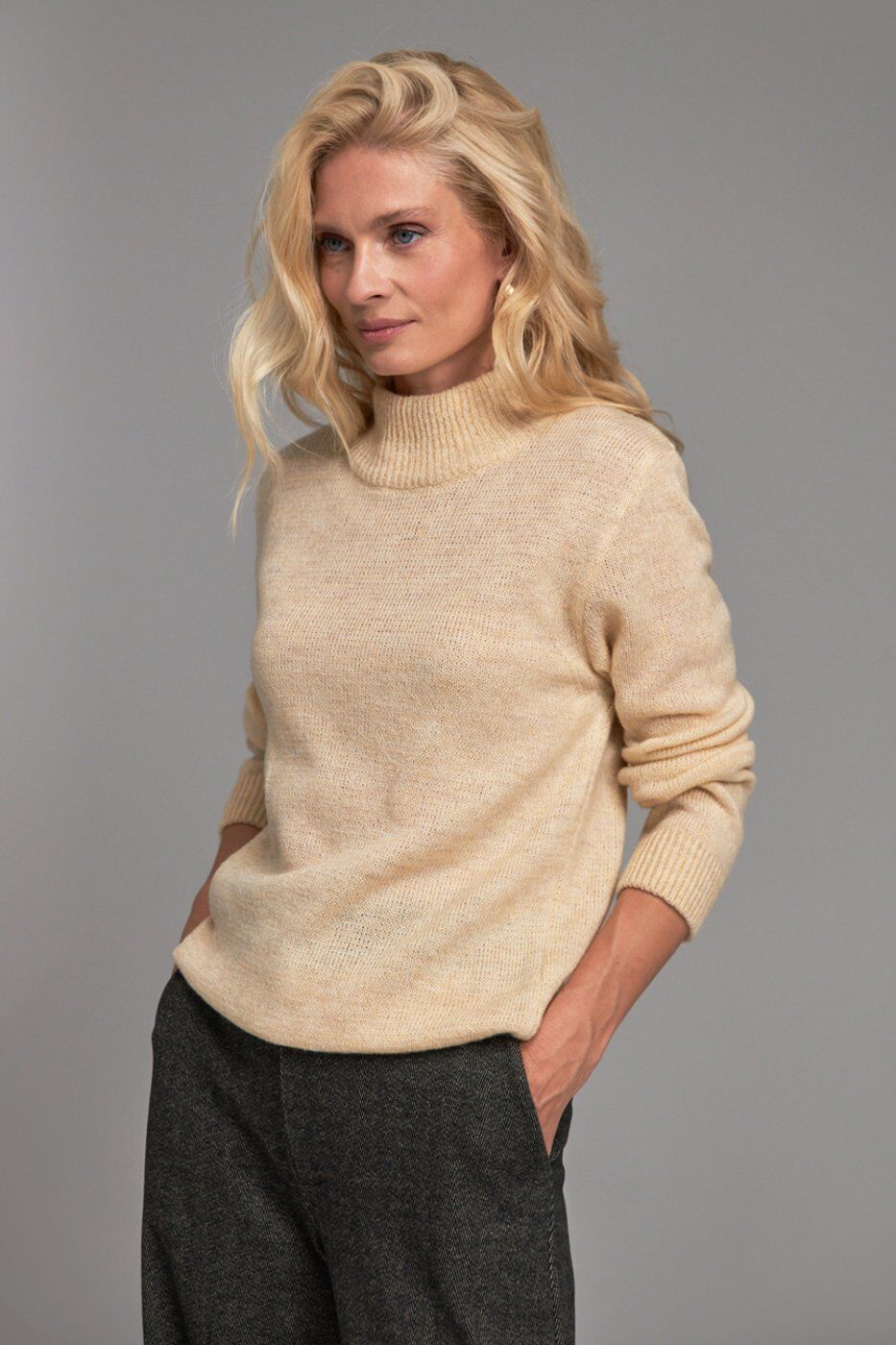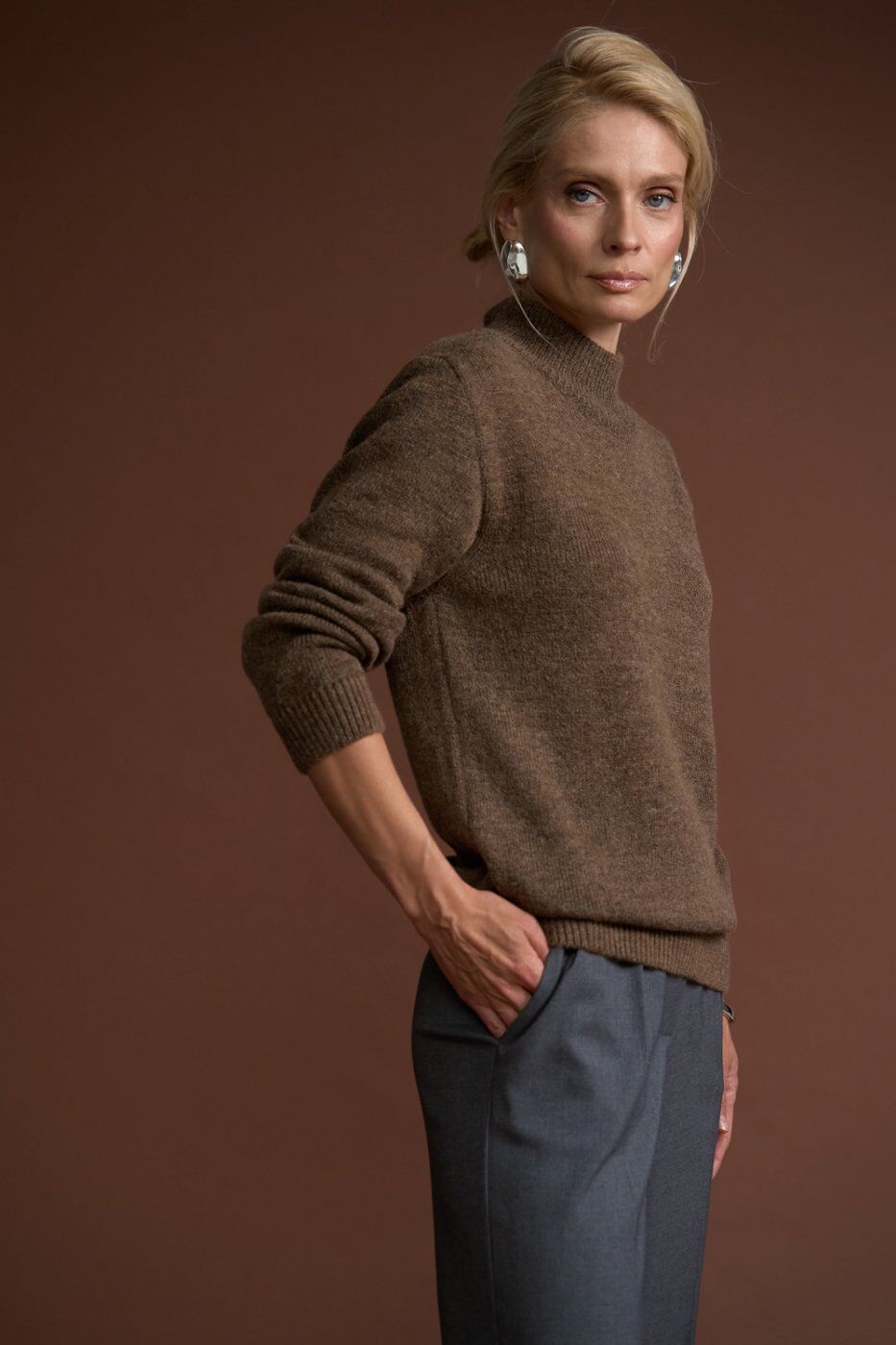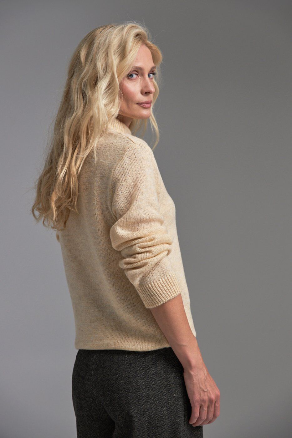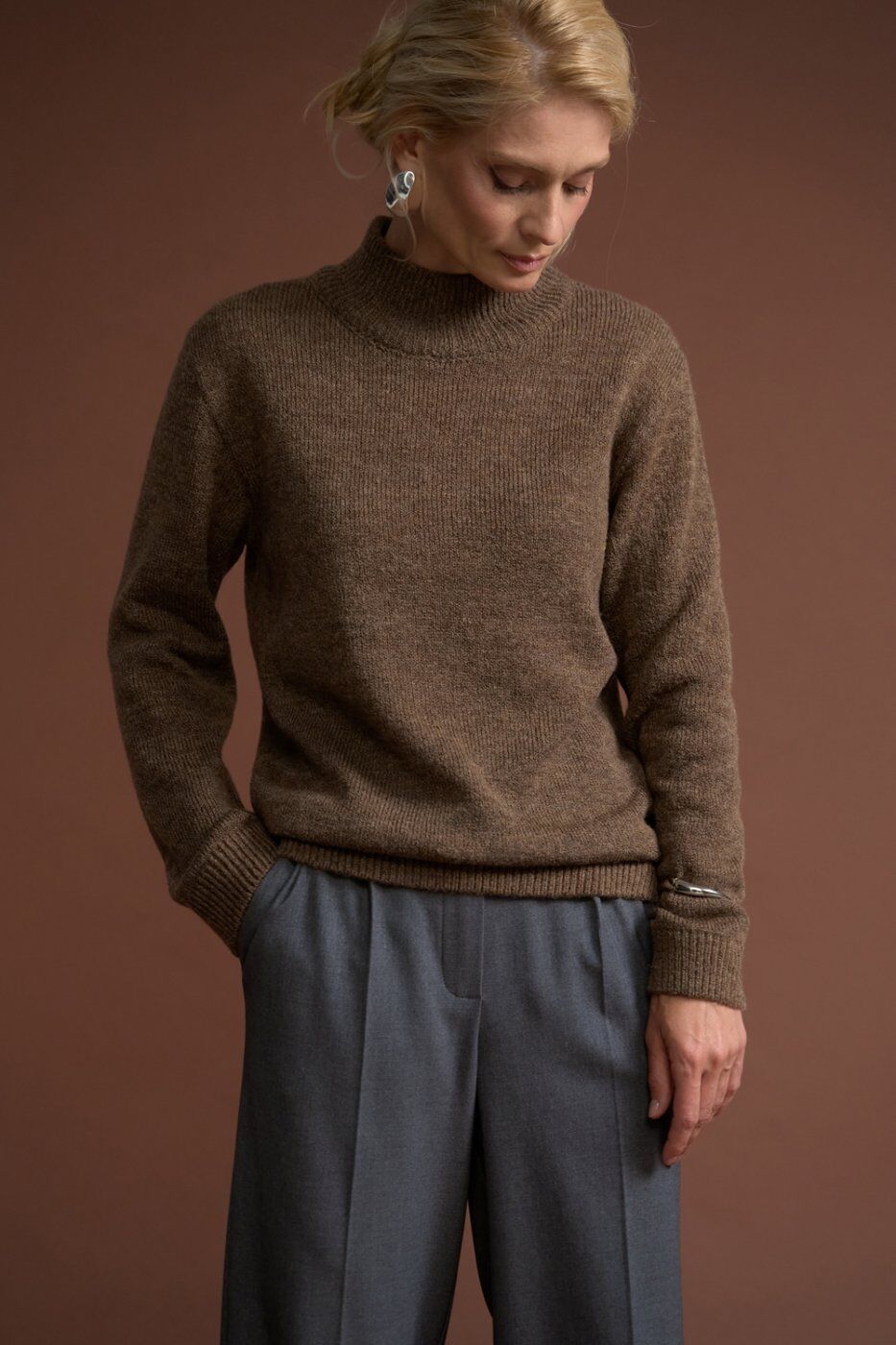 Вовняний светр із коміром-стійкою. Виріб вільного силуету зі спущеною лінією плеча. Виріб виконаний тонкою, гладкою в'язкою із преміальної пряжі, що містить вовну мериноса, альпаки та мохер.