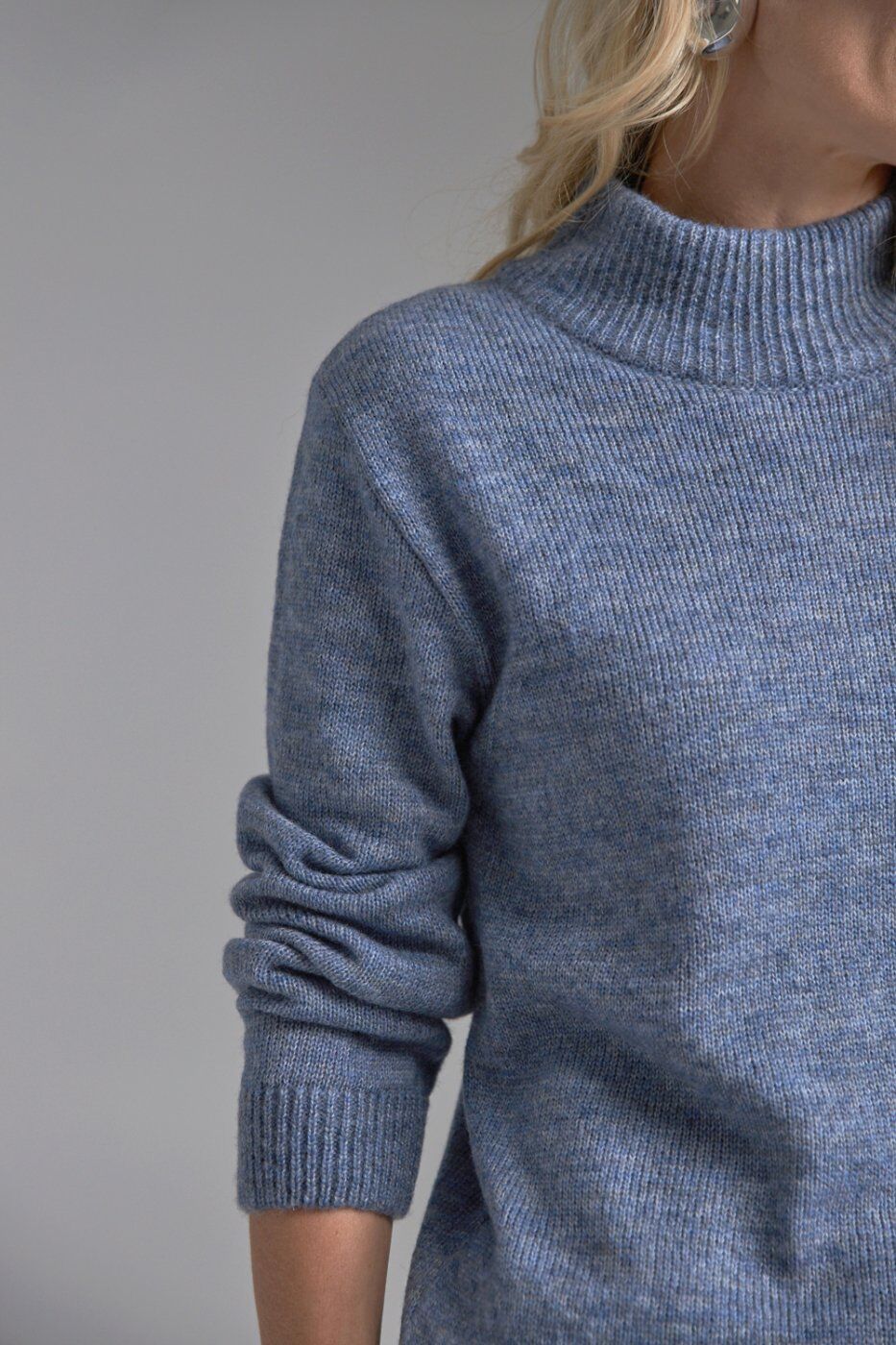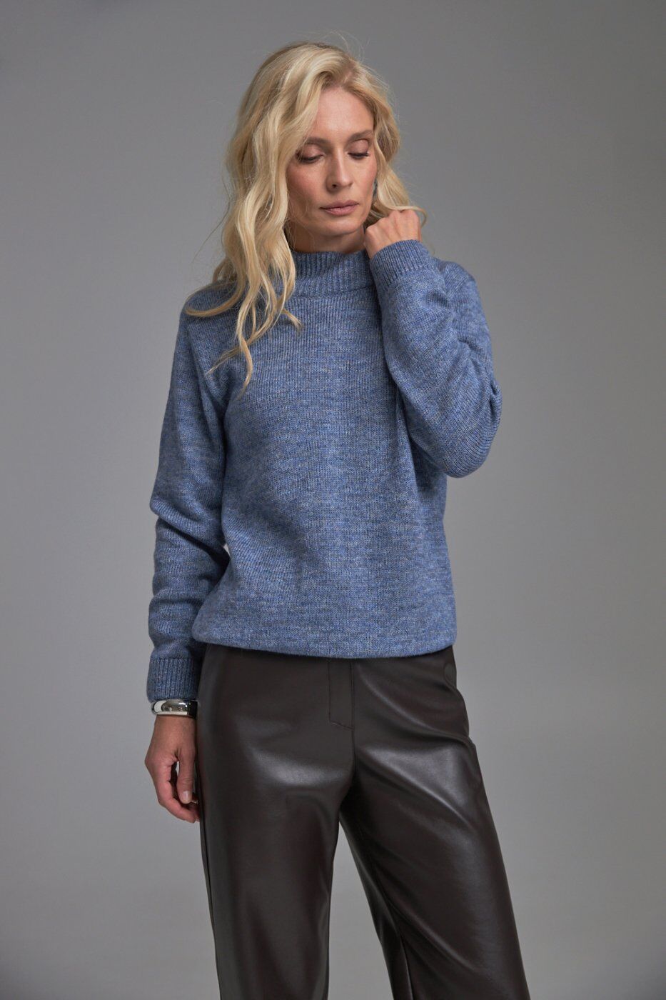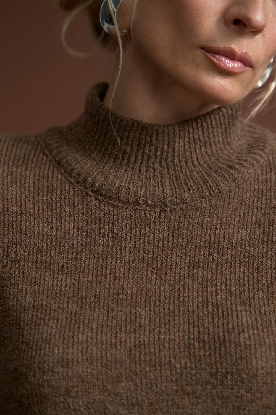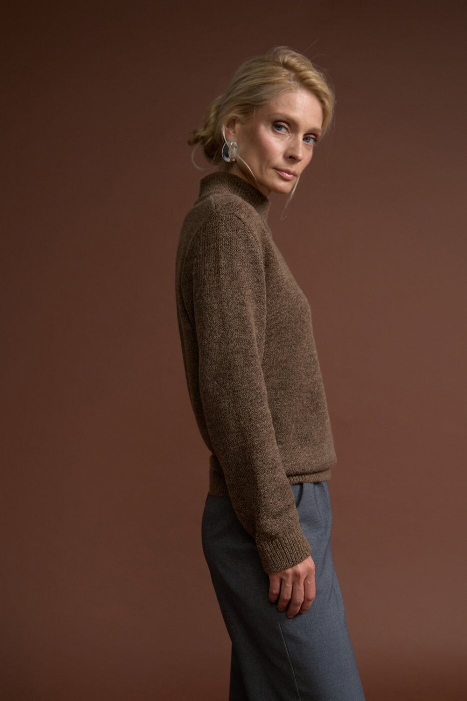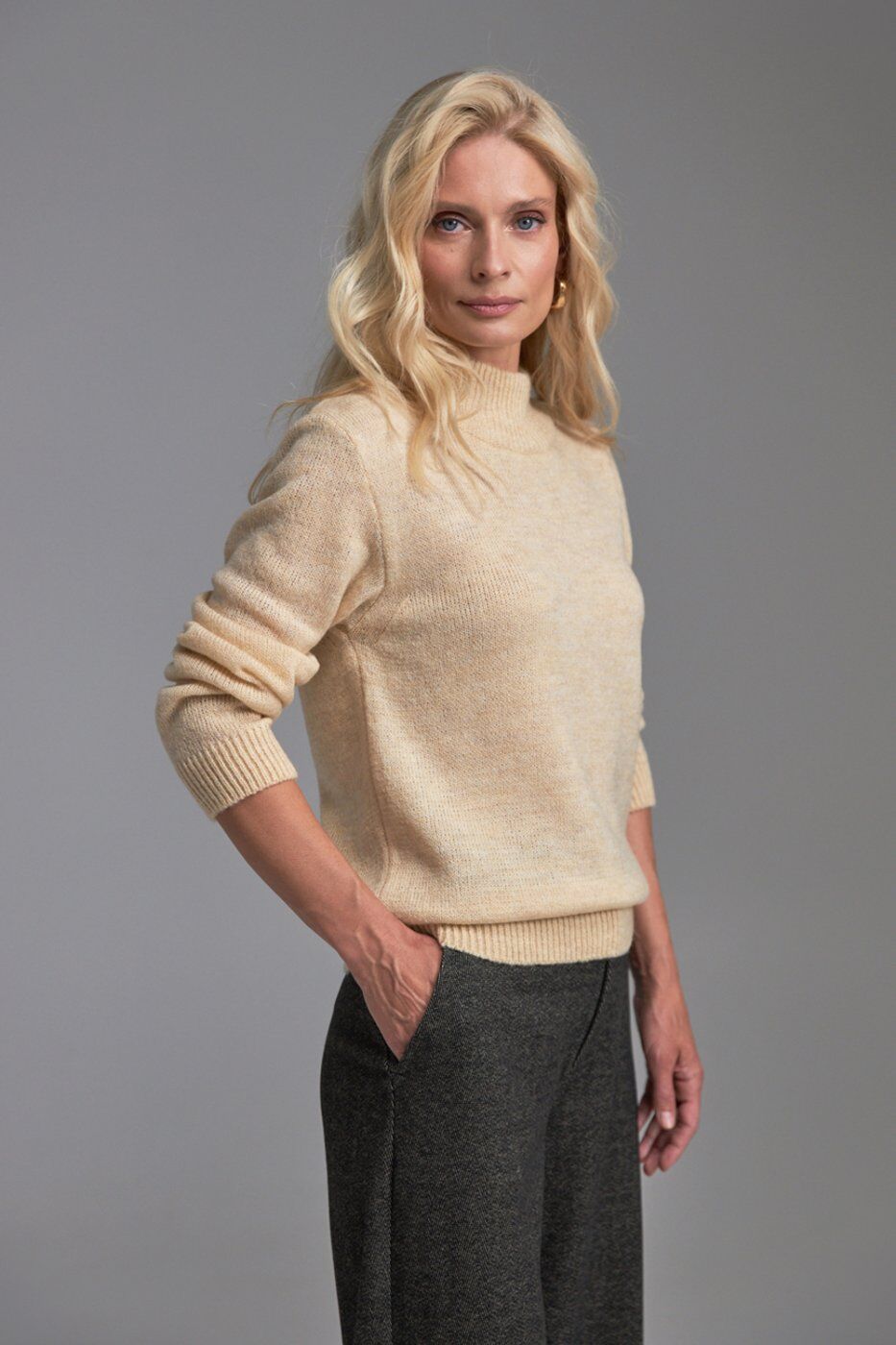Вовняний светр із коміром-стійкою. Виріб вільного силуету зі спущеною лінією плеча. Виріб виконаний тонкою, гладкою в'язкою із преміальної пряжі, що містить вовну мериноса, альпаки та мохер.