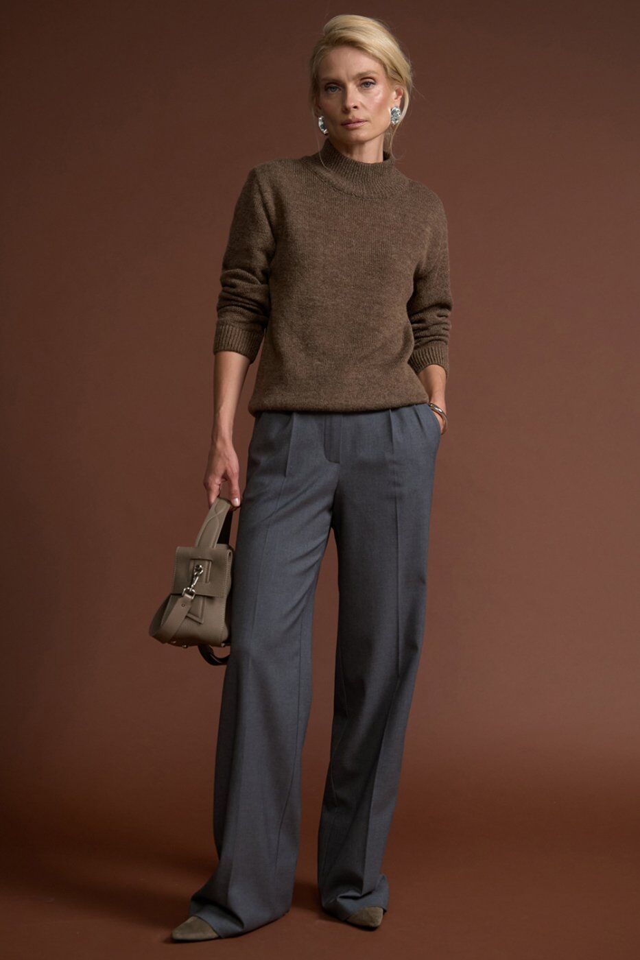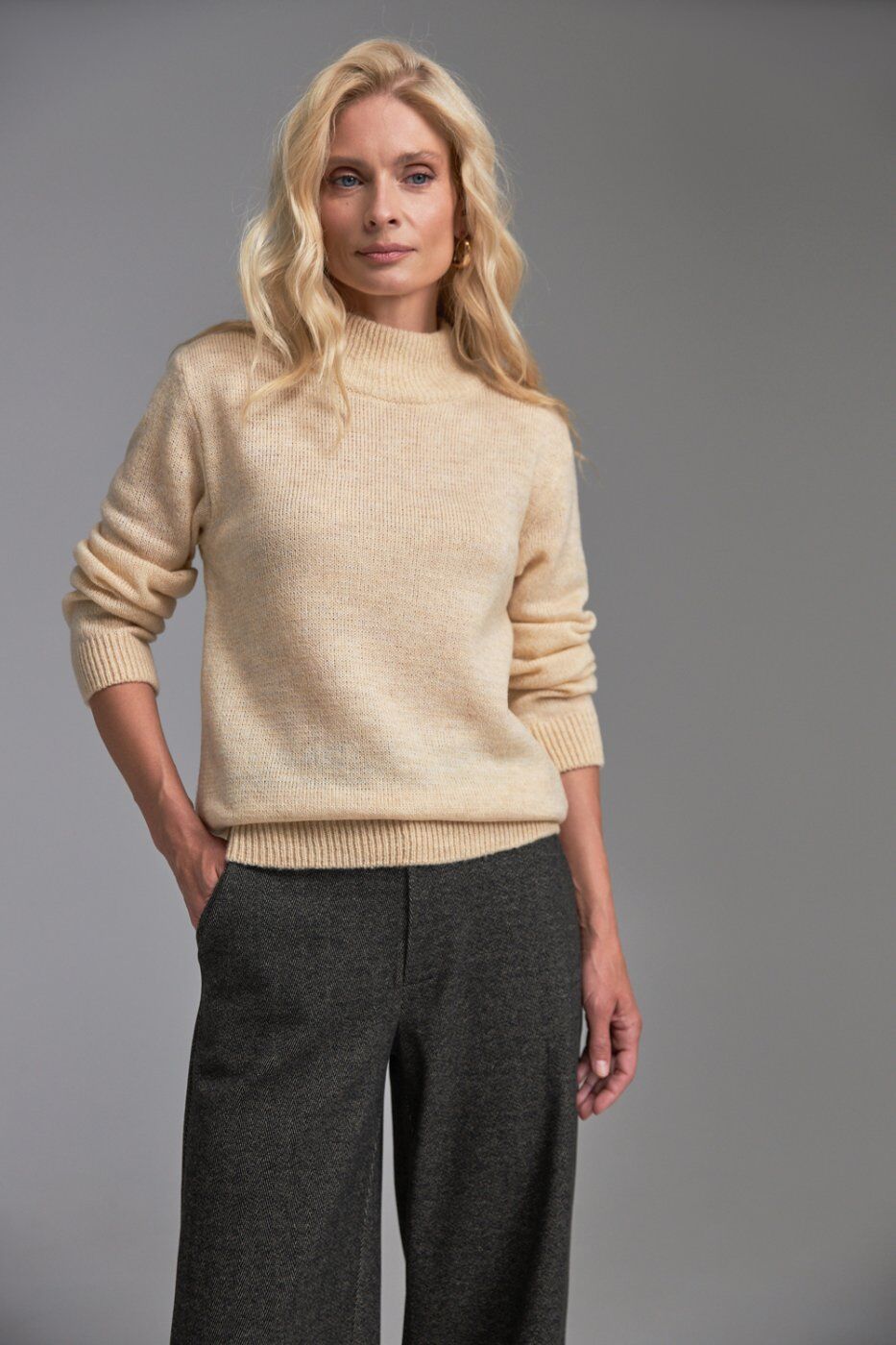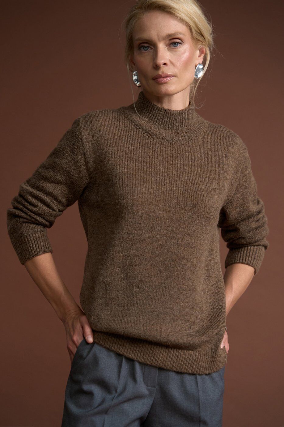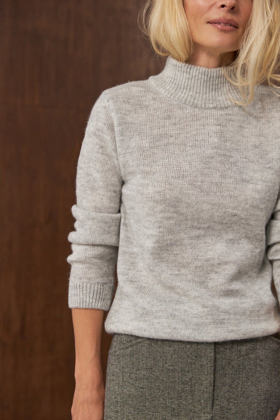 Вовняний светр із коміром-стійкою. Виріб вільного силуету зі спущеною лінією плеча. Виріб виконаний тонкою, гладкою в'язкою із преміальної пряжі, що містить вовну мериноса, альпаки та мохер.