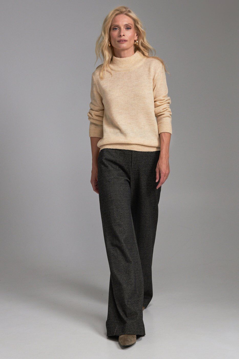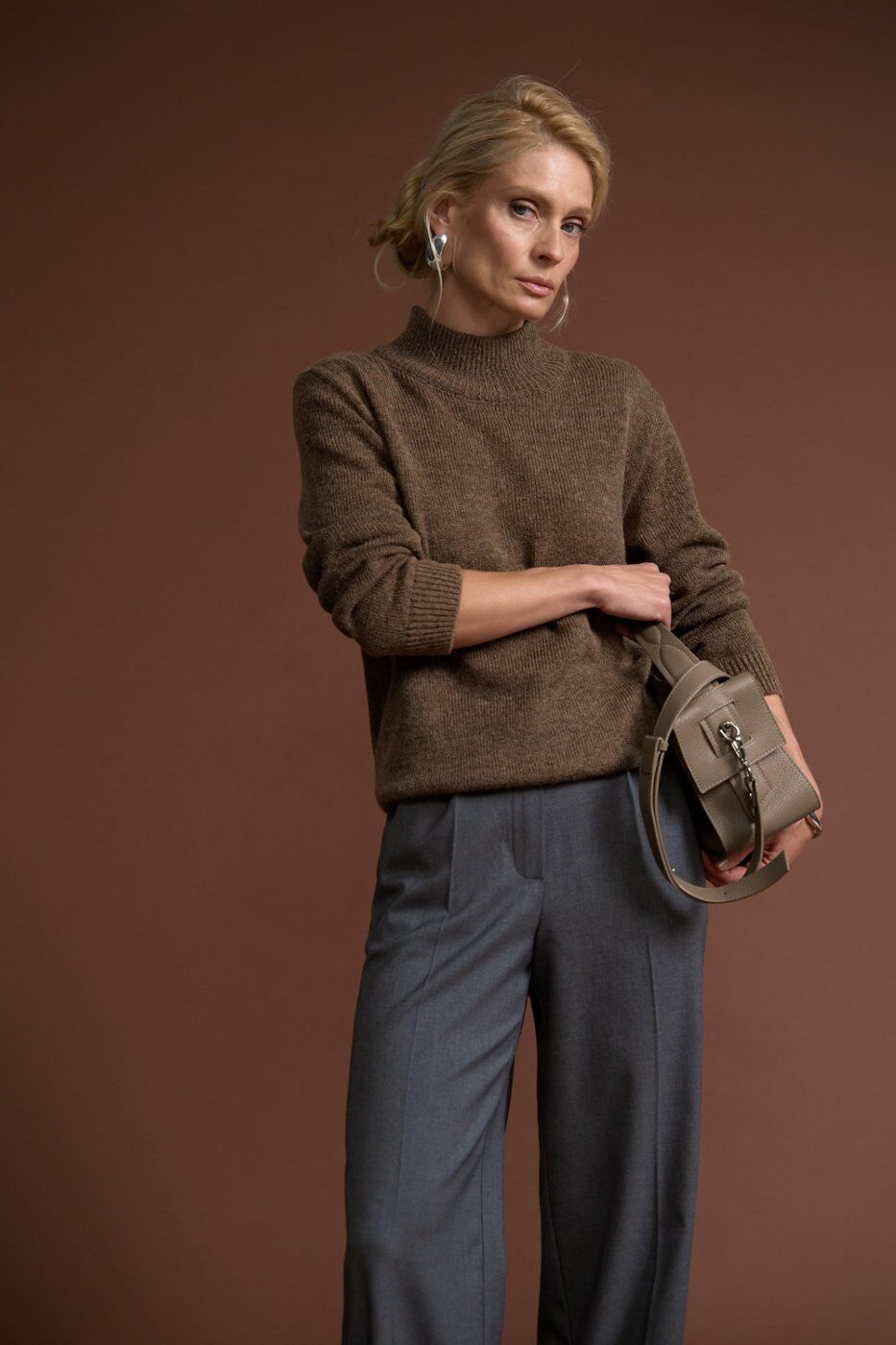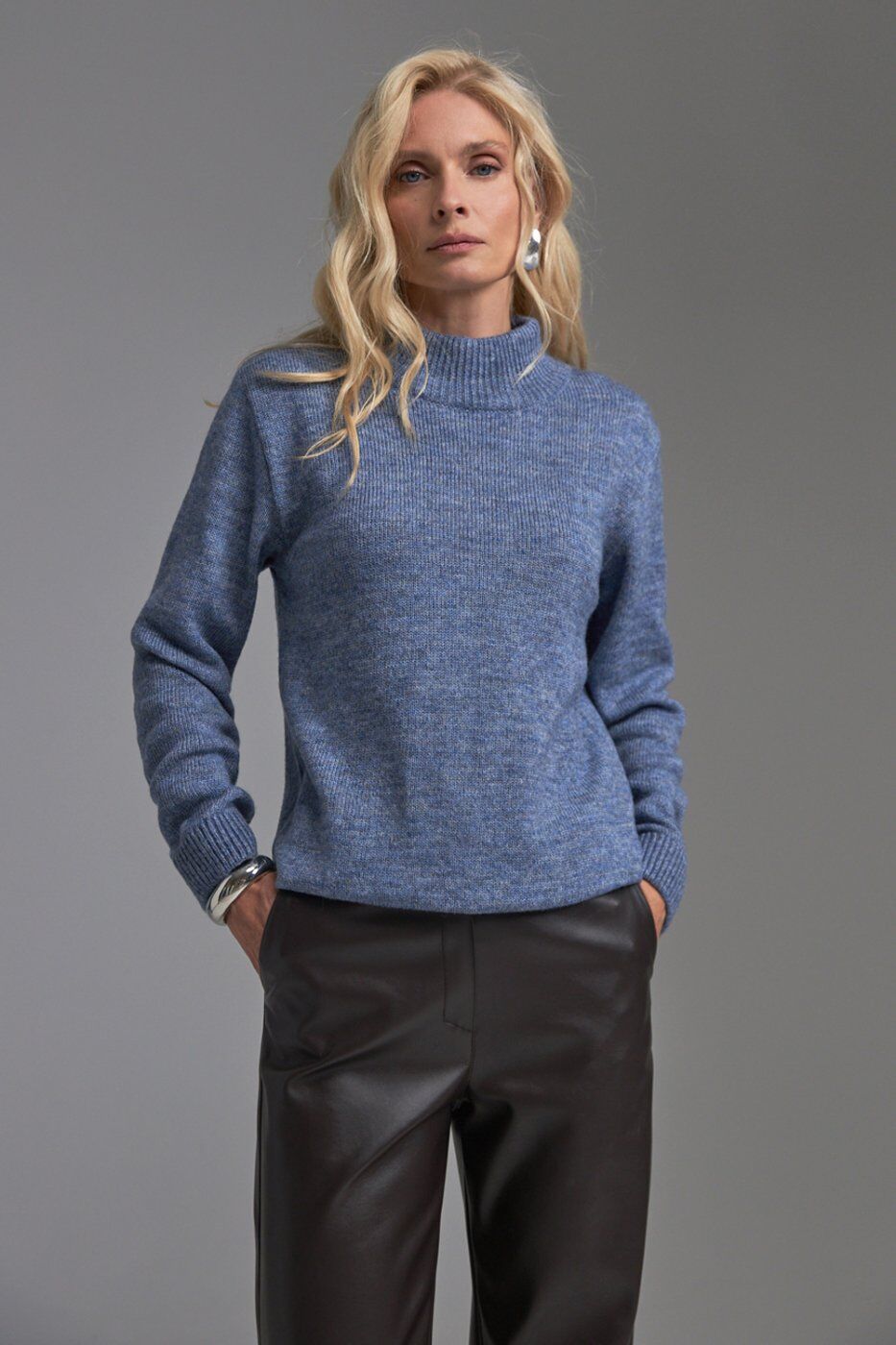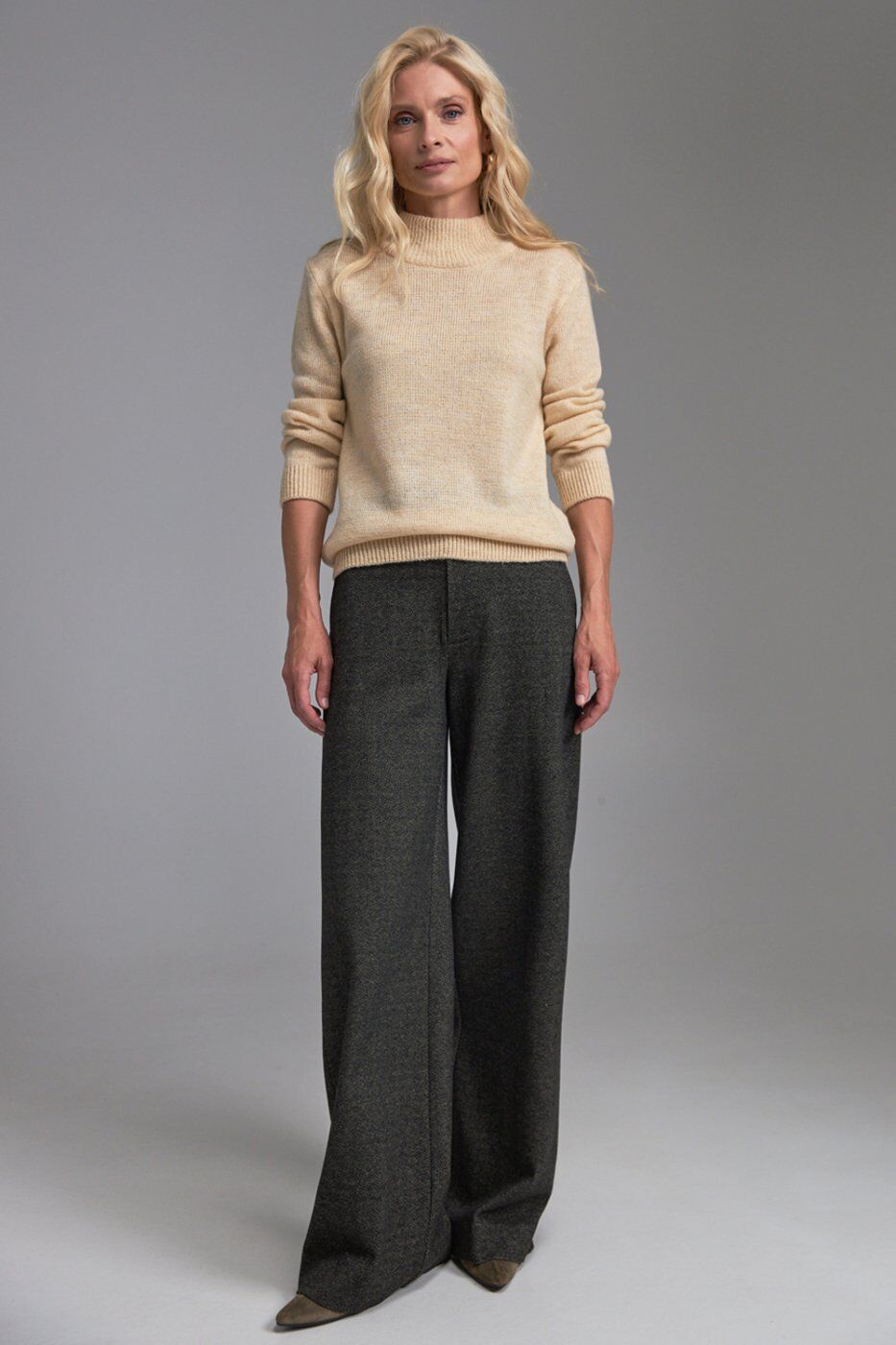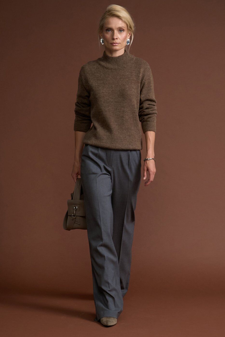 Вовняний светр із коміром-стійкою. Виріб вільного силуету зі спущеною лінією плеча. Виріб виконаний тонкою, гладкою в'язкою із преміальної пряжі, що містить вовну мериноса, альпаки та мохер.