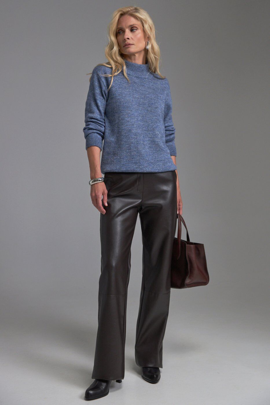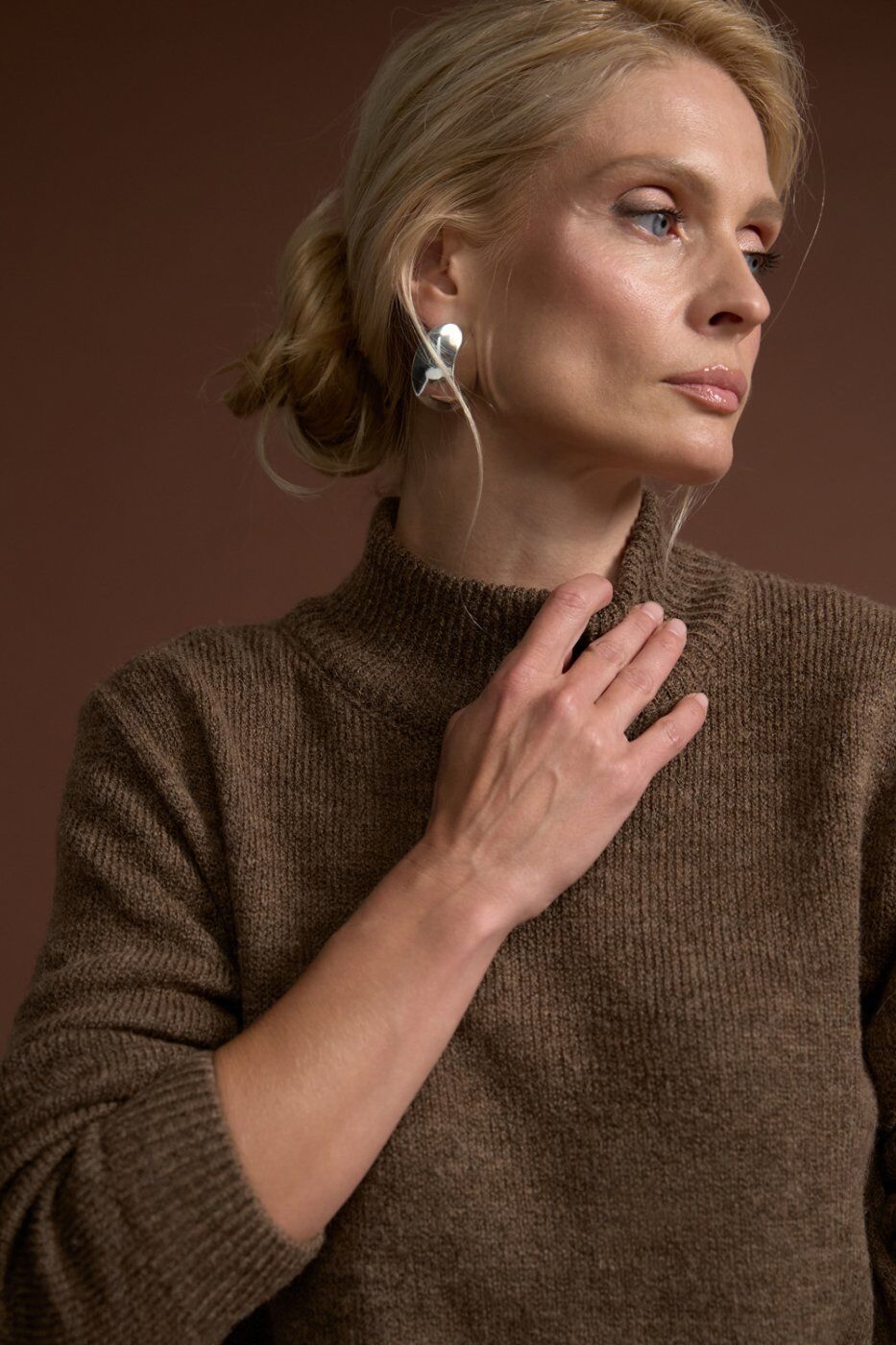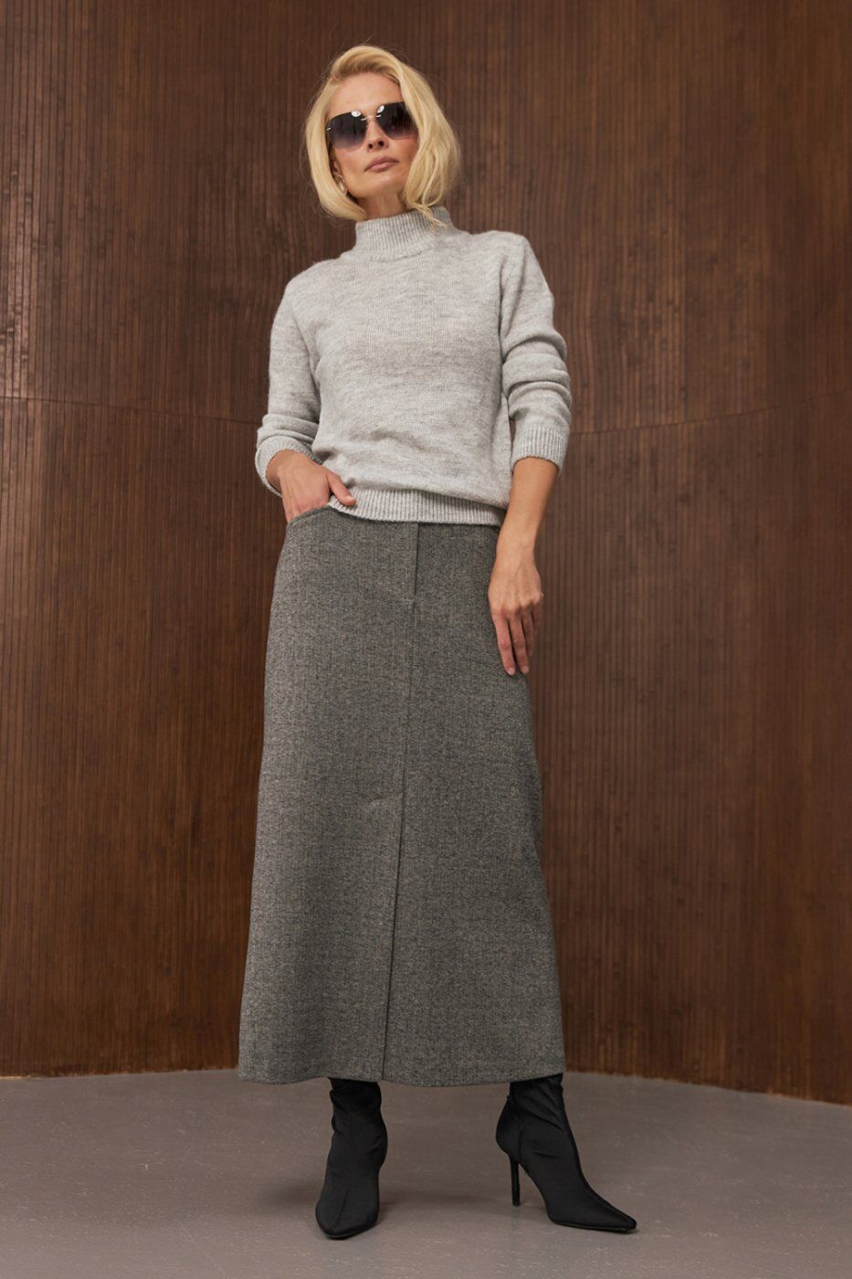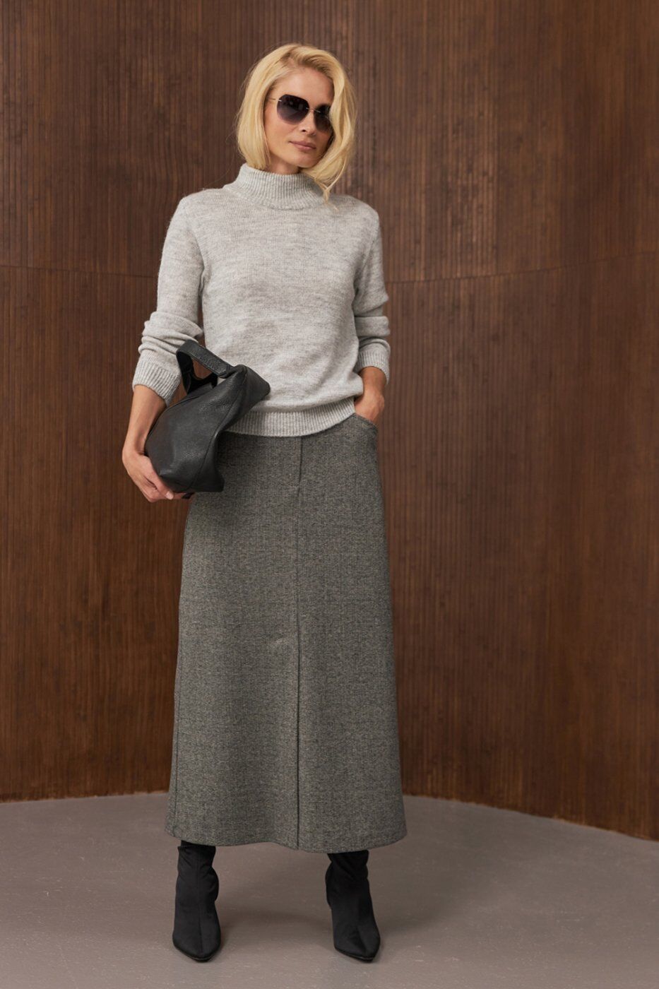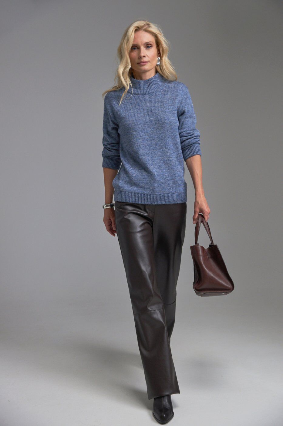Вовняний светр із коміром-стійкою. Виріб вільного силуету зі спущеною лінією плеча. Виріб виконаний тонкою, гладкою в'язкою із преміальної пряжі, що містить вовну мериноса, альпаки та мохер.